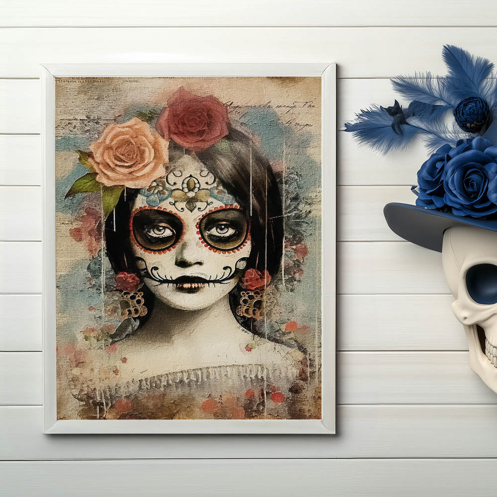 Celebrate the beauty and tradition of Día de los Muertos with this striking Sugar Skull Wall Art. Featuring a captivating Mexican Skull Art portrait of a woman with intricate Day of the Dead face paint, this piece is a perfect addition to your home or holiday decor. The soft vintage background blends seamlessly with the deep hues of red, beige, and black, creating a timeless Día de los Muertos Art Print.