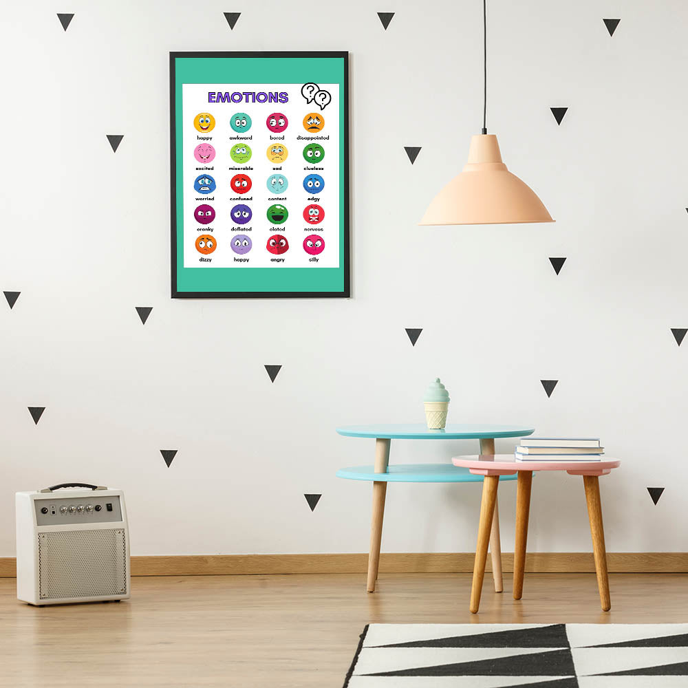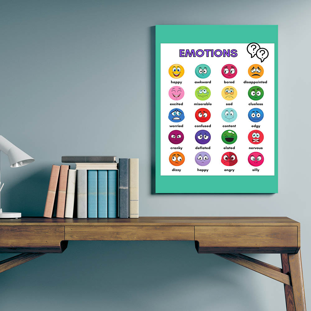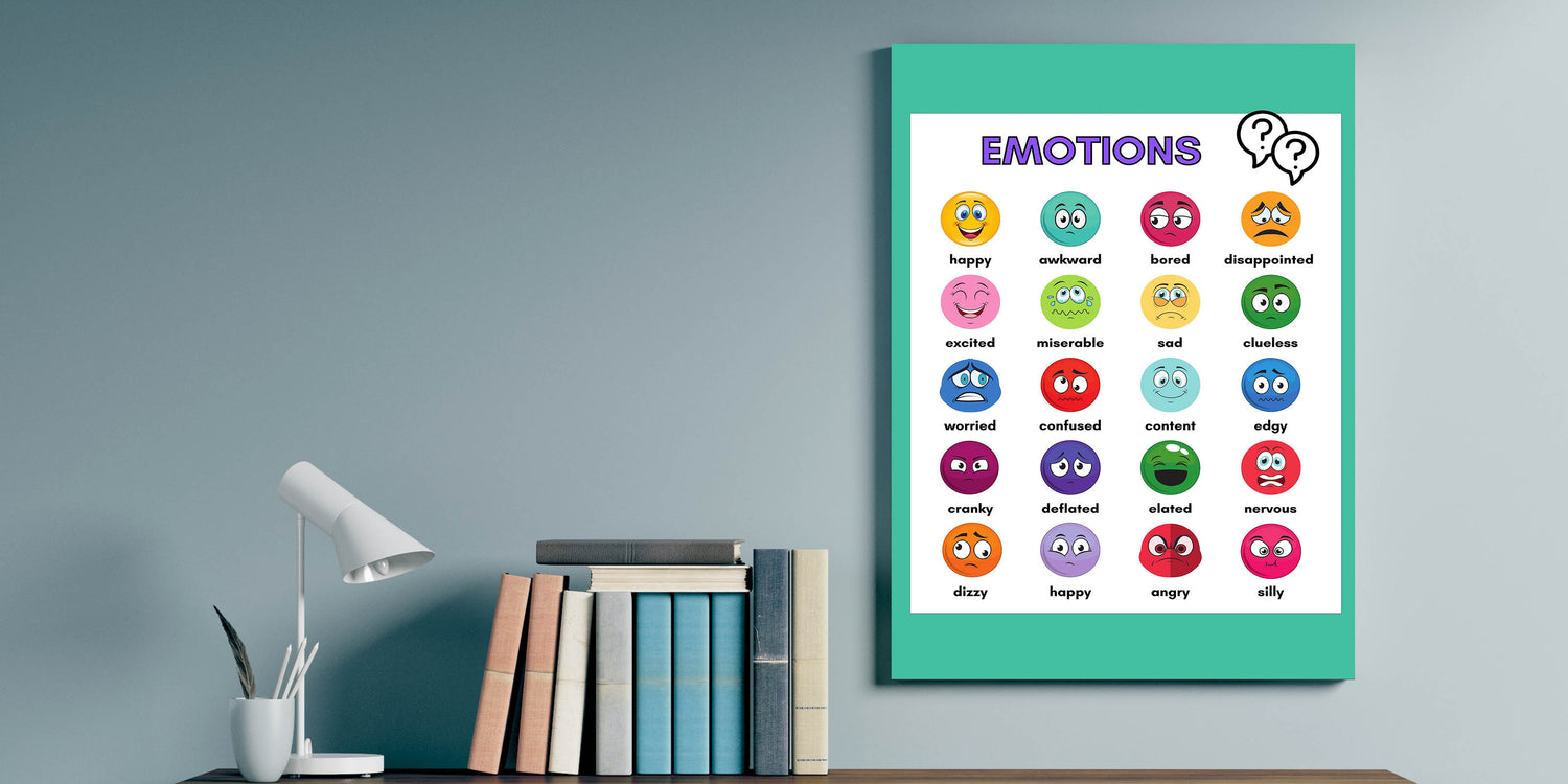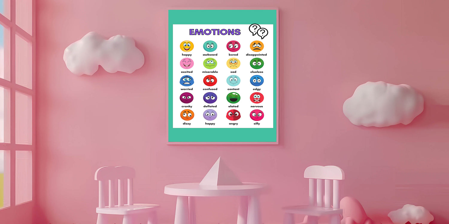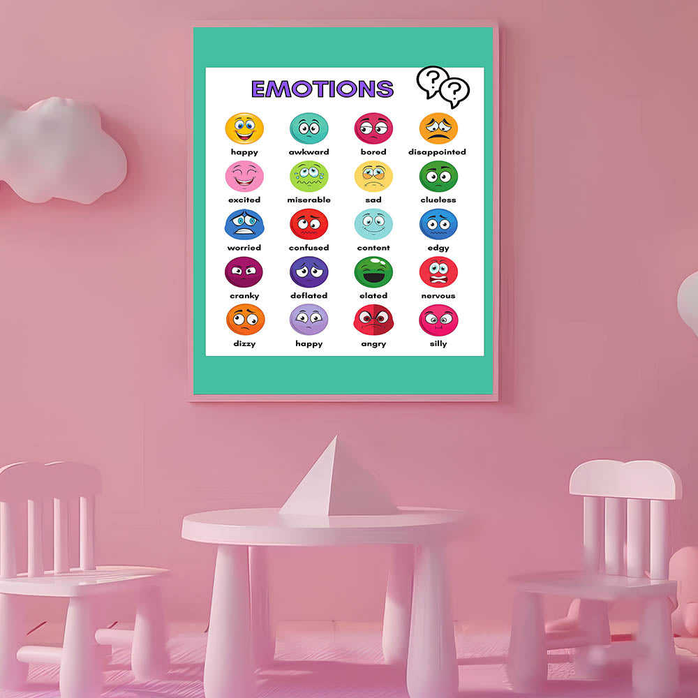 Help kids recognize and express their emotions with this Kids Educational Wall Art featuring an Emotions Chart with fun, expressive faces. This Children's Learning Art Print teaches young learners how to identify different feelings, making it an essential tool for emotional development. Ideal for nurseries, playrooms, and classrooms, this Educational Nursery Wall Decor fosters social-emotional learning in an engaging way.