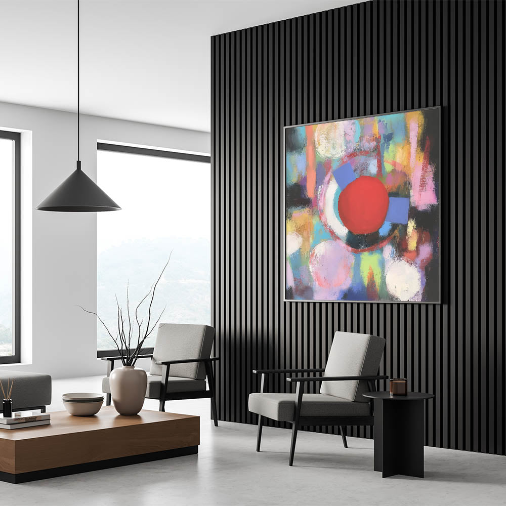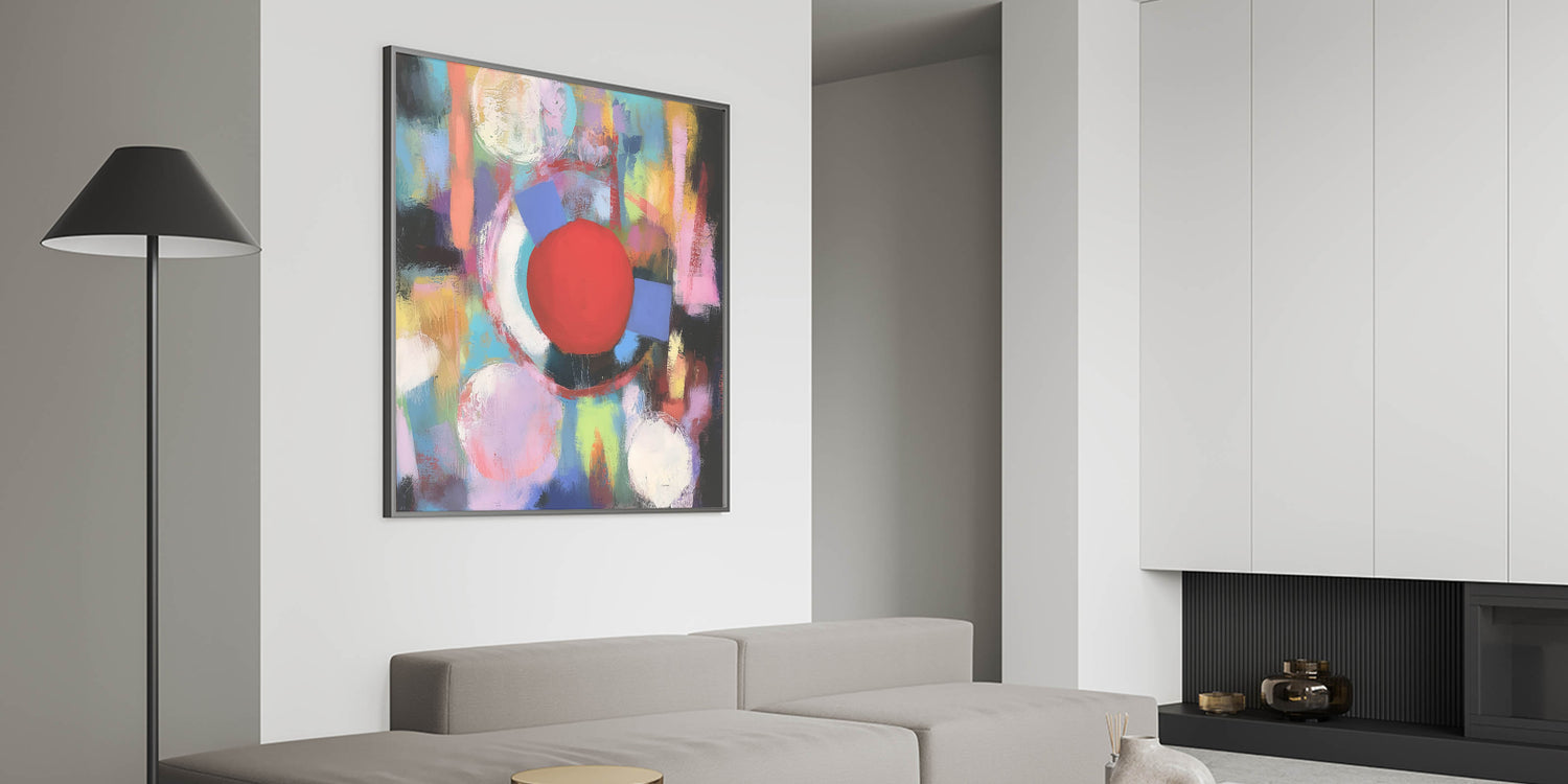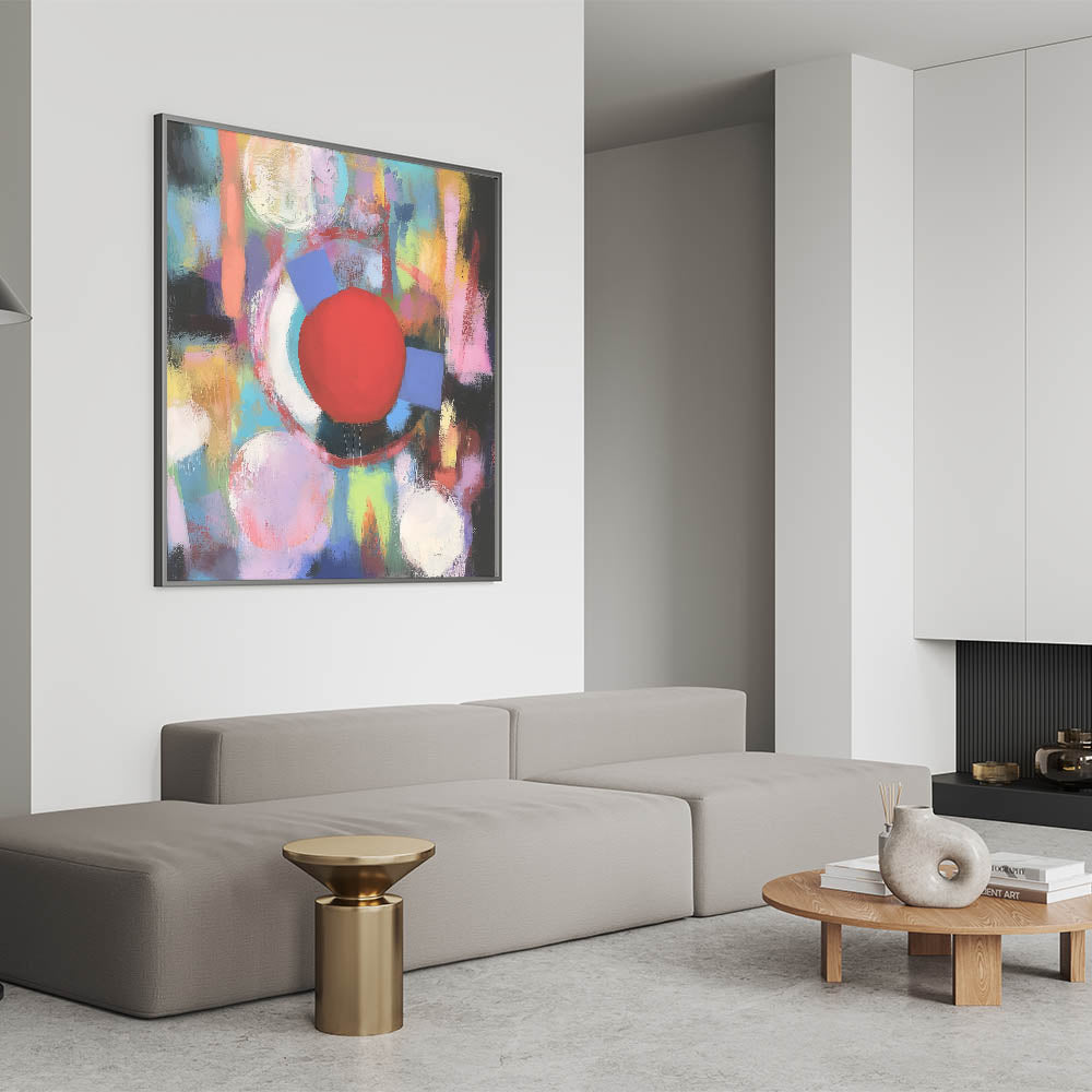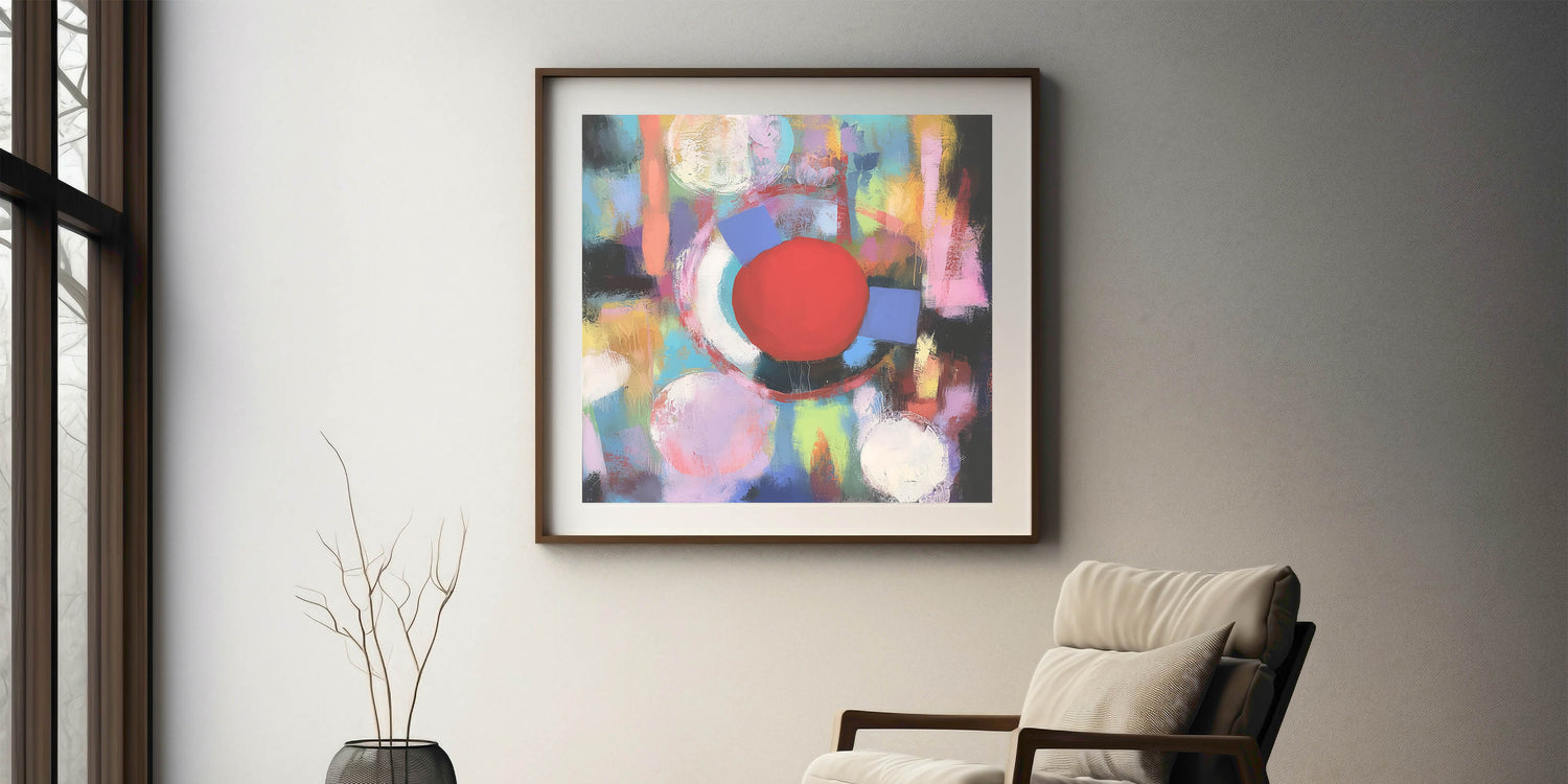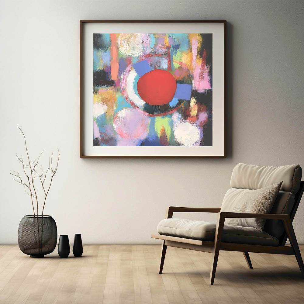 Add a burst of energy to your decor with this Geometric Abstract Wall Art, featuring a striking red circle amidst pastel hues of pink, blue, yellow, and green. The vibrant composition combines fluid brushstrokes and geometric shapes, creating a dynamic and lively design. Perfect for modern, eclectic, or artistic interiors, this piece brings warmth, creativity, and a sense of playfulness to living rooms, offices, or creative spaces.