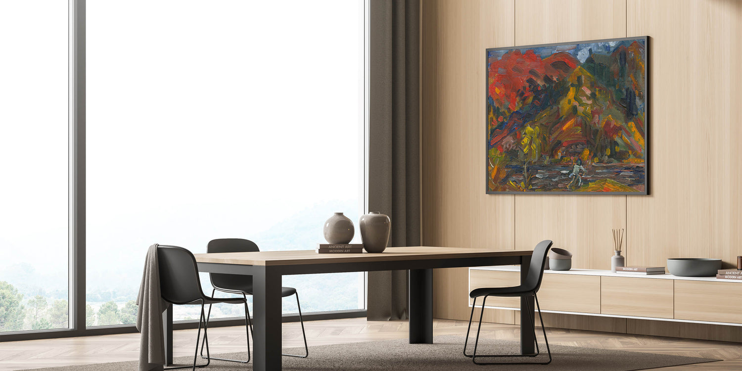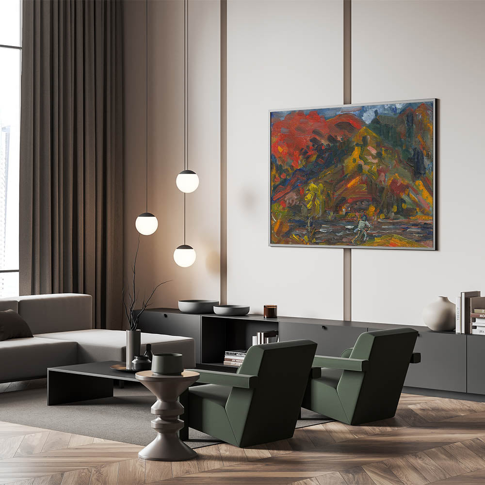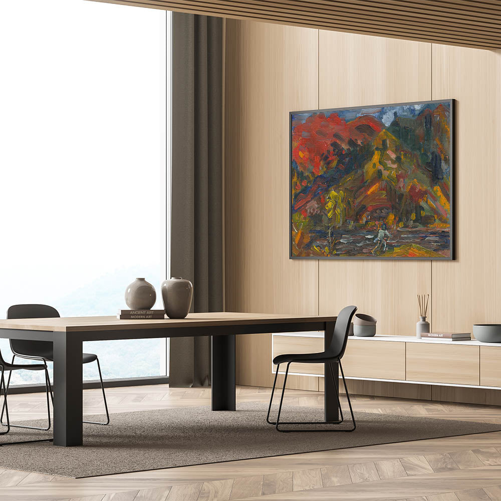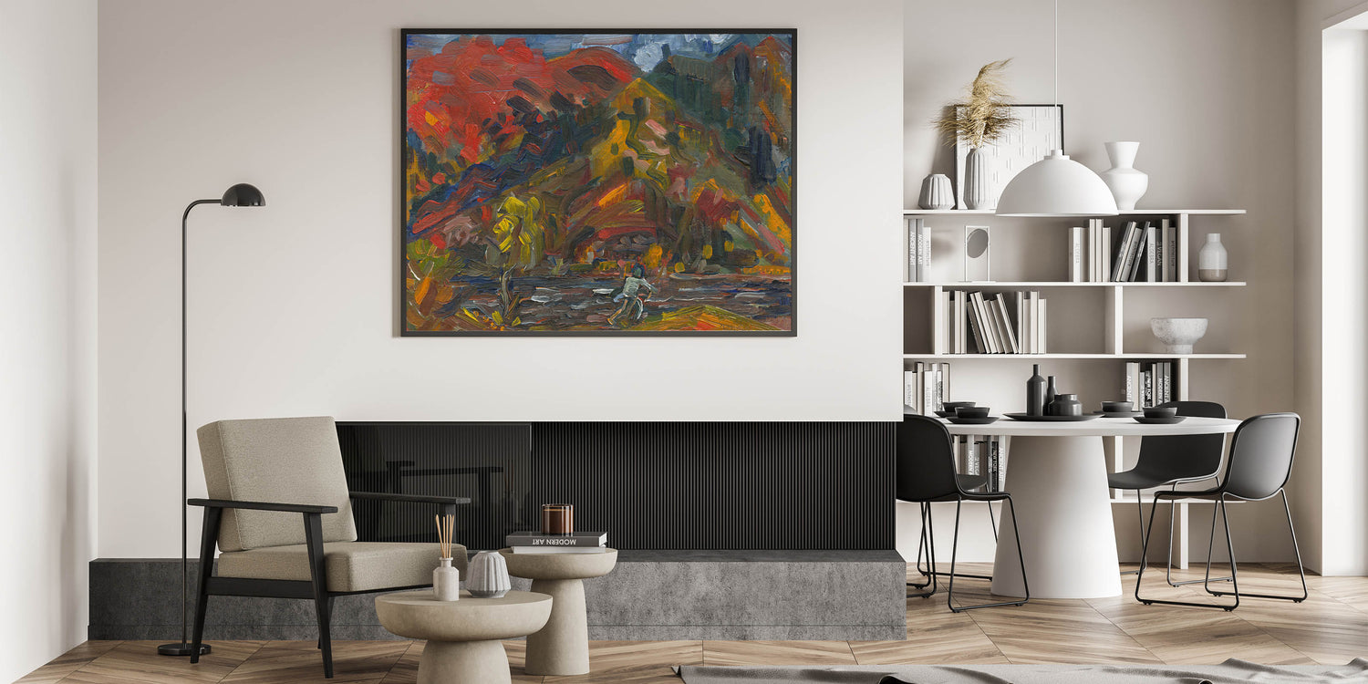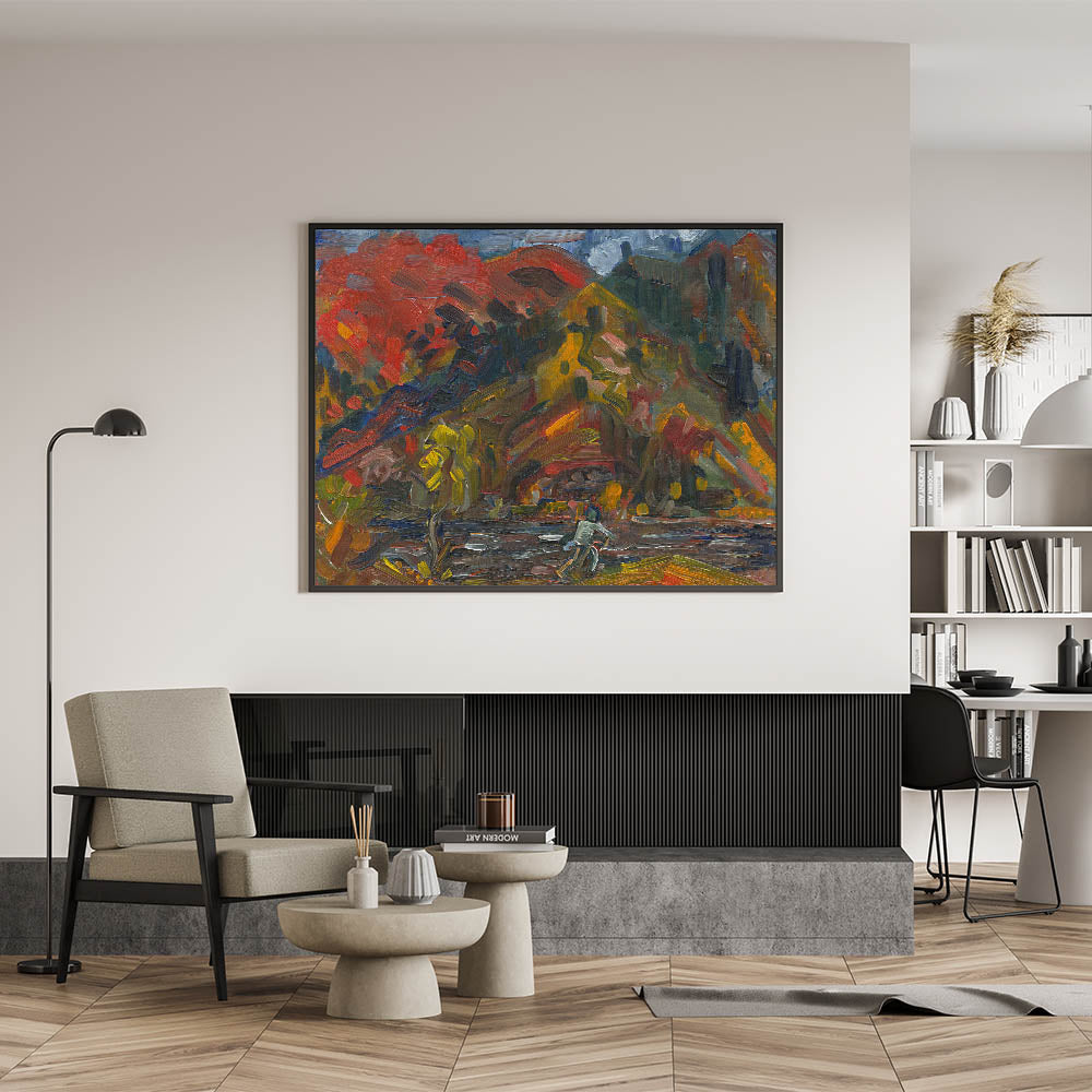 Bring the vibrancy of Expressionist art into your space with Arnold Peter Weisz-Kubínčan's "Man on the River Bank." This dynamic artwork captures a dramatic landscape of bold, fiery red mountains and lush greenery, framing a lone figure standing by the riverbank. The textured brushstrokes and intense colors evoke a powerful connection to nature and the human experience within it.