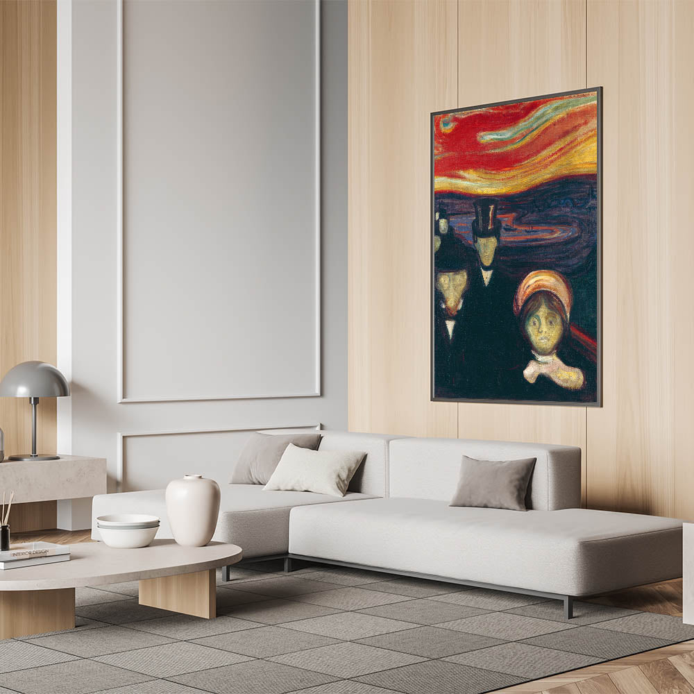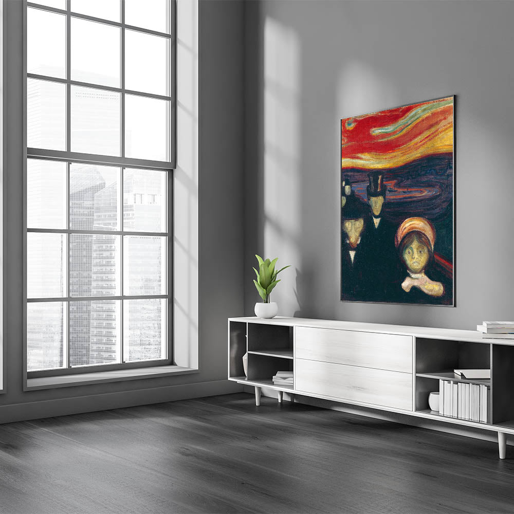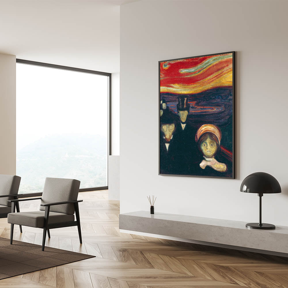 Elevate your living space with the evocative beauty of Abstract Expressionism through Edvard Munch's "Anxiety." This vibrant Expressionism painting portrays raw human emotion and tension, set against a surreal, fiery sky. The bold use of reds, oranges, and dark tones makes this colorful Expressionist artwork a centerpiece for any room, blending dramatic intensity with modern elegance.