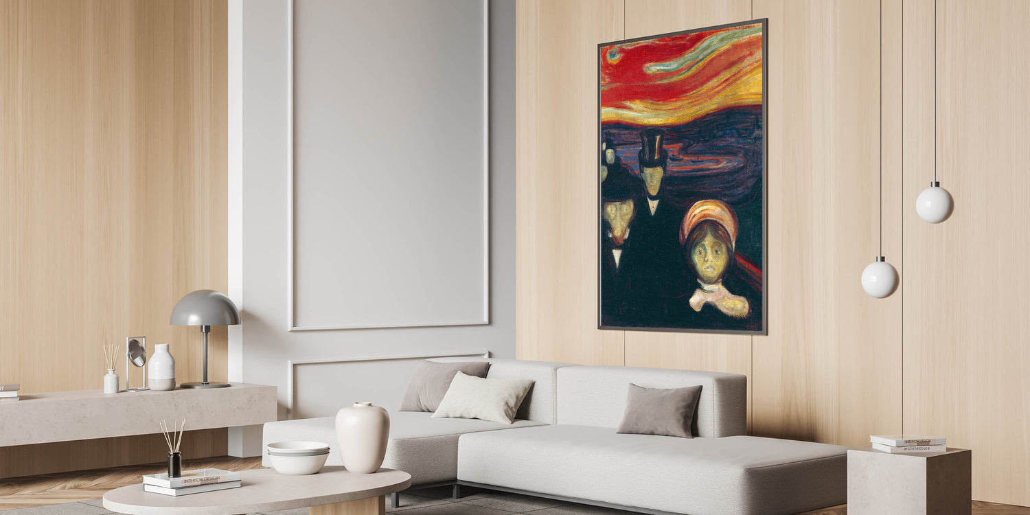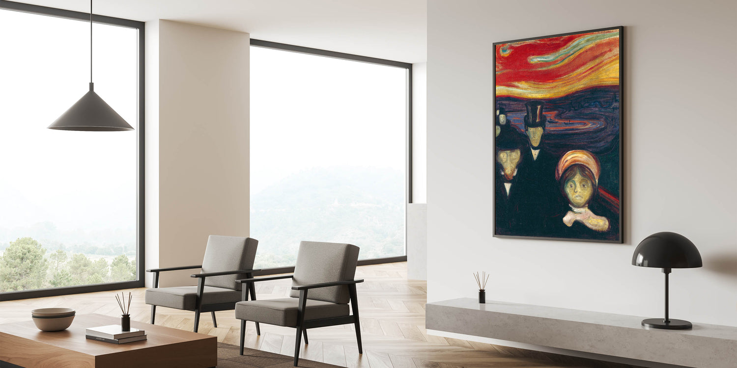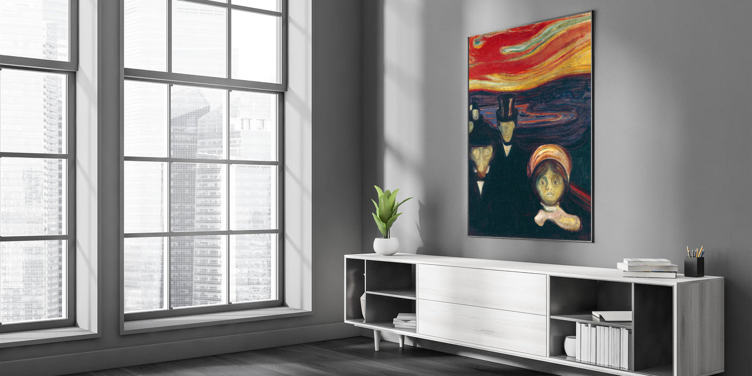 Elevate your living space with the evocative beauty of Abstract Expressionism through Edvard Munch's "Anxiety." This vibrant Expressionism painting portrays raw human emotion and tension, set against a surreal, fiery sky. The bold use of reds, oranges, and dark tones makes this colorful Expressionist artwork a centerpiece for any room, blending dramatic intensity with modern elegance.