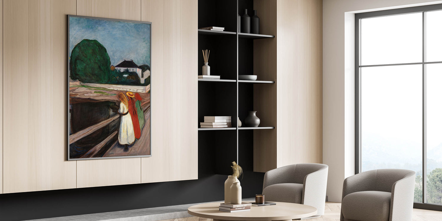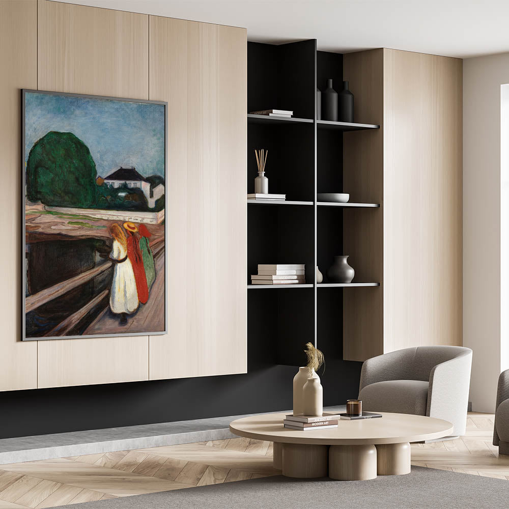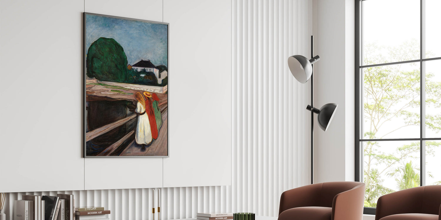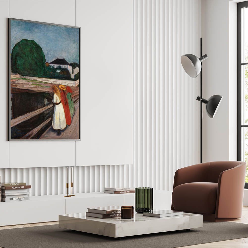 Add an air of elegance and introspection to your decor with Edvard Munch's The Girls on the Bridge. This timeless piece of Expressionist art captures a serene moment as three figures gaze over the water, surrounded by vibrant greenery and soft evening light. The artwork’s emotional depth and harmonious composition make it a masterpiece of modern Expressionism, perfect for enhancing any living space or gallery wall.