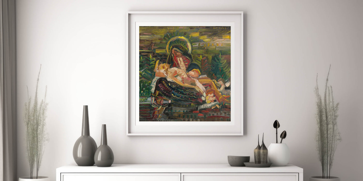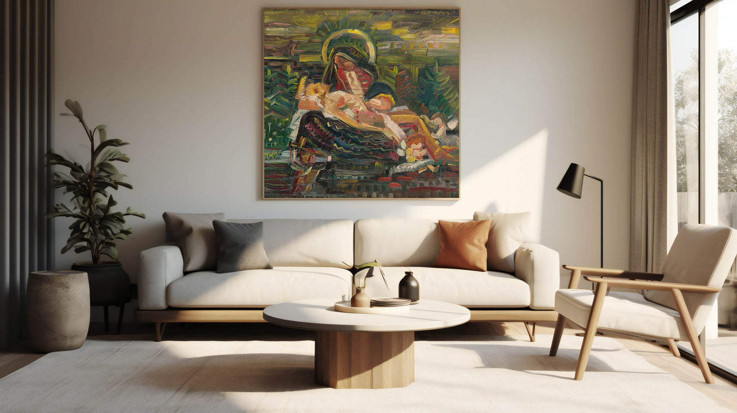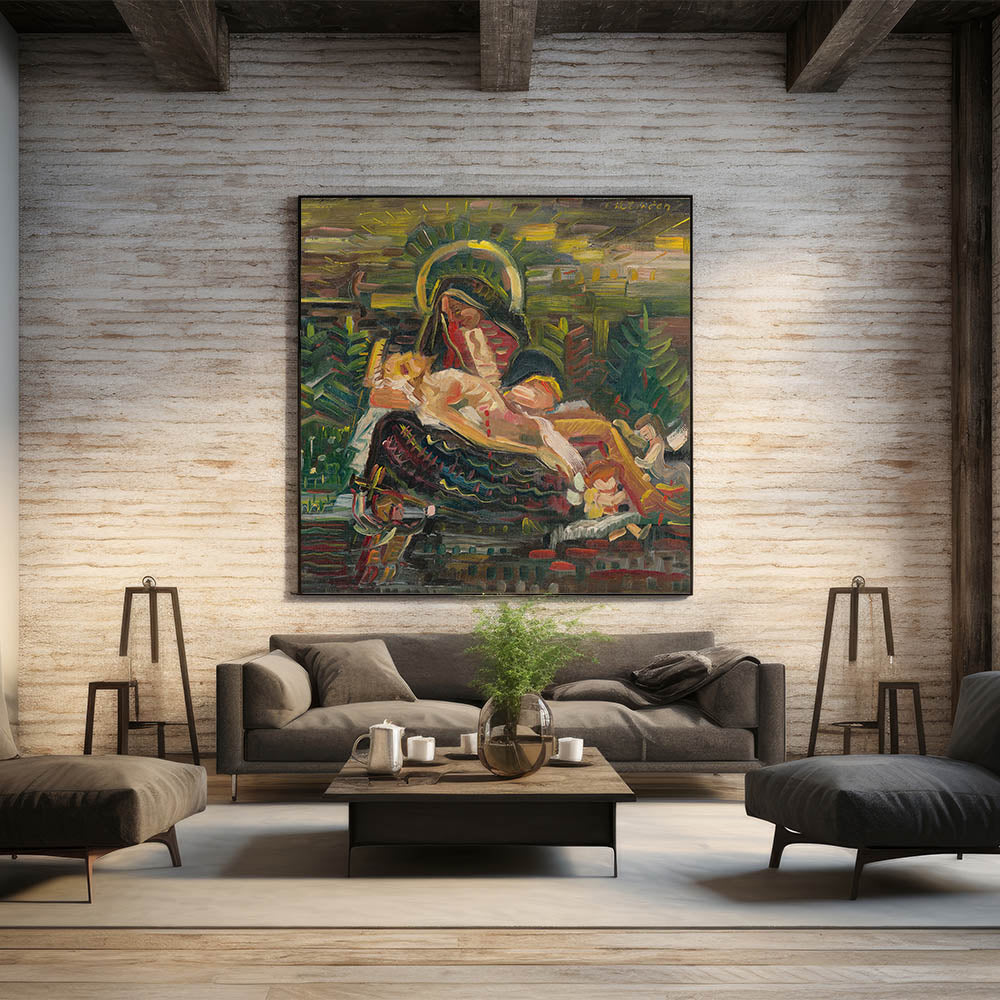 Add emotional depth and vibrant expression to your home with this Vibrant Expressionism Painting, a striking representation of the Pietà in the style of Abstract Expressionism. The dynamic brushwork and intense colors convey a powerful narrative, capturing a poignant moment of human emotion. Ideal for collectors of Expressionist Art for Sale, this piece brings a dramatic presence to any modern interior.
