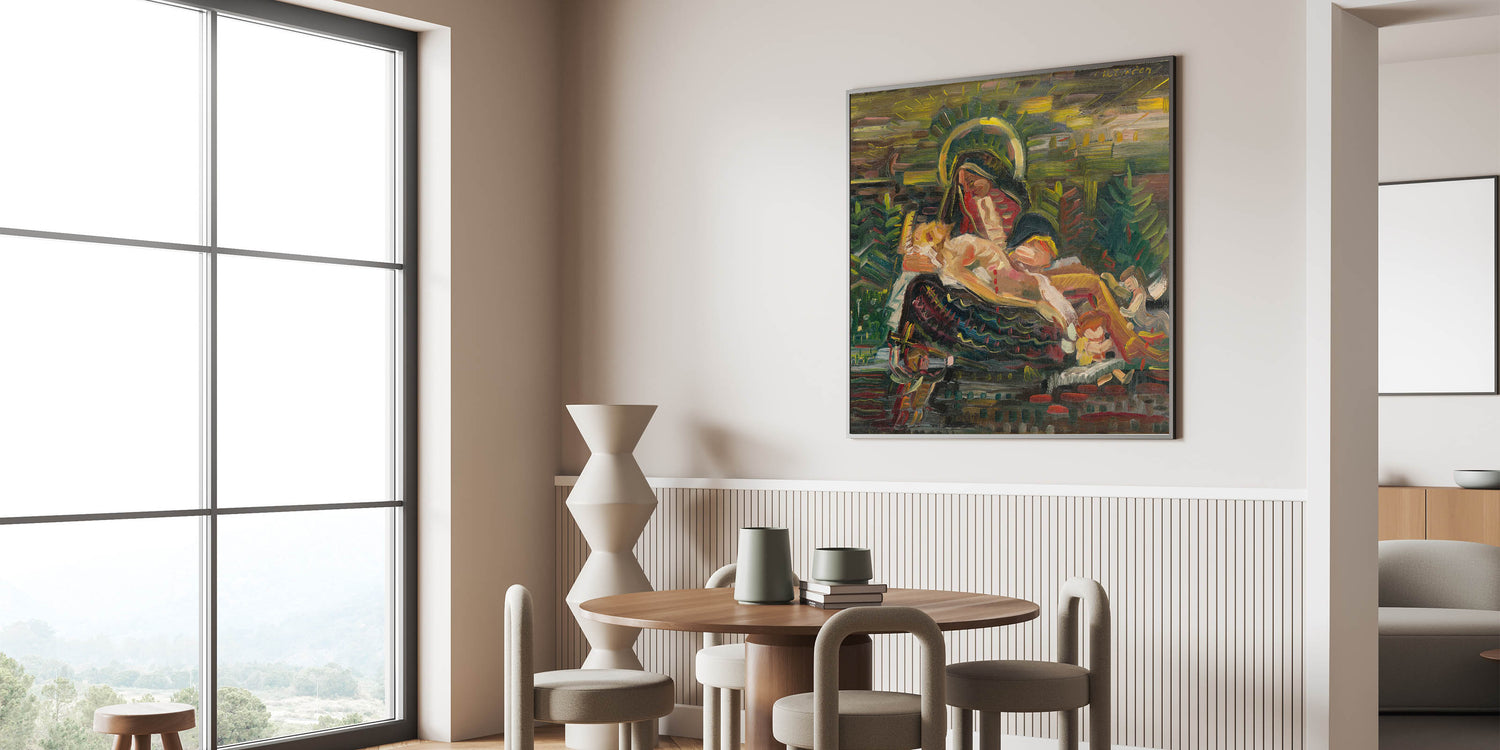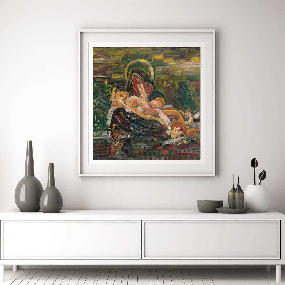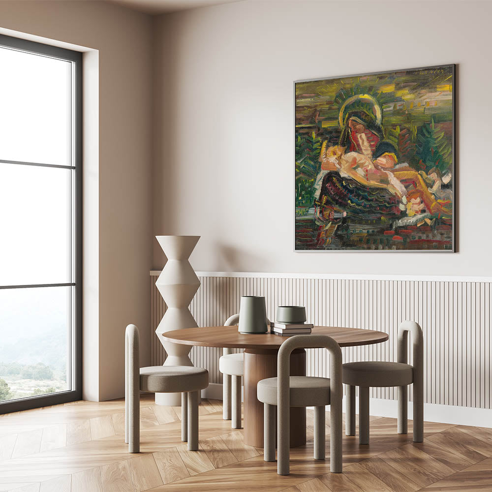 Add emotional depth and vibrant expression to your home with this Vibrant Expressionism Painting, a striking representation of the Pietà in the style of Abstract Expressionism. The dynamic brushwork and intense colors convey a powerful narrative, capturing a poignant moment of human emotion. Ideal for collectors of Expressionist Art for Sale, this piece brings a dramatic presence to any modern interior.