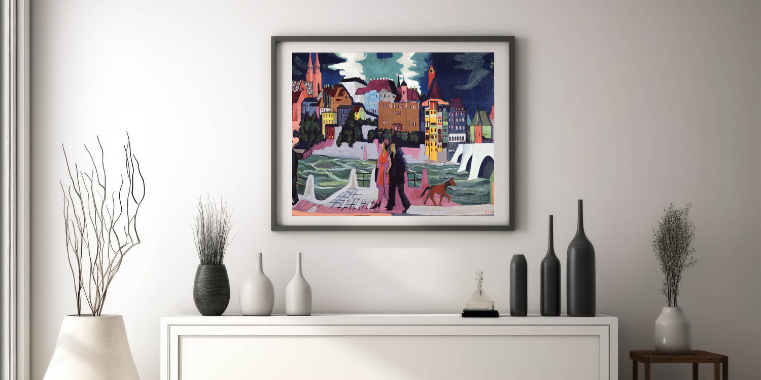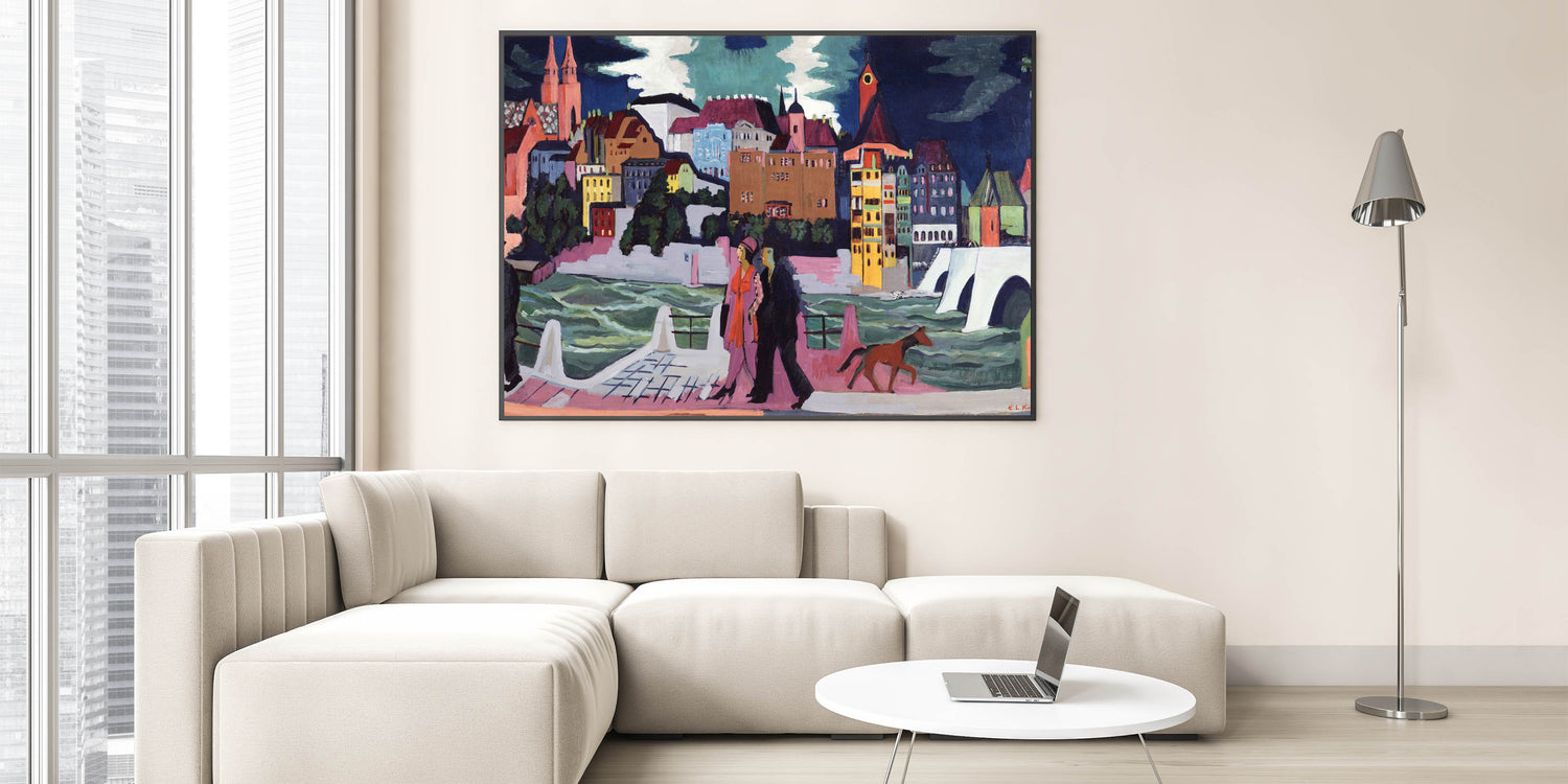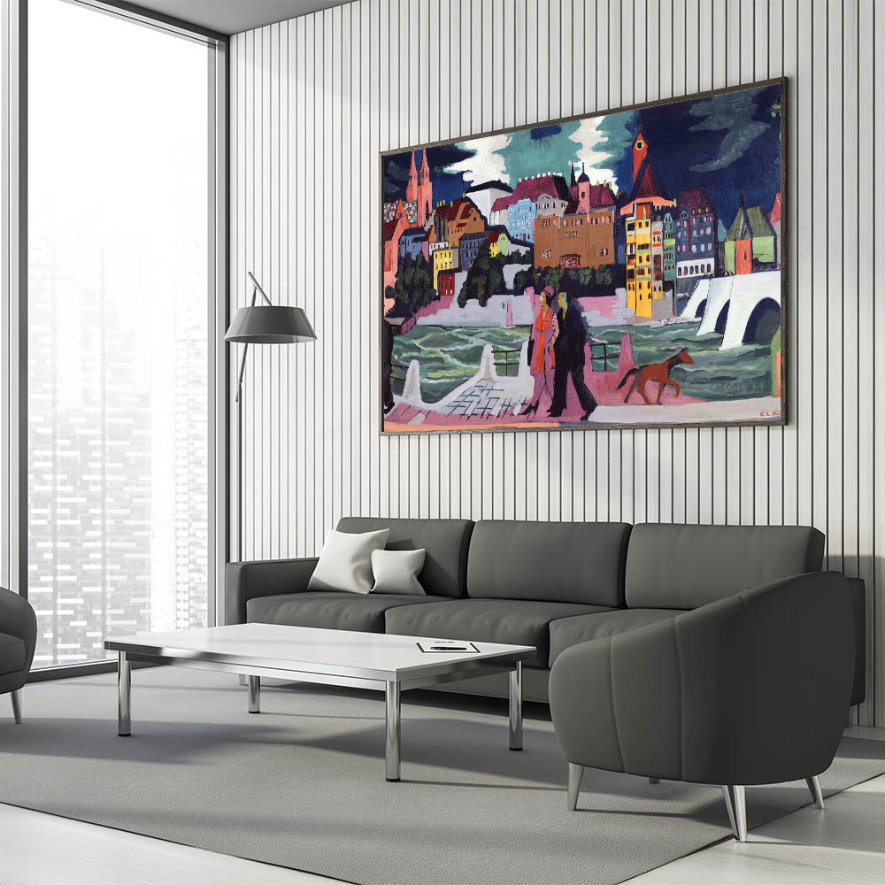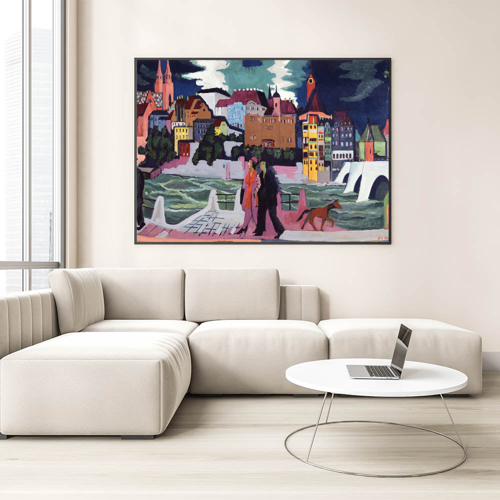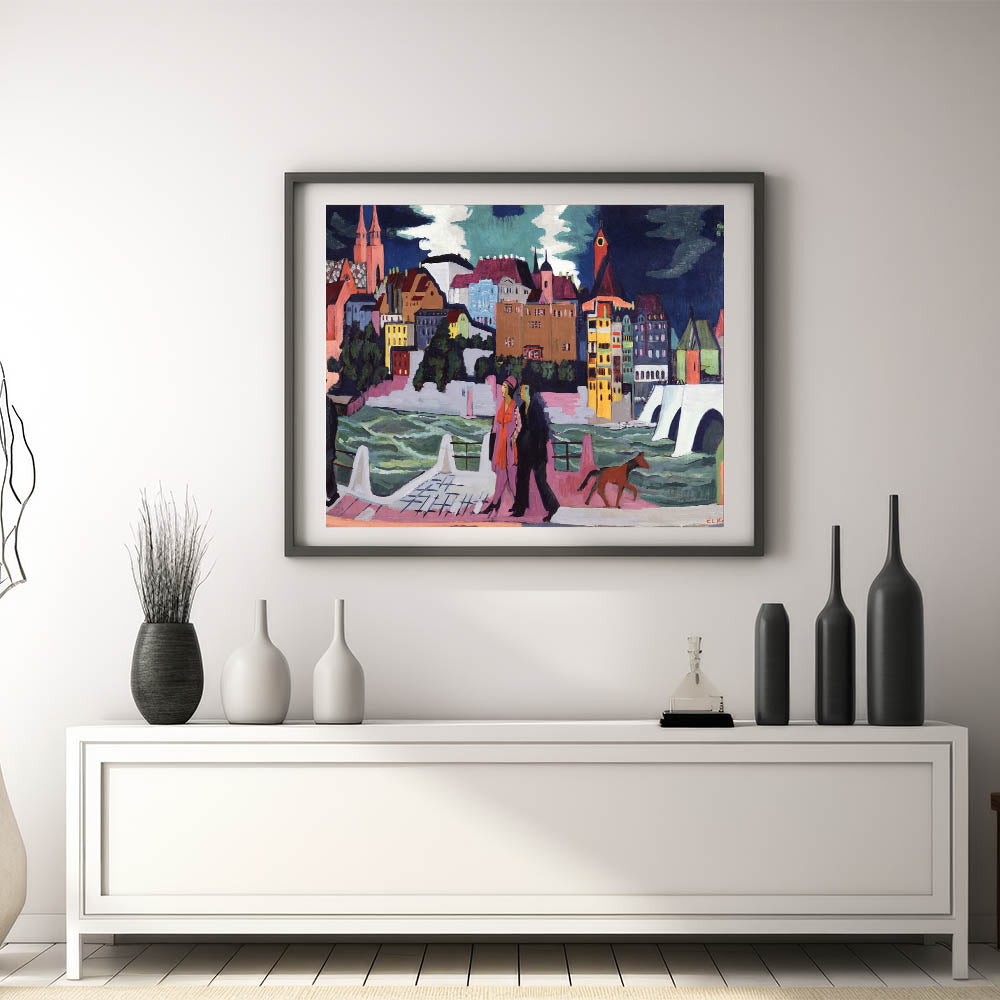 Immerse yourself in the vibrant world of Expressionism with Ernst Ludwig Kirchner's View of Basel and the Rhine. This dynamic cityscape features bold architectural forms, a dramatic color palette of reds, blues, and greens, and fluid brushstrokes that capture the bustling energy of Basel's iconic landmarks. The interplay between the figures, the bridge, and the river creates a sense of movement and depth, making this artwork a statement piece for any modern or eclectic space.