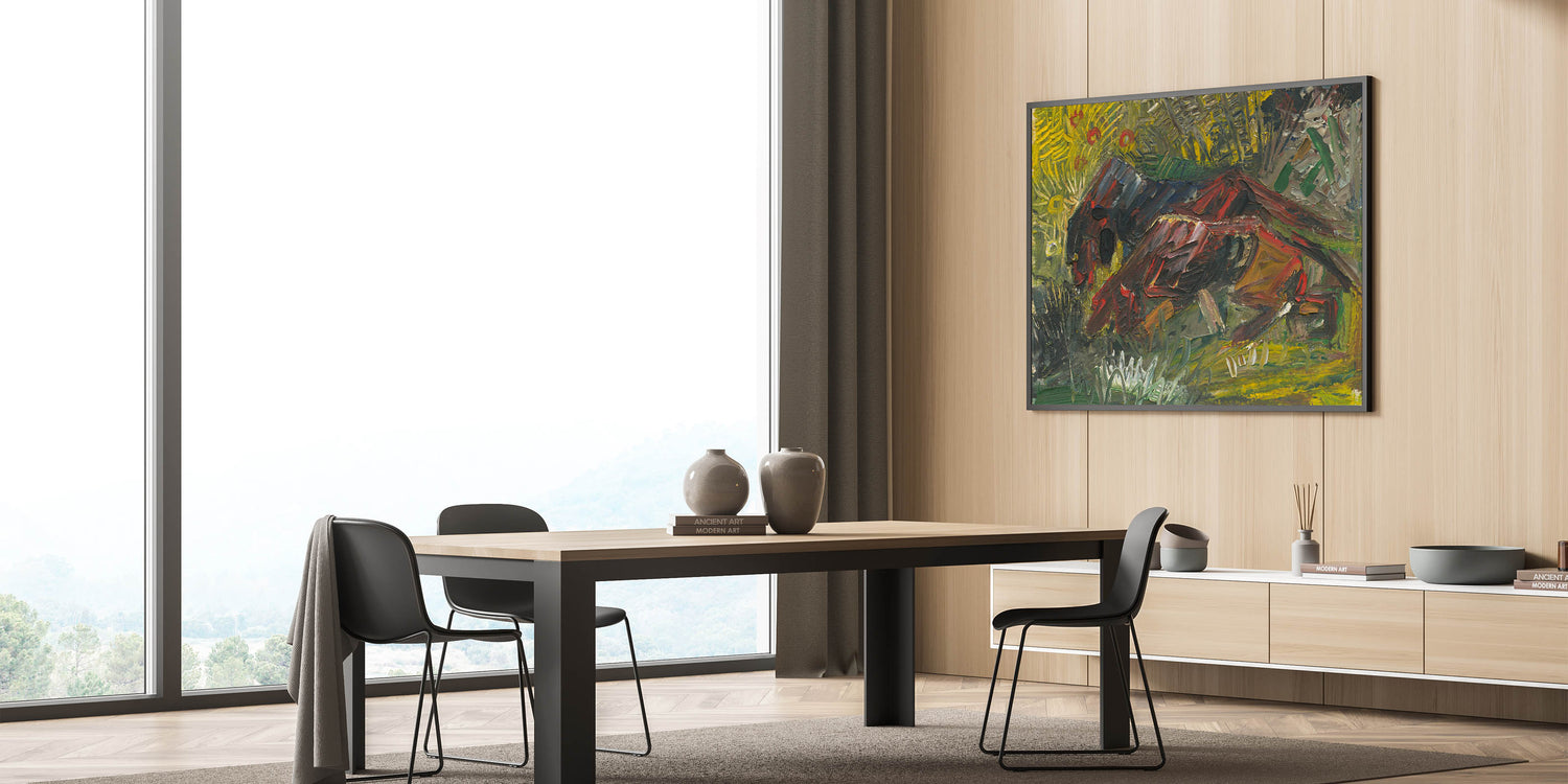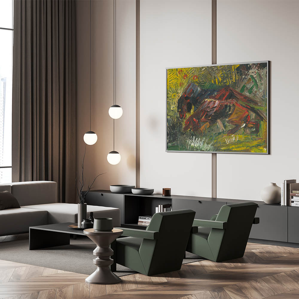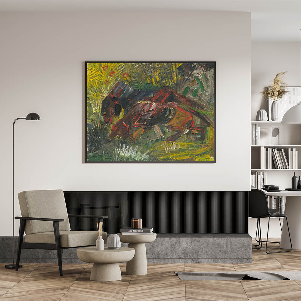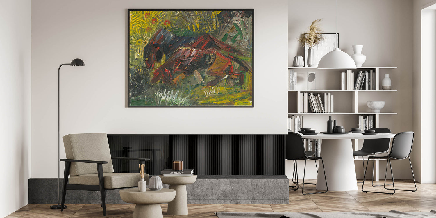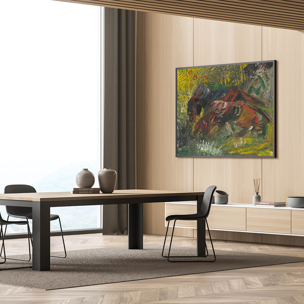 Add the bold energy of "Hunting Dogs" to your space and experience the captivating artistry of Expressionism. This piece transforms any room into a vibrant celebration of creativity and motion.