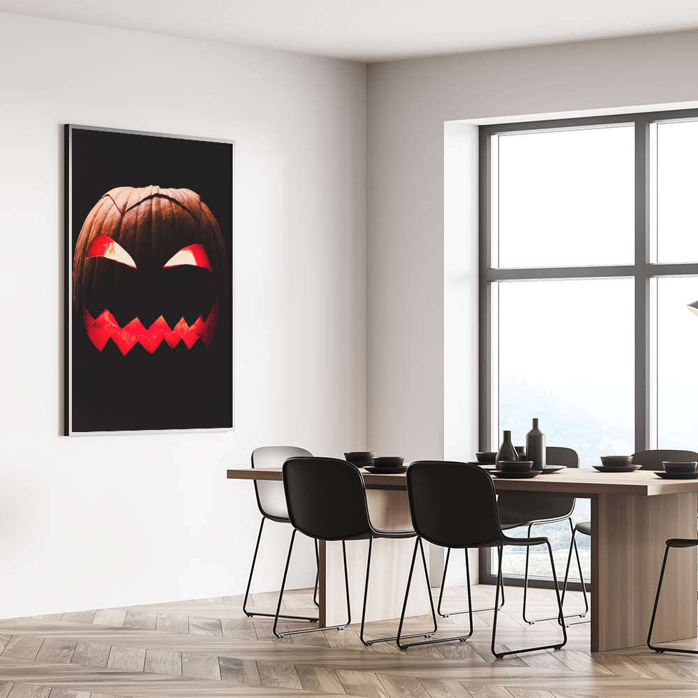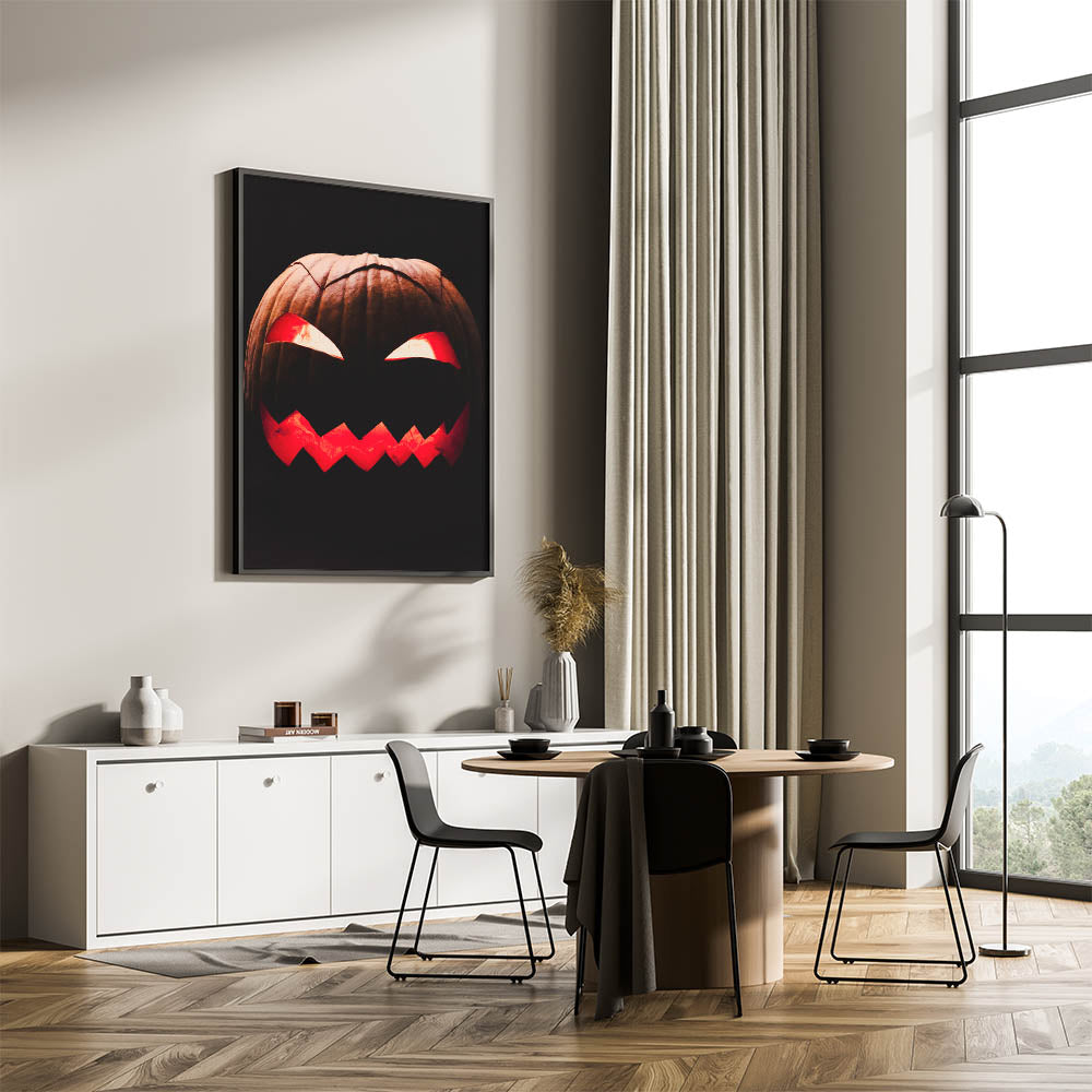 Embrace the spooky charm of the season with this fall wall decor, featuring a hauntingly glowing jack-o'-lantern set against a pitch-black background. The bold red and deep black hues create a dramatic and mysterious atmosphere, making this autumn wall art the perfect addition to Halloween-themed interiors. Whether you're decorating for a haunted house vibe or simply love the eerie magic of October nights, this fall canvas art makes a striking statement.