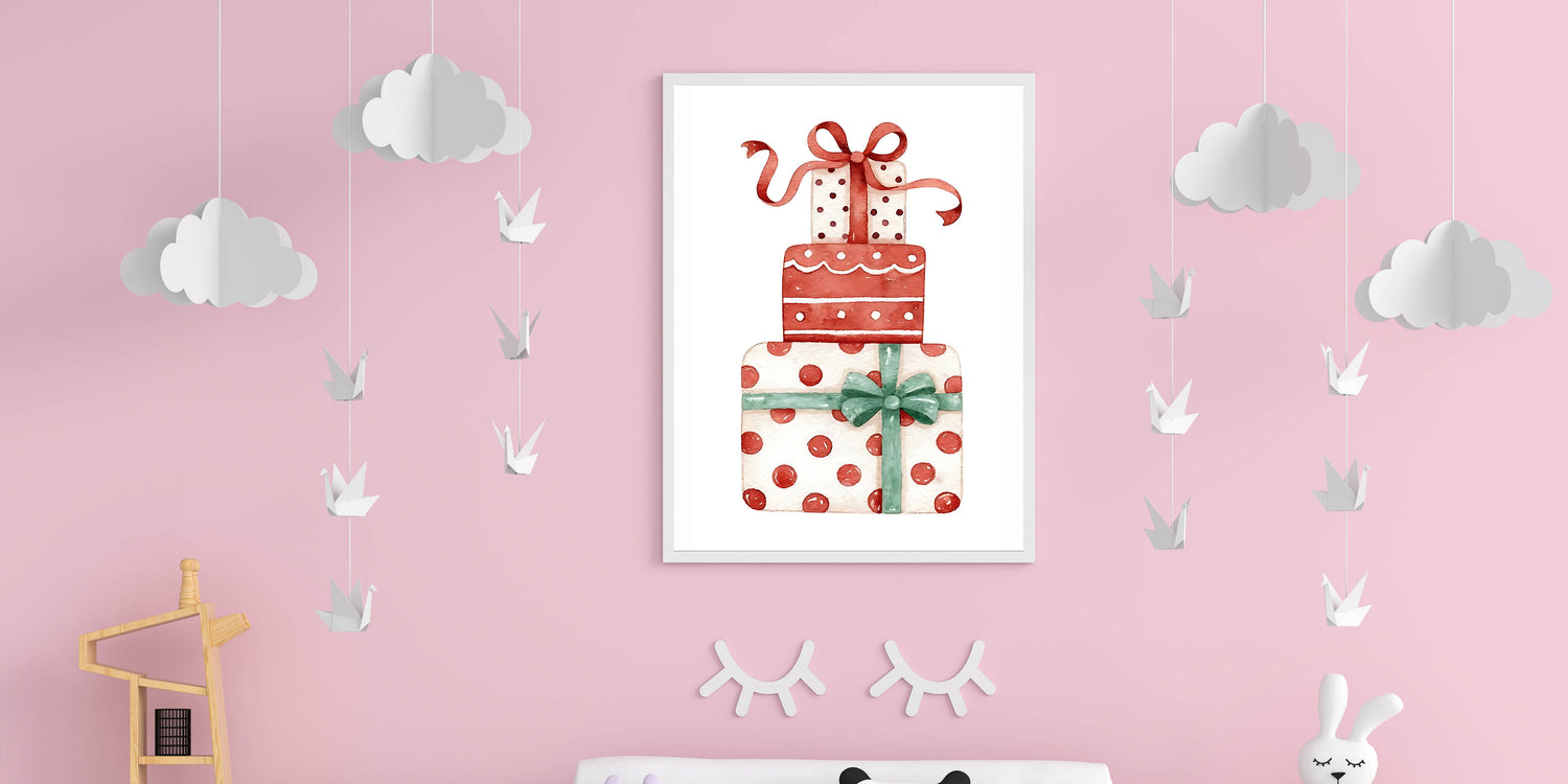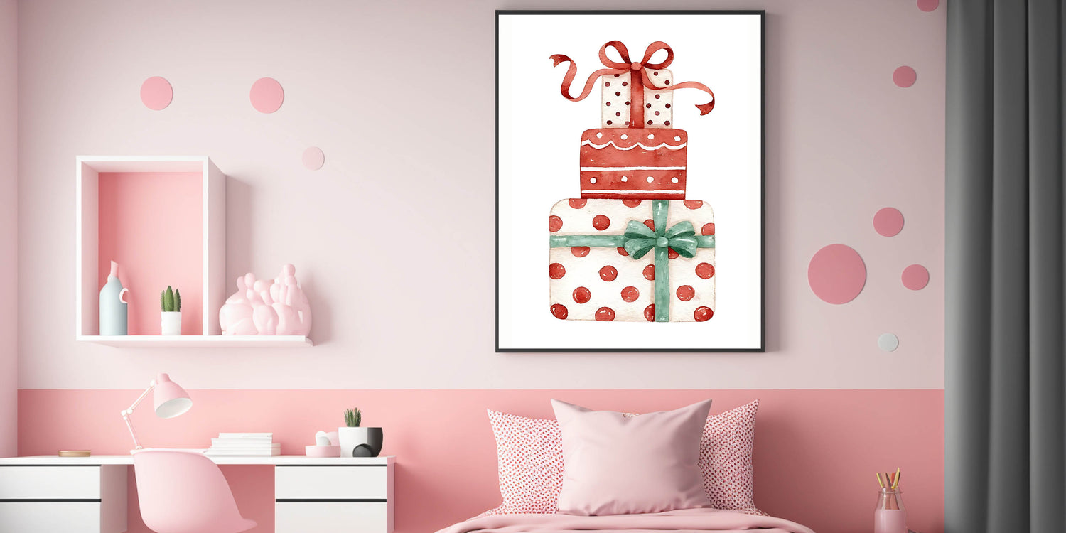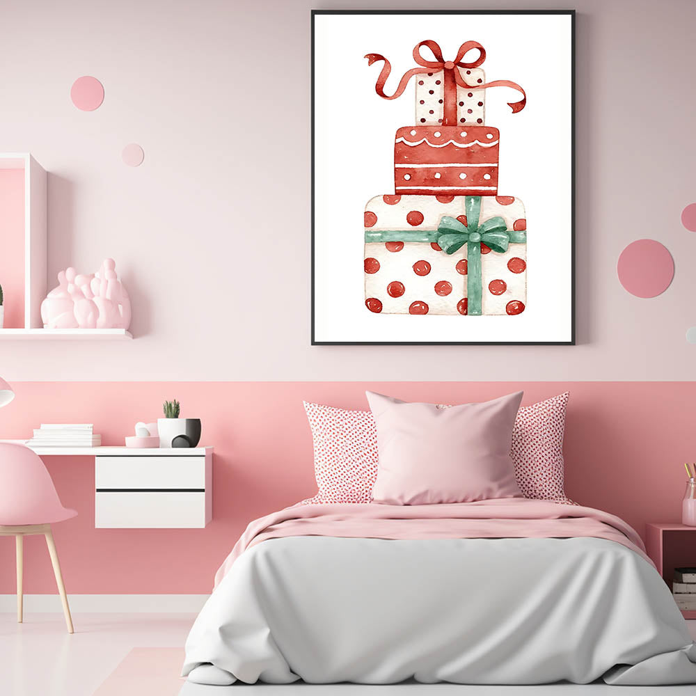 Add a touch of joy and whimsy to your child’s space with this Girls Room Wall Art featuring a beautifully illustrated stack of festive gift boxes. The soft watercolor style, combined with a charming red and green color palette, makes this piece a perfect addition to a nursery, kids’ bedroom, or playroom. Whether for a holiday-inspired look or a year-round celebration of fun and imagination, this artwork brings warmth and excitement to any space.