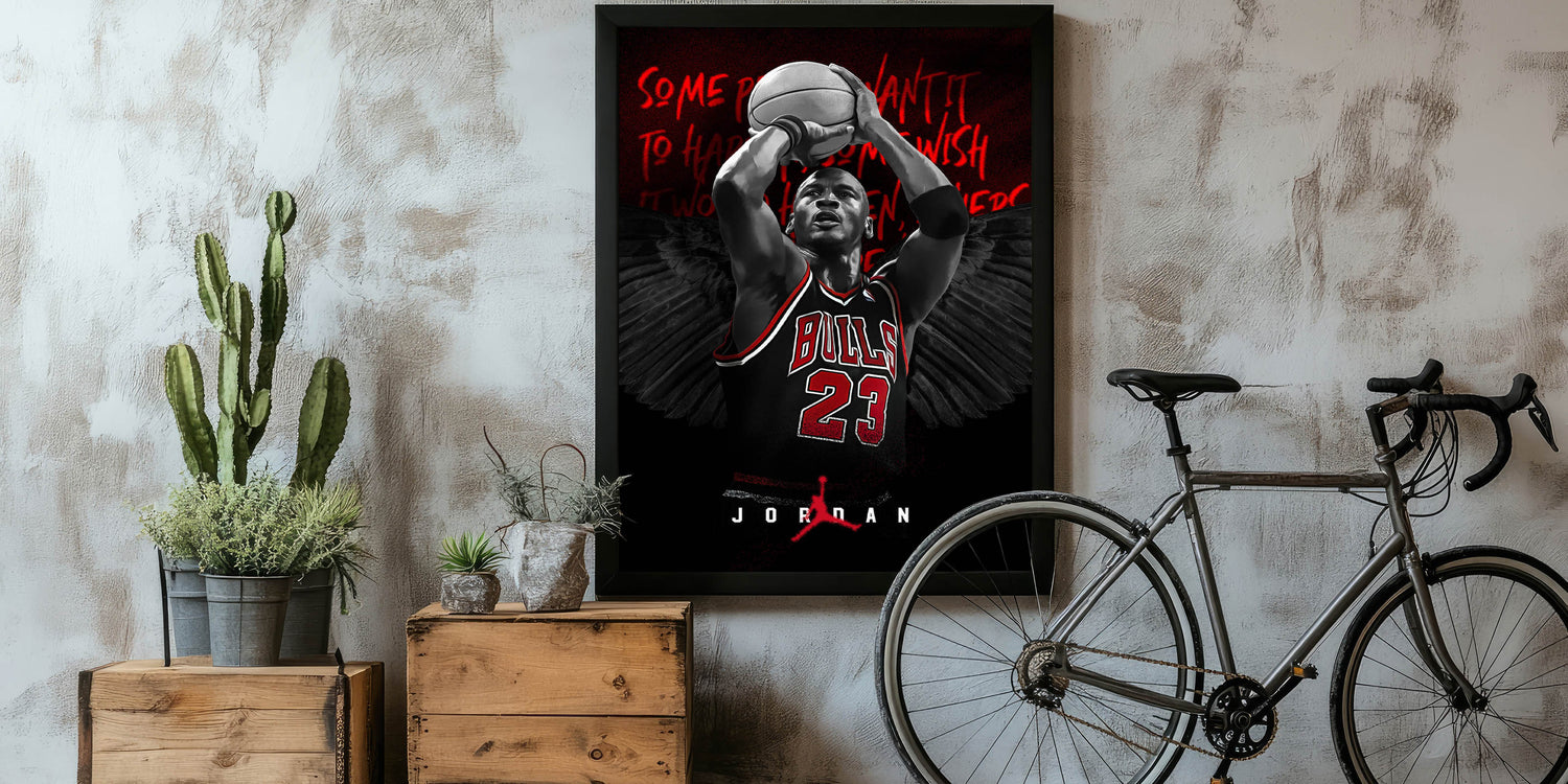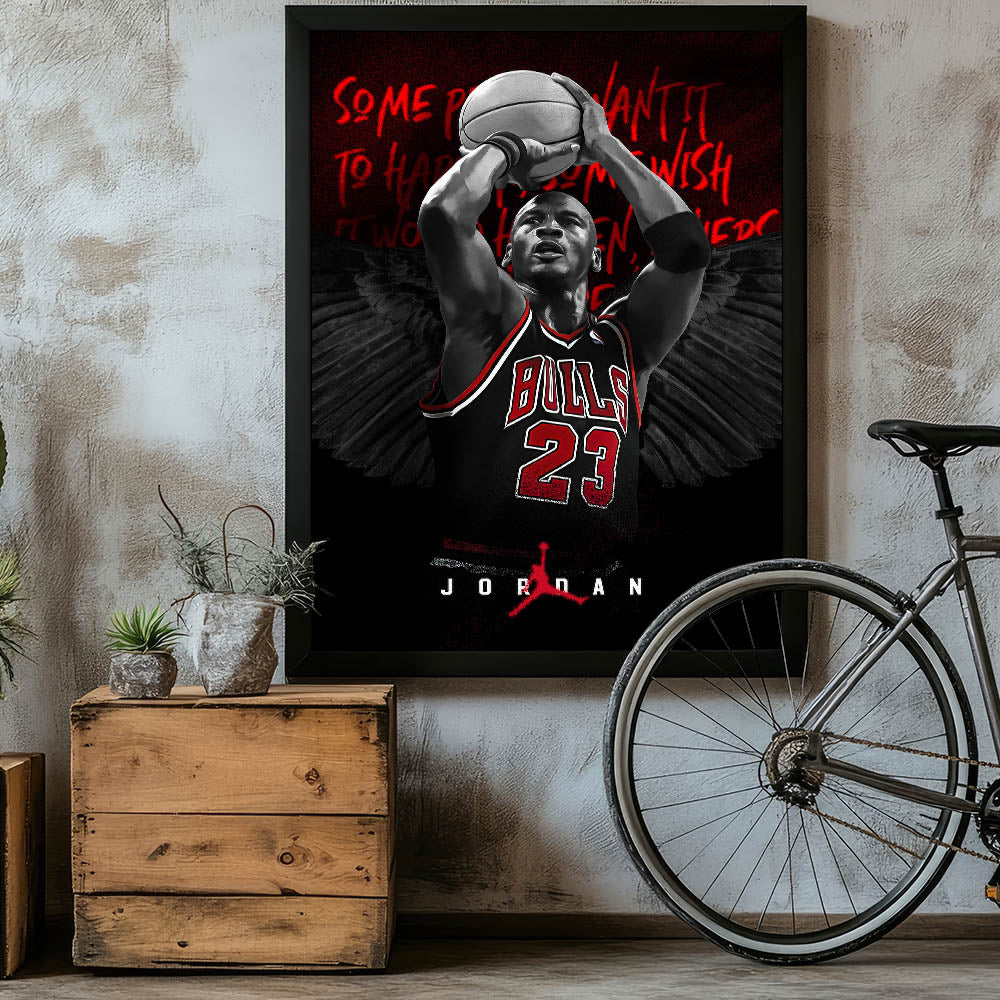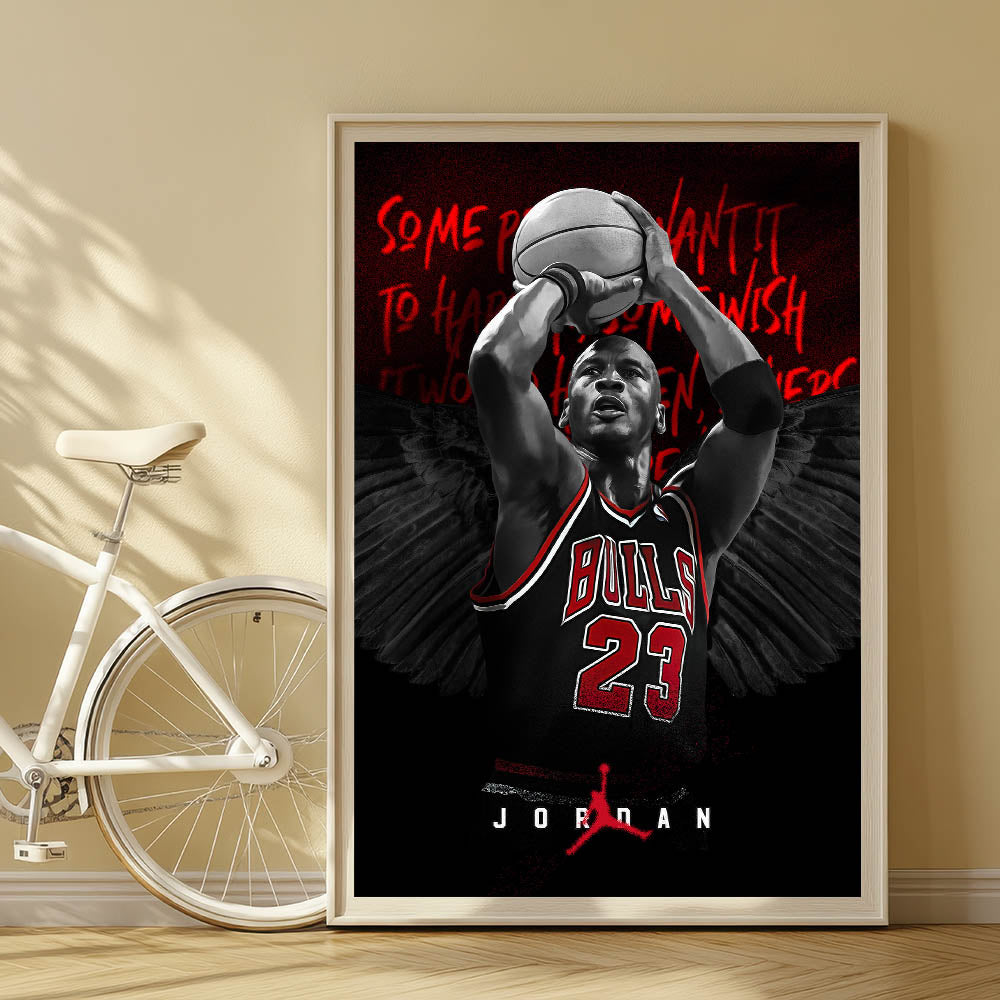 Ignite your space with this striking pop art wall decor featuring Michael Jordan, "His Airness," in a powerful and angelic pose. Showcasing a bold mix of black, red, and white, this artwork captures the essence of retro-inspired pop art with a modern, intense twist. The dramatic contrasts, wings, and motivational backdrop make it a must-have for sports enthusiasts and art collectors alike.