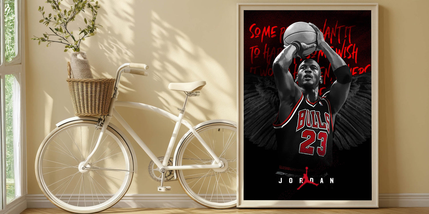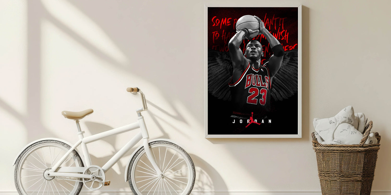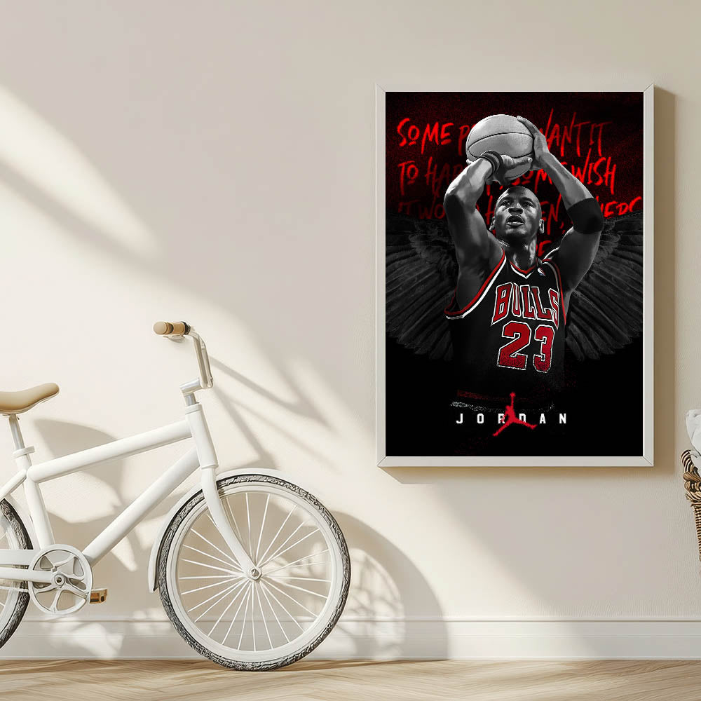 Ignite your space with this striking pop art wall decor featuring Michael Jordan, "His Airness," in a powerful and angelic pose. Showcasing a bold mix of black, red, and white, this artwork captures the essence of retro-inspired pop art with a modern, intense twist. The dramatic contrasts, wings, and motivational backdrop make it a must-have for sports enthusiasts and art collectors alike.