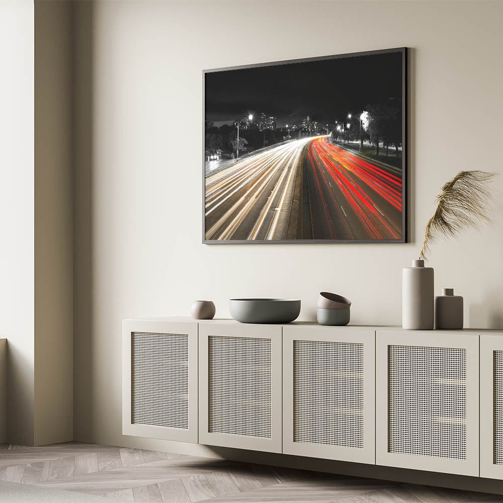 - Dynamic Light Trail Effect – Vivid streaks of red and white contrast against a monochrome city backdrop.