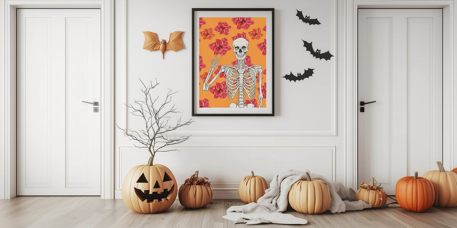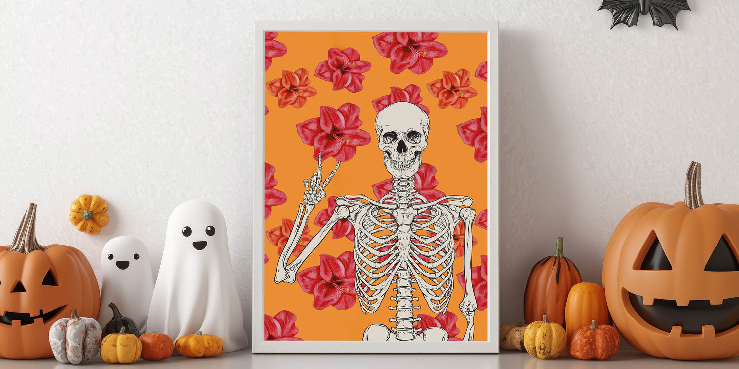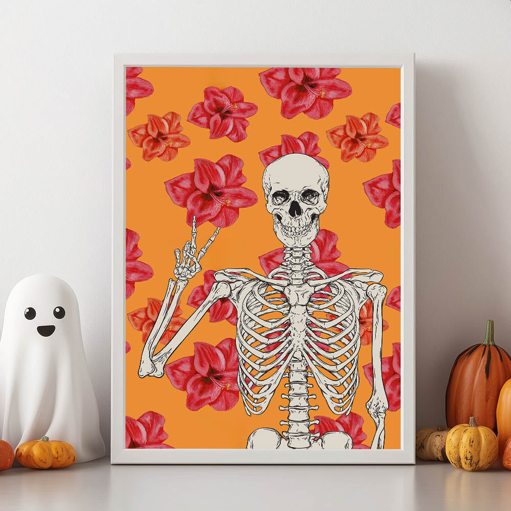 Add a bold and stylish twist to your Halloween decor with this Floral Skeleton Halloween Wall Art. Featuring a detailed skeleton making a peace sign against a vibrant orange background with blooming red flowers, this design blends spooky and chic aesthetics effortlessly. Perfect for those who love unique, artistic Halloween decorations.