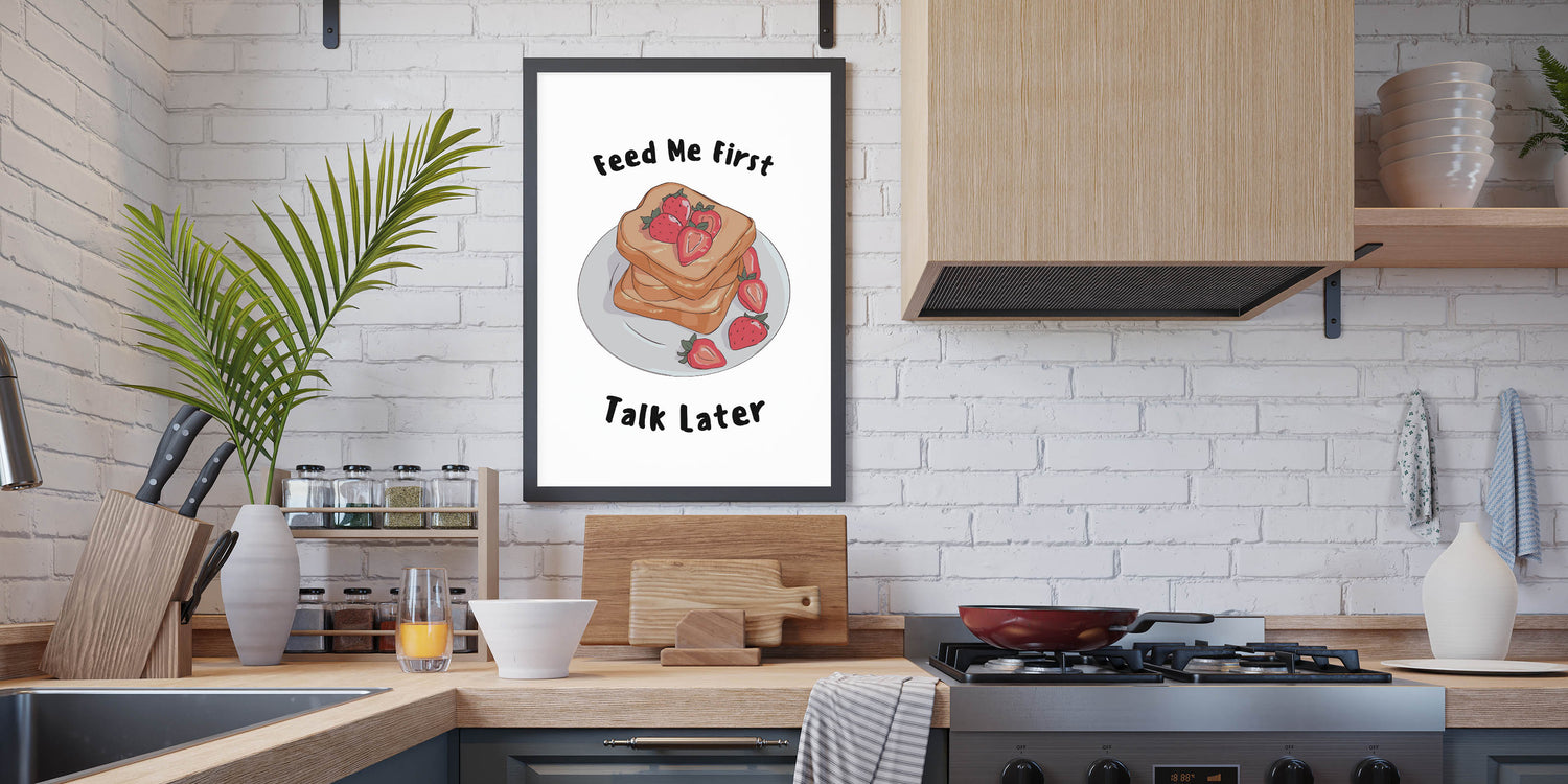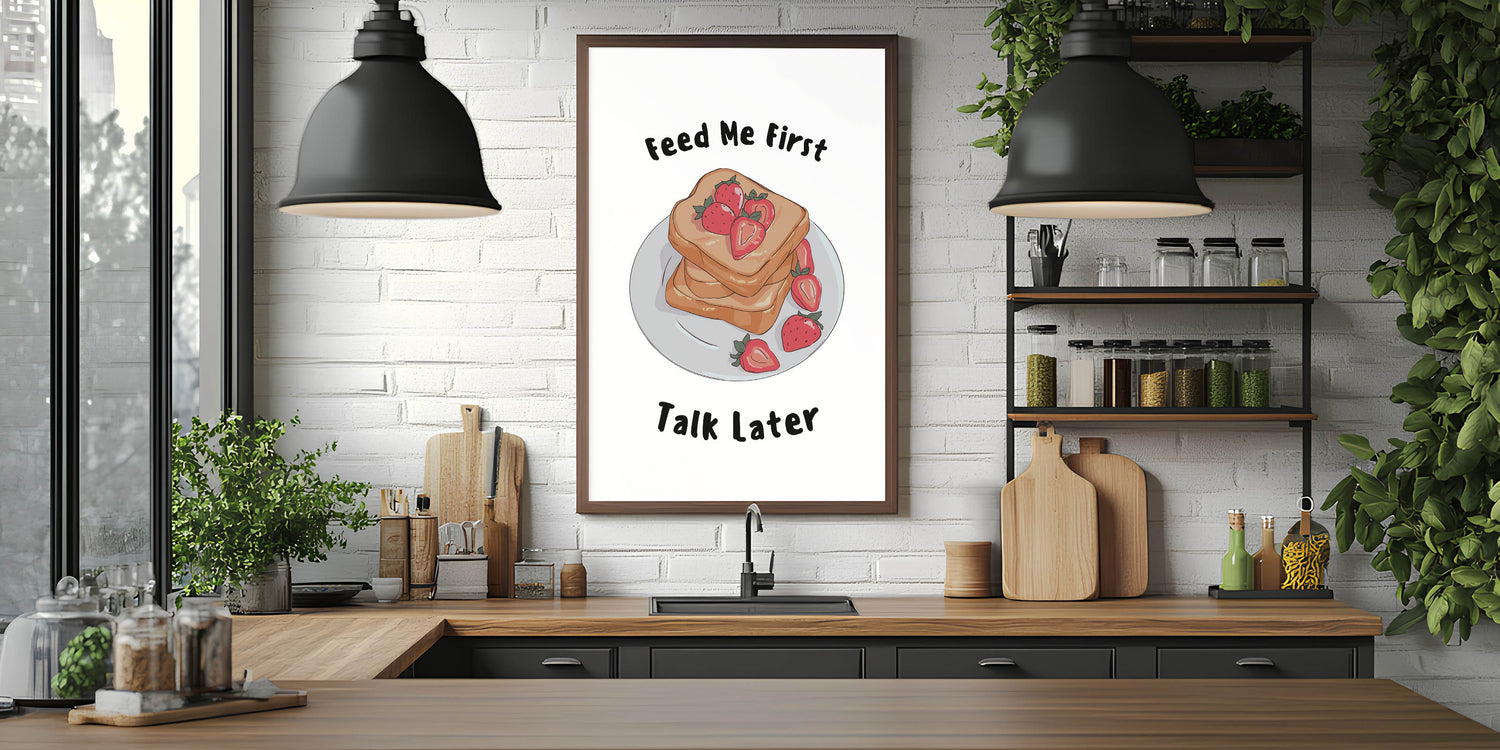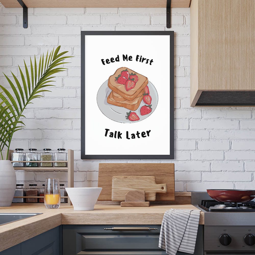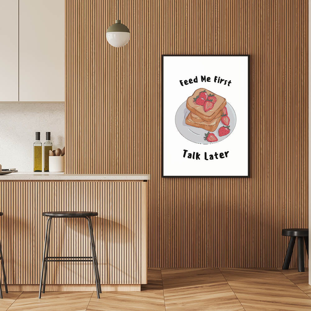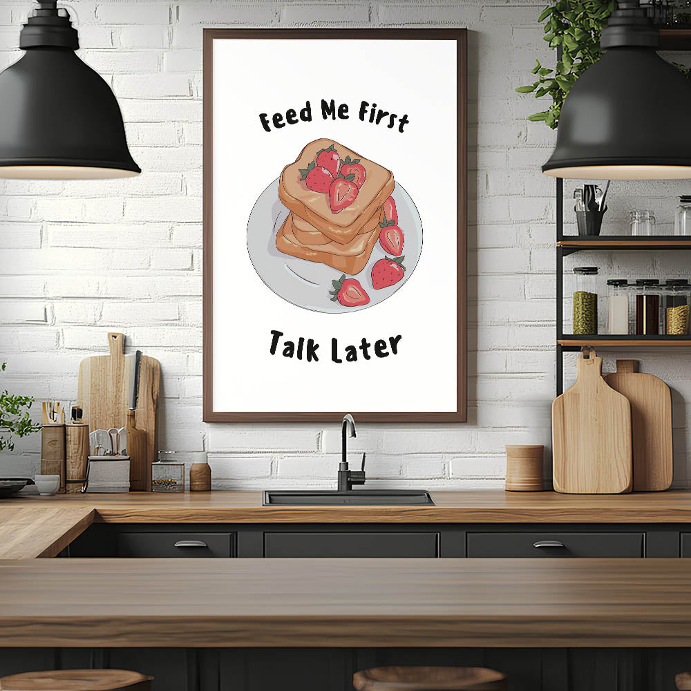 Start your day with humor and delicious vibes with this Fruit Wall Decor featuring the fun and relatable phrase "Feed Me First, Talk Later." The charming illustration showcases a stack of golden-brown French toast topped with fresh strawberries, making it the perfect decor piece for breakfast lovers and food enthusiasts.