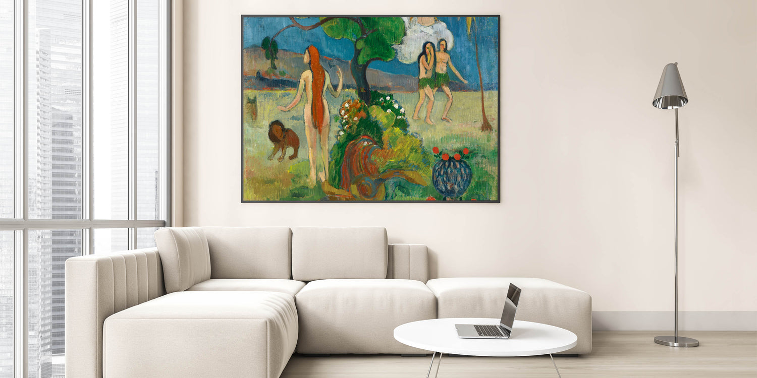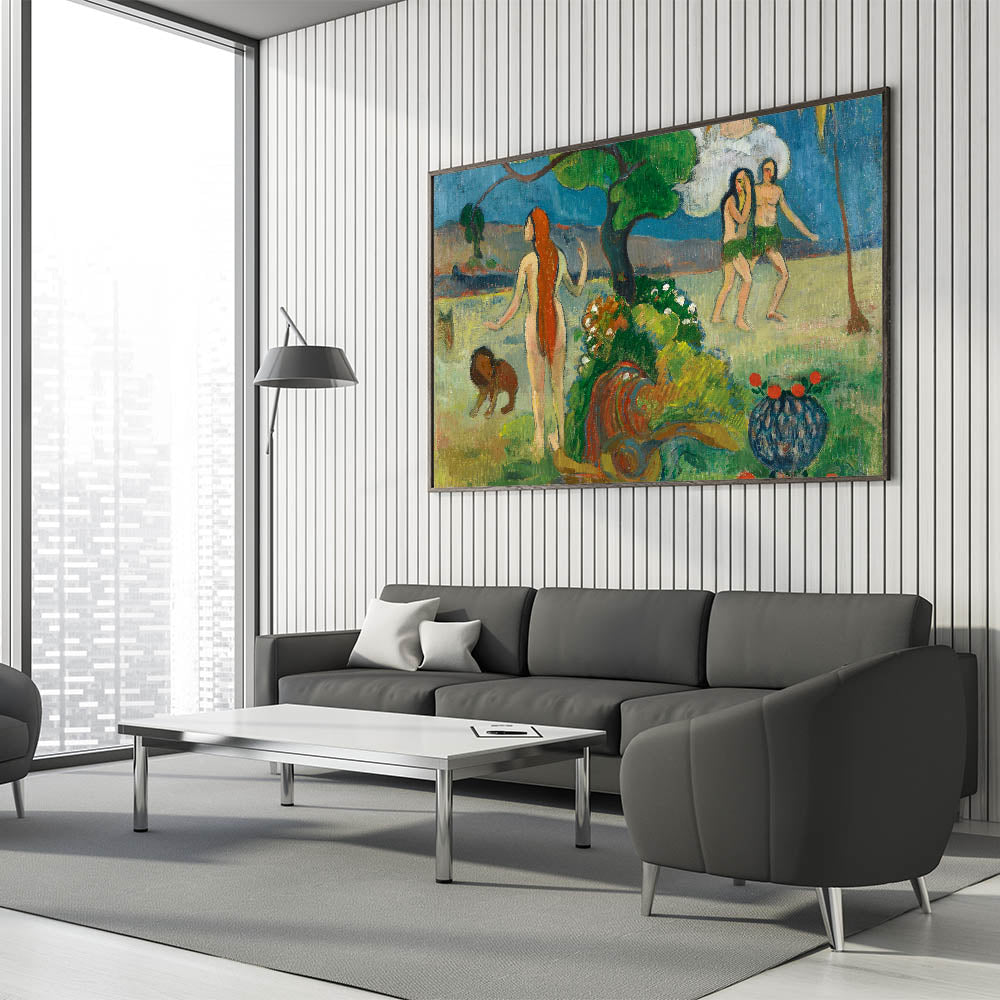 Experience the vivid imagination of Paul Gauguin with his symbolic masterpiece "Paradise Lost" (1848-1903). This striking painting explores the themes of creation and the innocence of the Garden of Eden, featuring a bold, colorful interpretation of Adam, Eve, and a lion. Gauguin’s unique use of color and simplified forms brings a dreamlike quality to this biblical scene, capturing both mystery and beauty in his signature style.