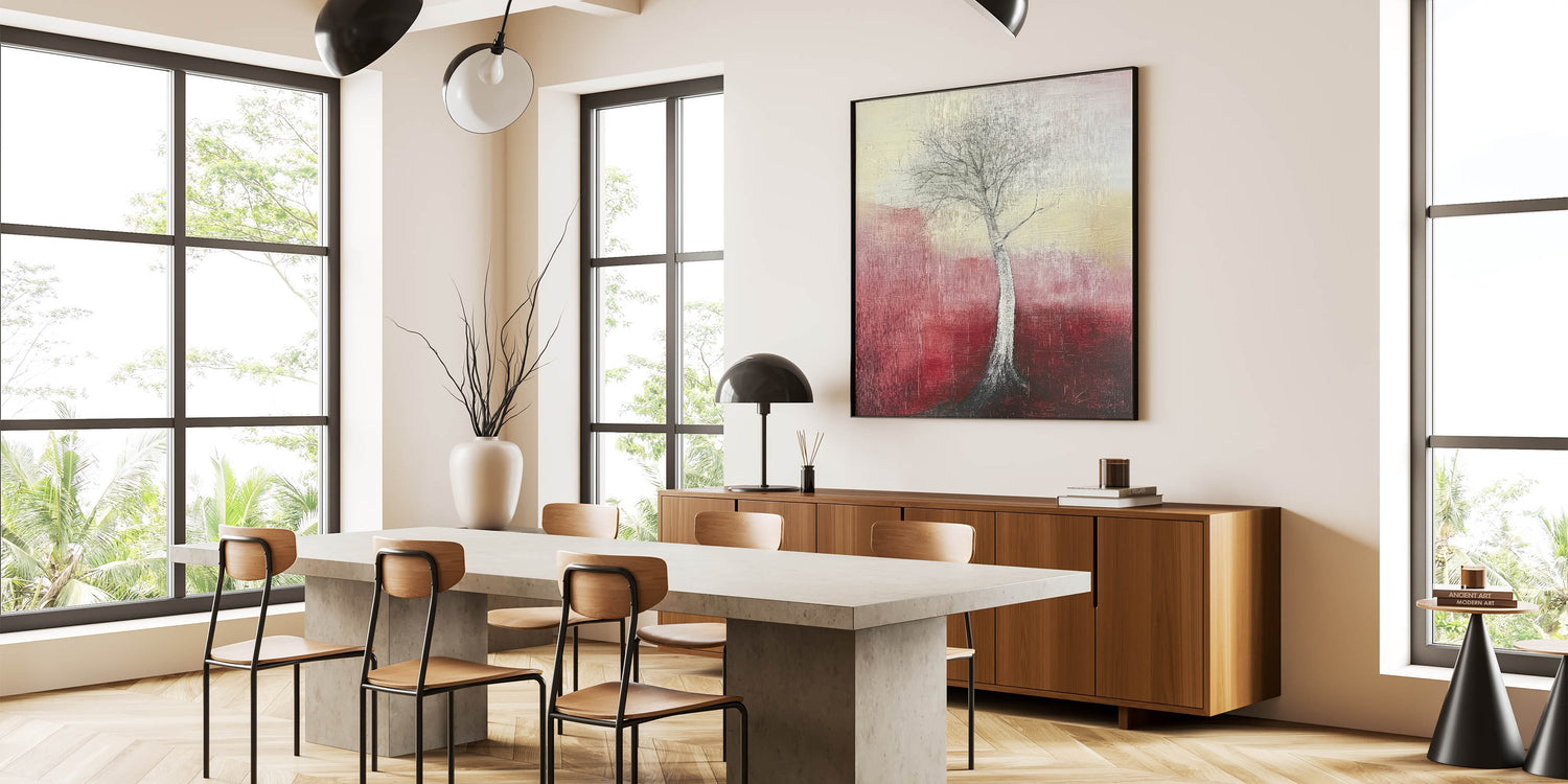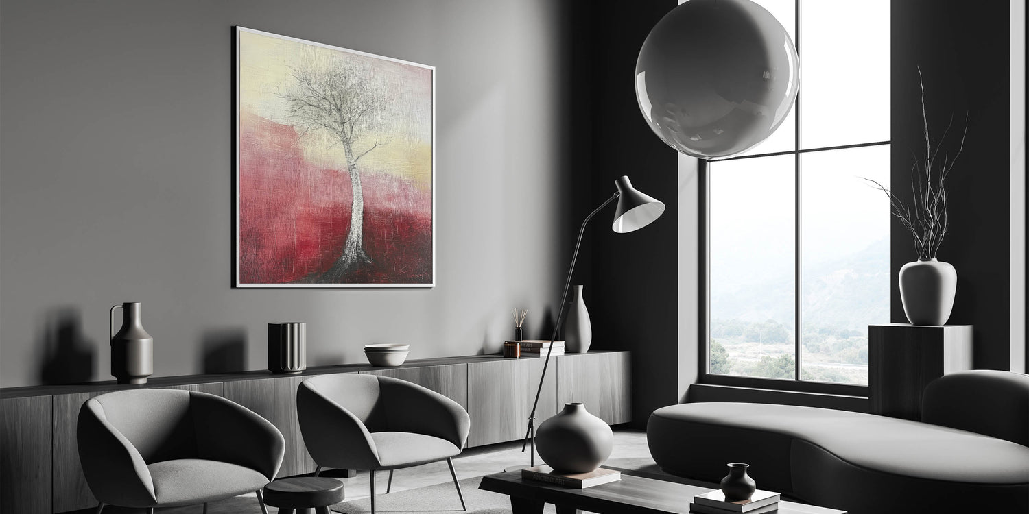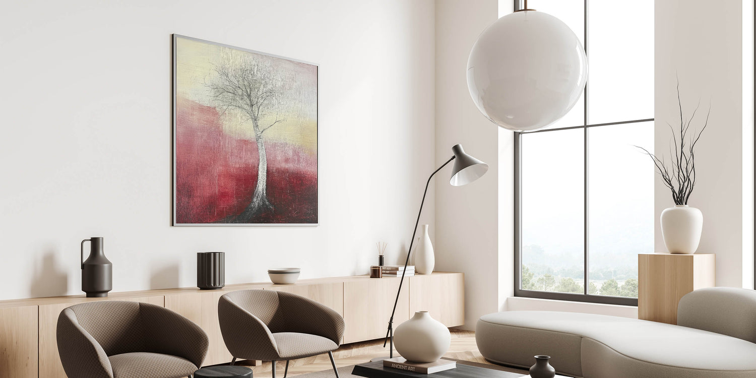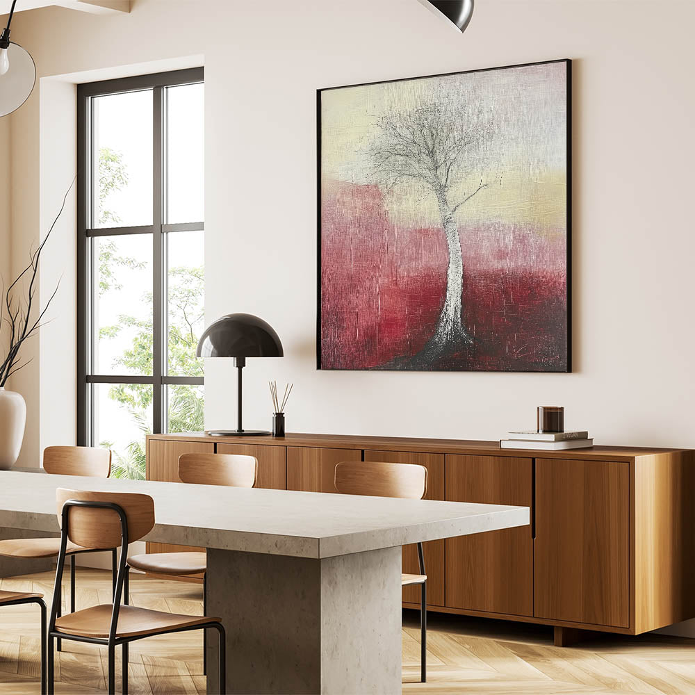 • Rich and Warm Colors: A harmonious blend of red and yellow tones with a detailed white tree silhouette adds vibrancy and sophistication.