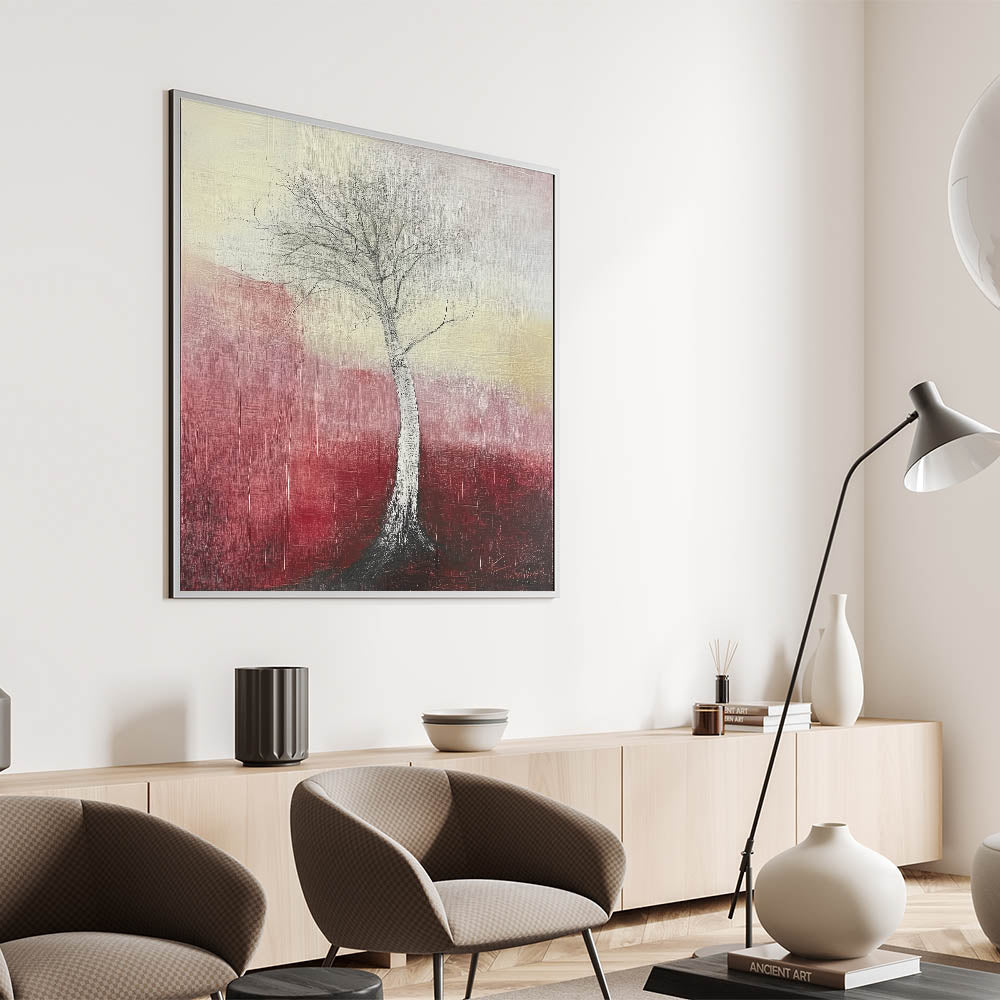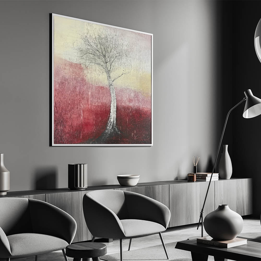 Infuse your space with elegance and depth through this stunning abstract floral artwork, showcasing a graceful lone tree against a vivid backdrop of red and yellow hues. The soft gradients and textured design create a serene and timeless aesthetic, making this piece an ideal choice for contemporary and minimalist interiors.