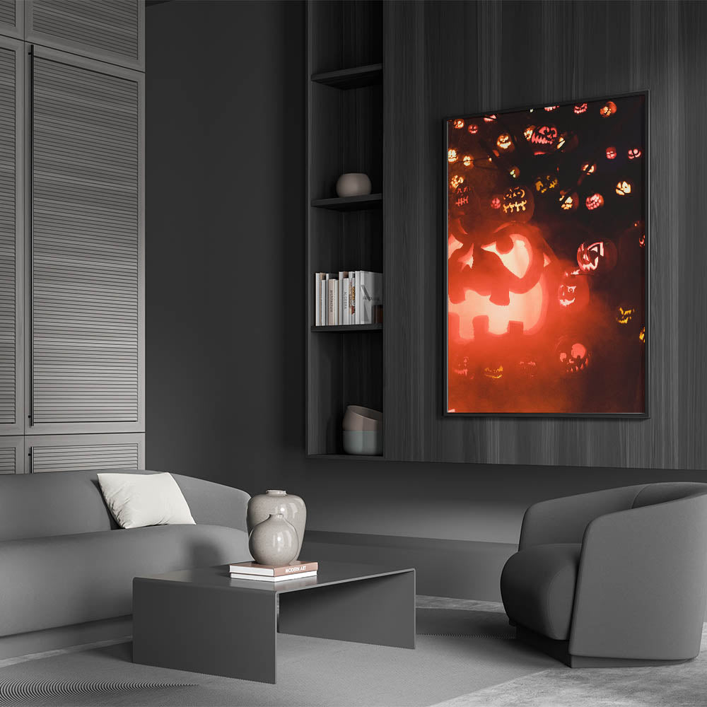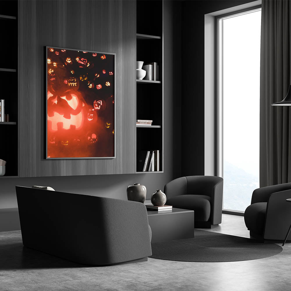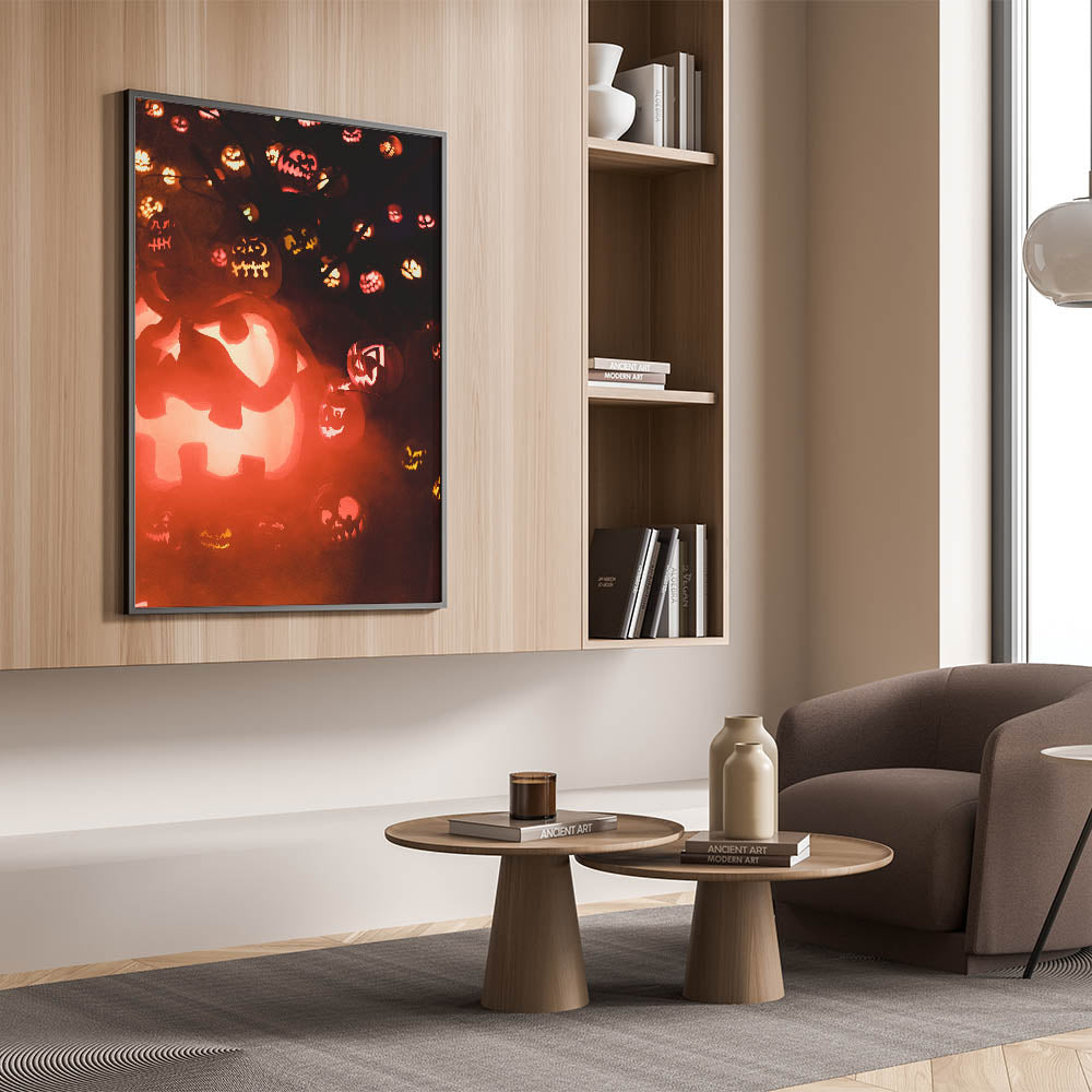 Embrace the magic of autumn nights with this spooky yet captivating fall wall art, featuring a collection of glowing jack-o’-lanterns. The warm orange and red tones create a fiery atmosphere, blending perfectly with the deep shadows of the night. The flickering lights and misty ambiance bring out the mystical charm of Halloween, making this autumn canvas art a striking statement piece for seasonal décor.