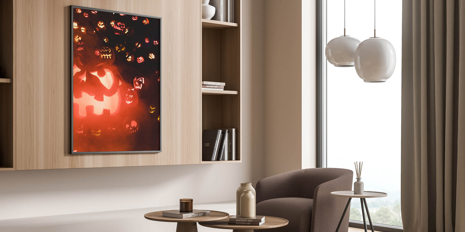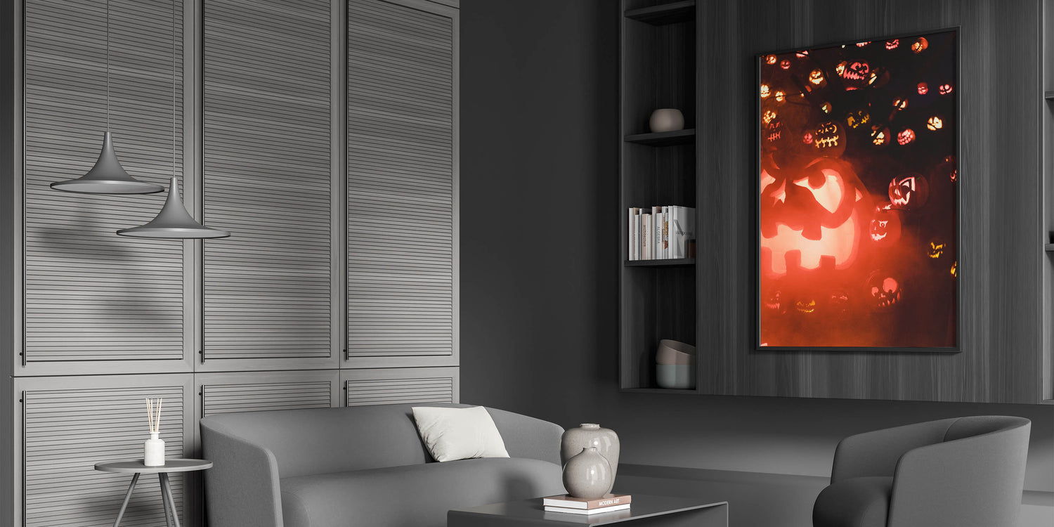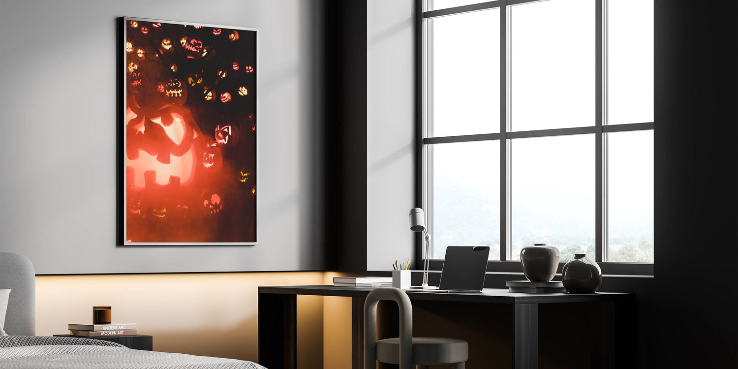 Embrace the magic of autumn nights with this spooky yet captivating fall wall art, featuring a collection of glowing jack-o’-lanterns. The warm orange and red tones create a fiery atmosphere, blending perfectly with the deep shadows of the night. The flickering lights and misty ambiance bring out the mystical charm of Halloween, making this autumn canvas art a striking statement piece for seasonal décor.