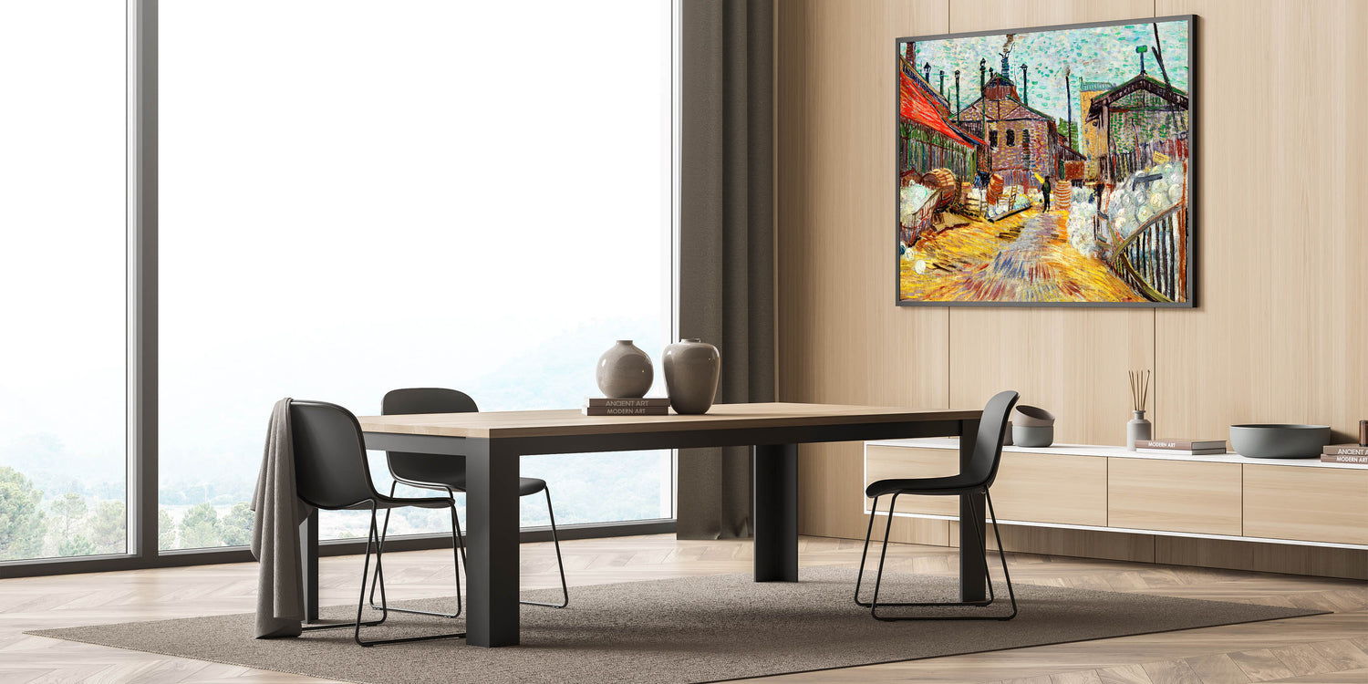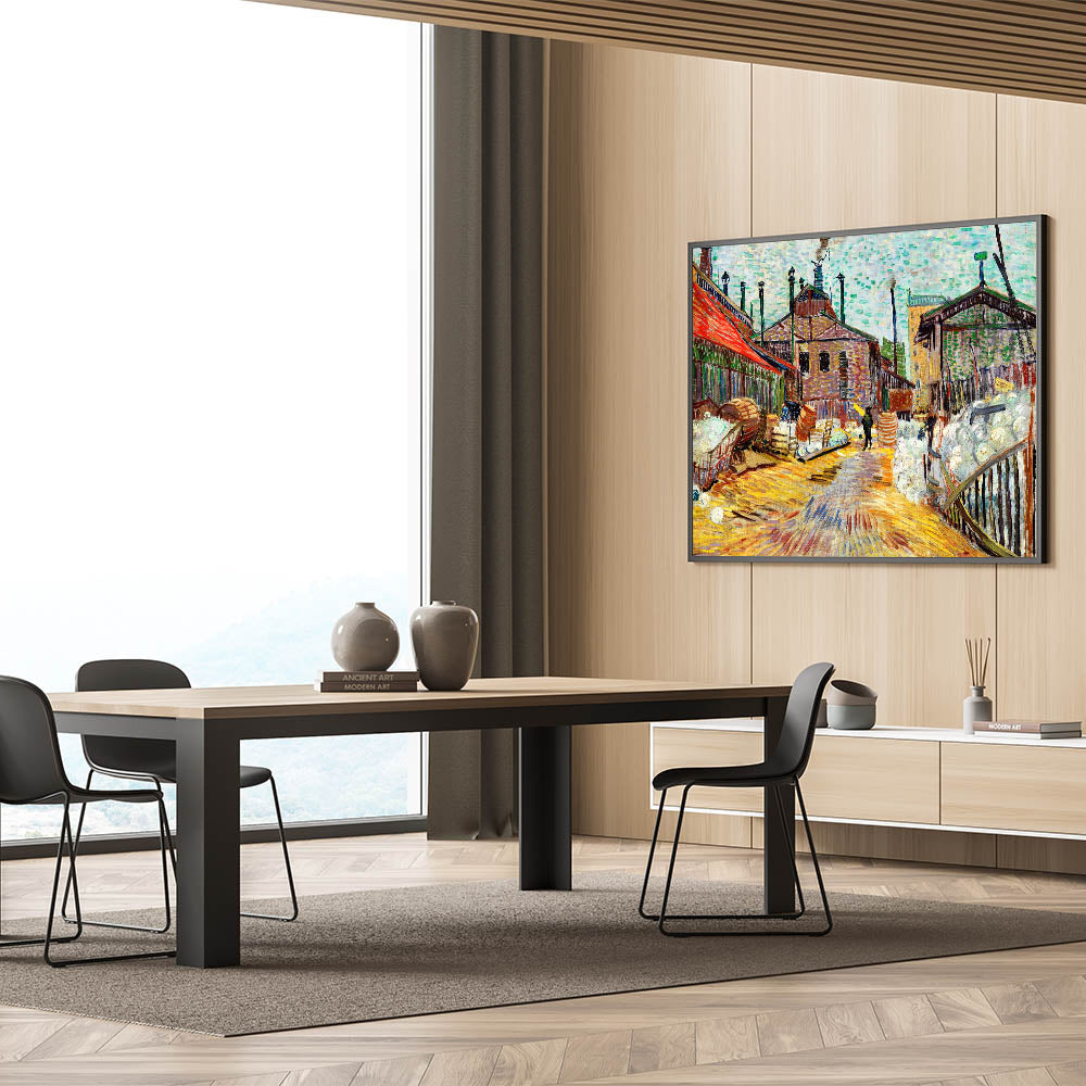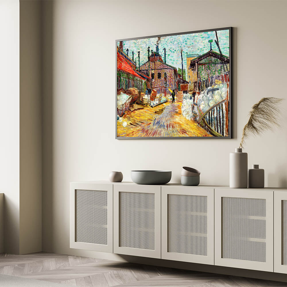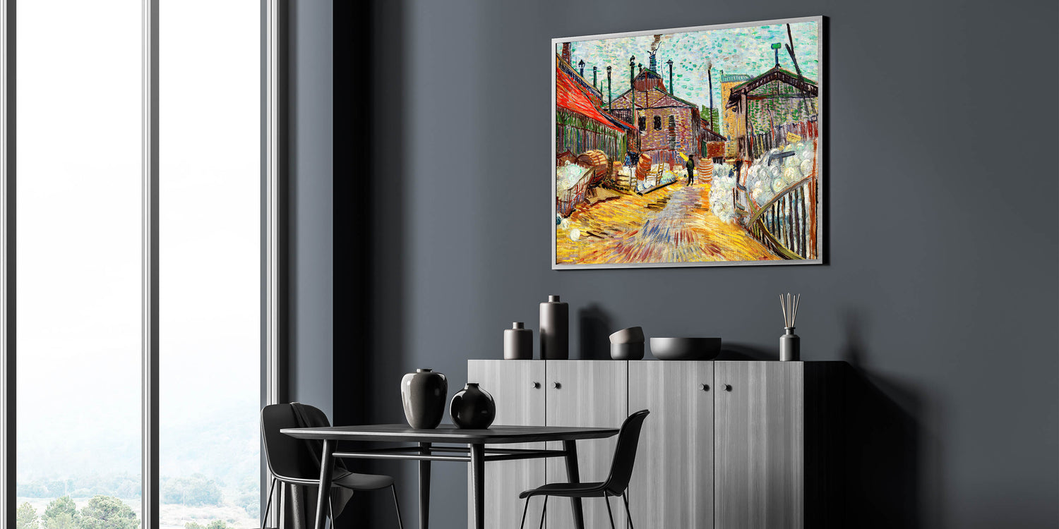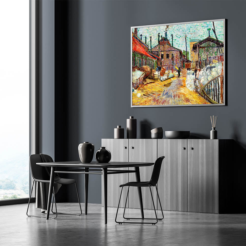 Add a vibrant and dynamic touch to your home with The Factory by Vincent van Gogh, an exemplary piece of Impressionist art. This striking artwork captures the industrial revolution's energy, with expressive brushstrokes and bold colors that bring the bustling factory scene to life. Perfect for lovers of French Impressionist art, this piece blends historic relevance with artistic brilliance, making it a centerpiece for any space.