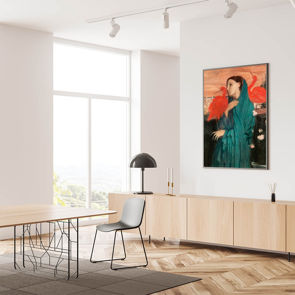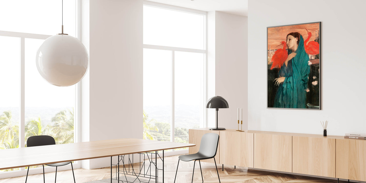 Transform your space with Edgar Degas’s stunning “Young Woman with Ibis” (ca. 1860–1862). This intriguing piece combines portraiture with vibrant symbolism, featuring a serene young woman draped in flowing teal fabric, accompanied by striking red ibis birds. The contrasting colors and delicate brushstrokes showcase Degas’s unique blend of Impressionist and classical techniques, creating a powerful and emotive composition.