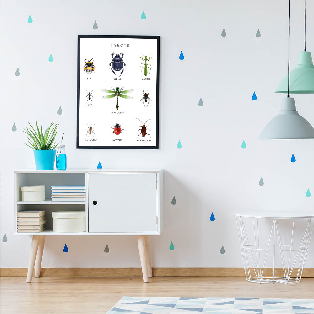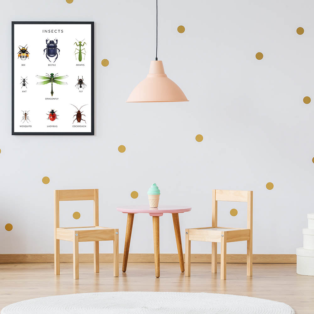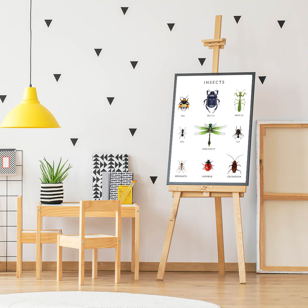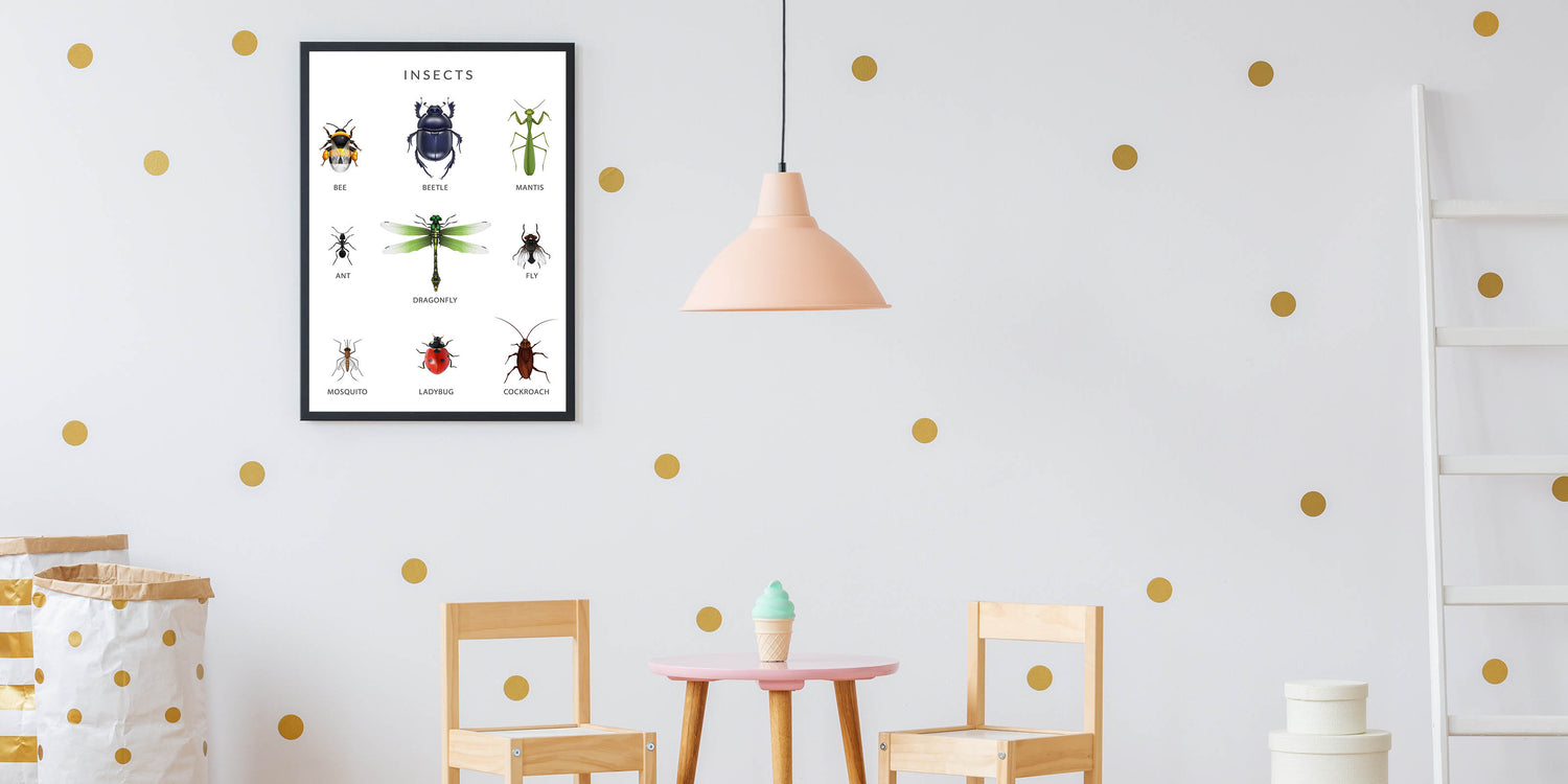Introduce children to the fascinating world of insects with this Insects Kids Educational Wall Art. Featuring detailed illustrations of bees, beetles, dragonflies, ants, ladybugs, and more, this engaging poster helps kids identify and learn about different types of insects. Perfect for kids' rooms, nurseries, and classrooms, this artwork sparks curiosity about nature and the tiny creatures that play a vital role in our environment.