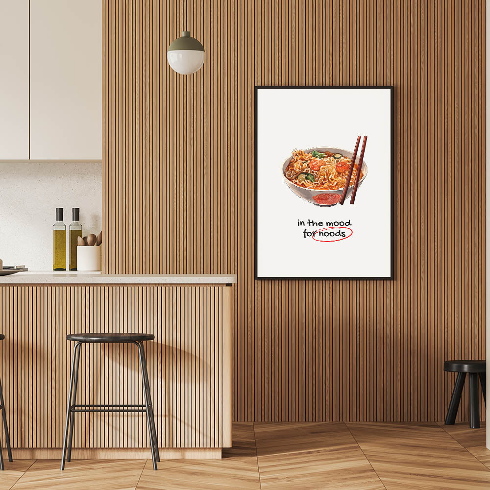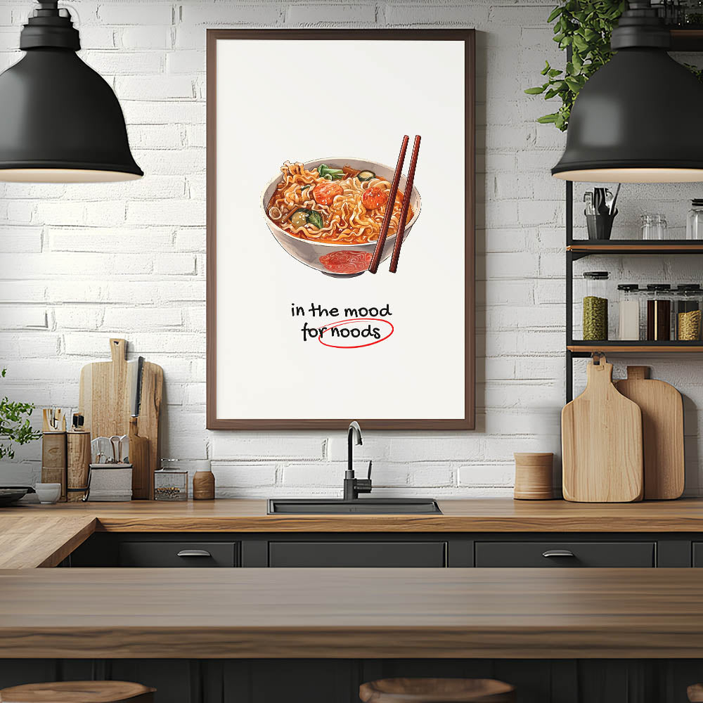 Spice up your kitchen with this Inspirational Culinary Wall Art featuring a playful "In the Mood for Noods" ramen bowl design. With its detailed illustration of a steaming hot bowl of noodles, complete with rich broth, vegetables, and chopsticks, this artwork is perfect for ramen lovers and foodies who enjoy a touch of humor in their decor.