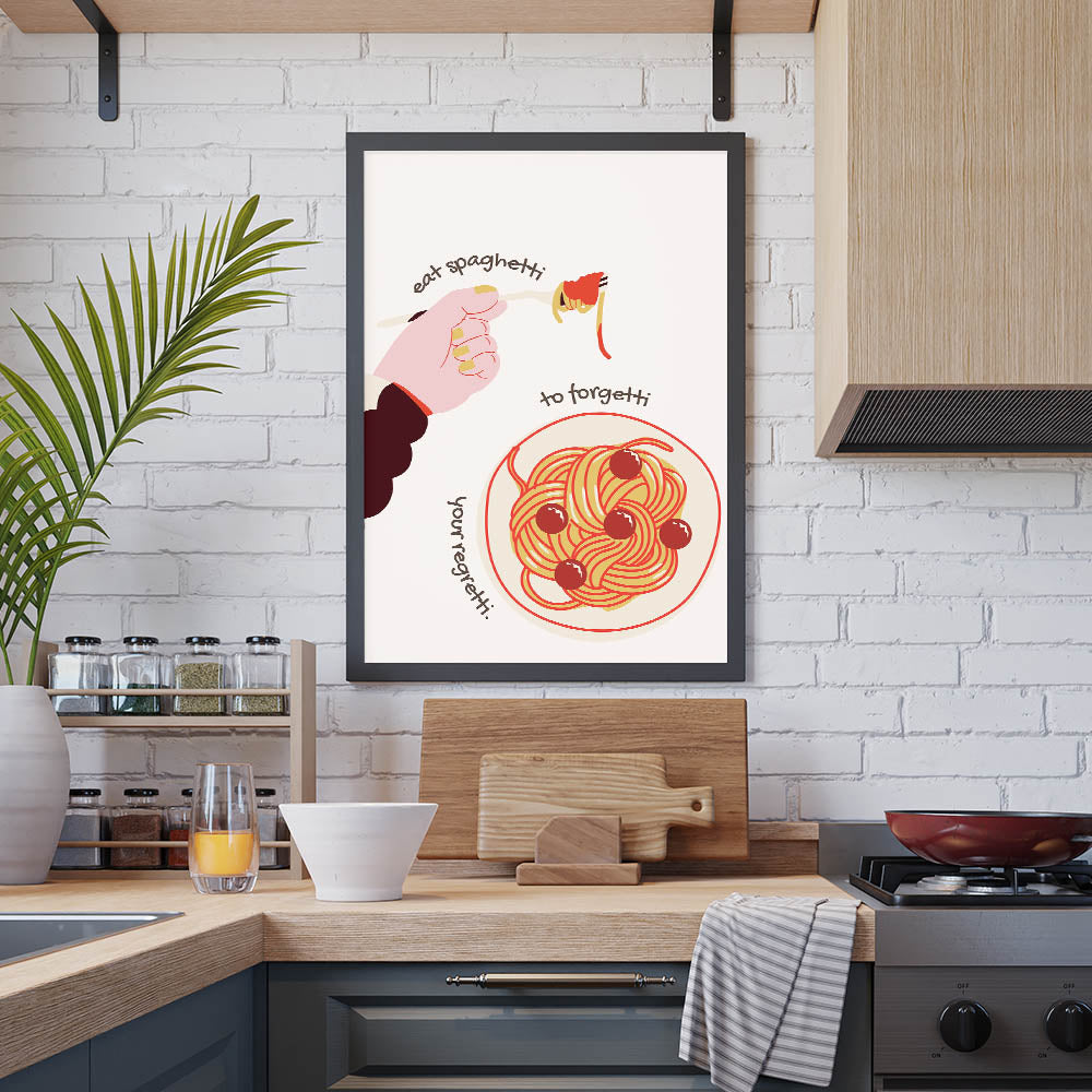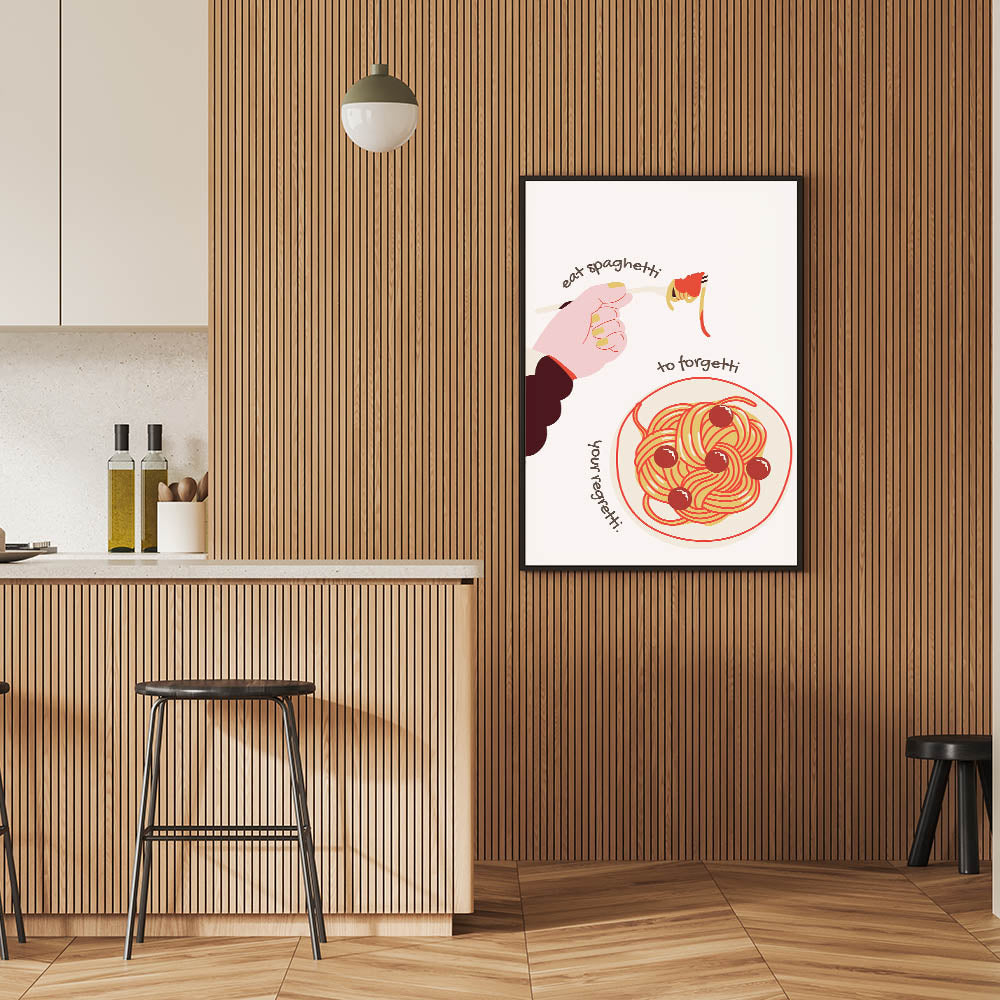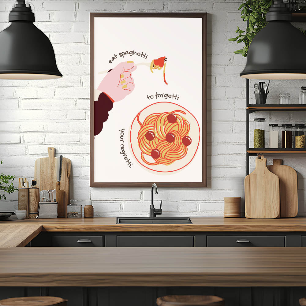 Add humor and charm to your kitchen with this Inspirational Culinary Wall Art featuring the playful quote, "Eat Spaghetti to Forgetti Your Regretti." This fun and quirky design showcases an illustrated plate of spaghetti with meatballs and a hand twirling pasta on a fork, creating a delightful and lighthearted kitchen decor piece.