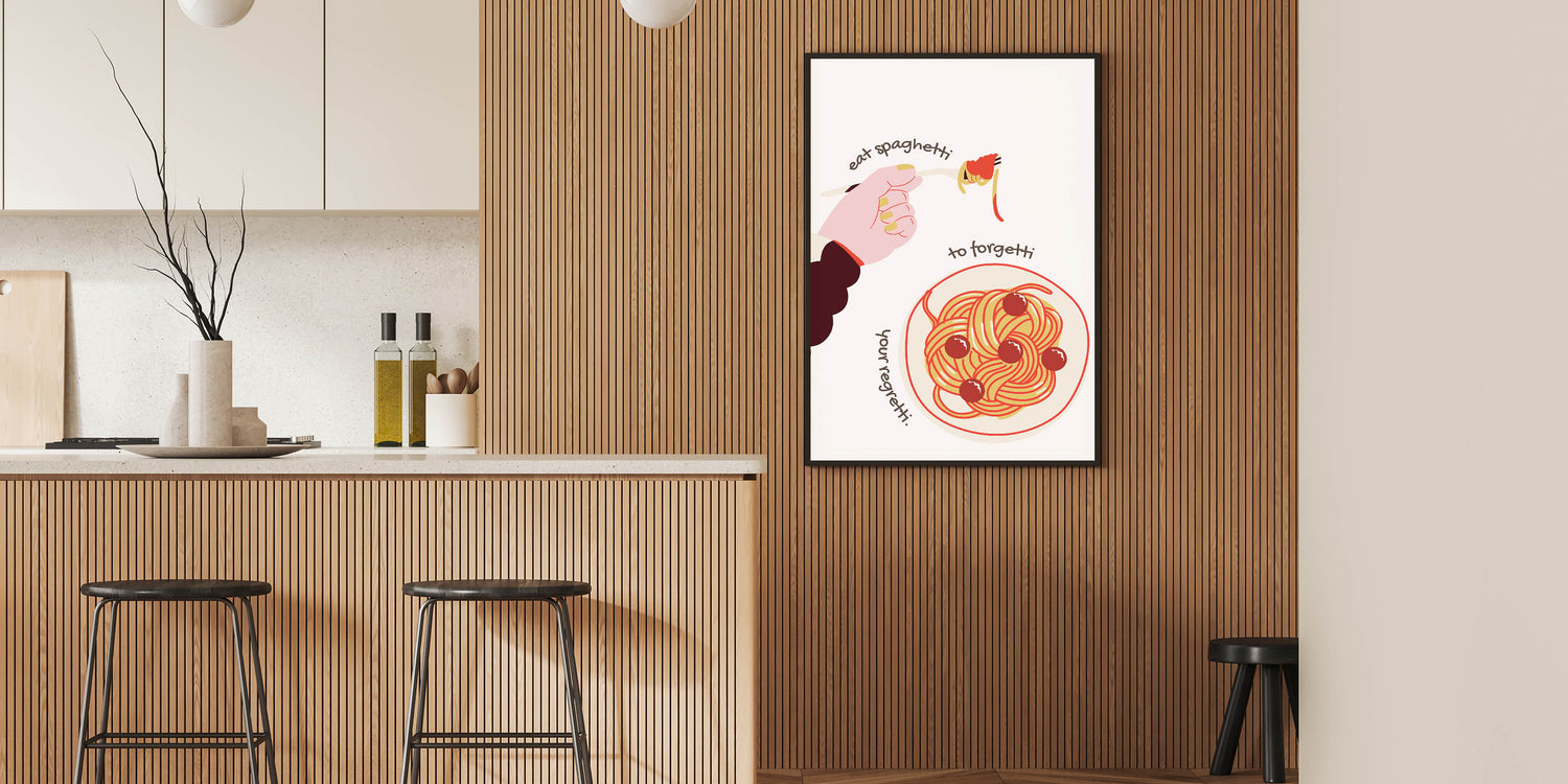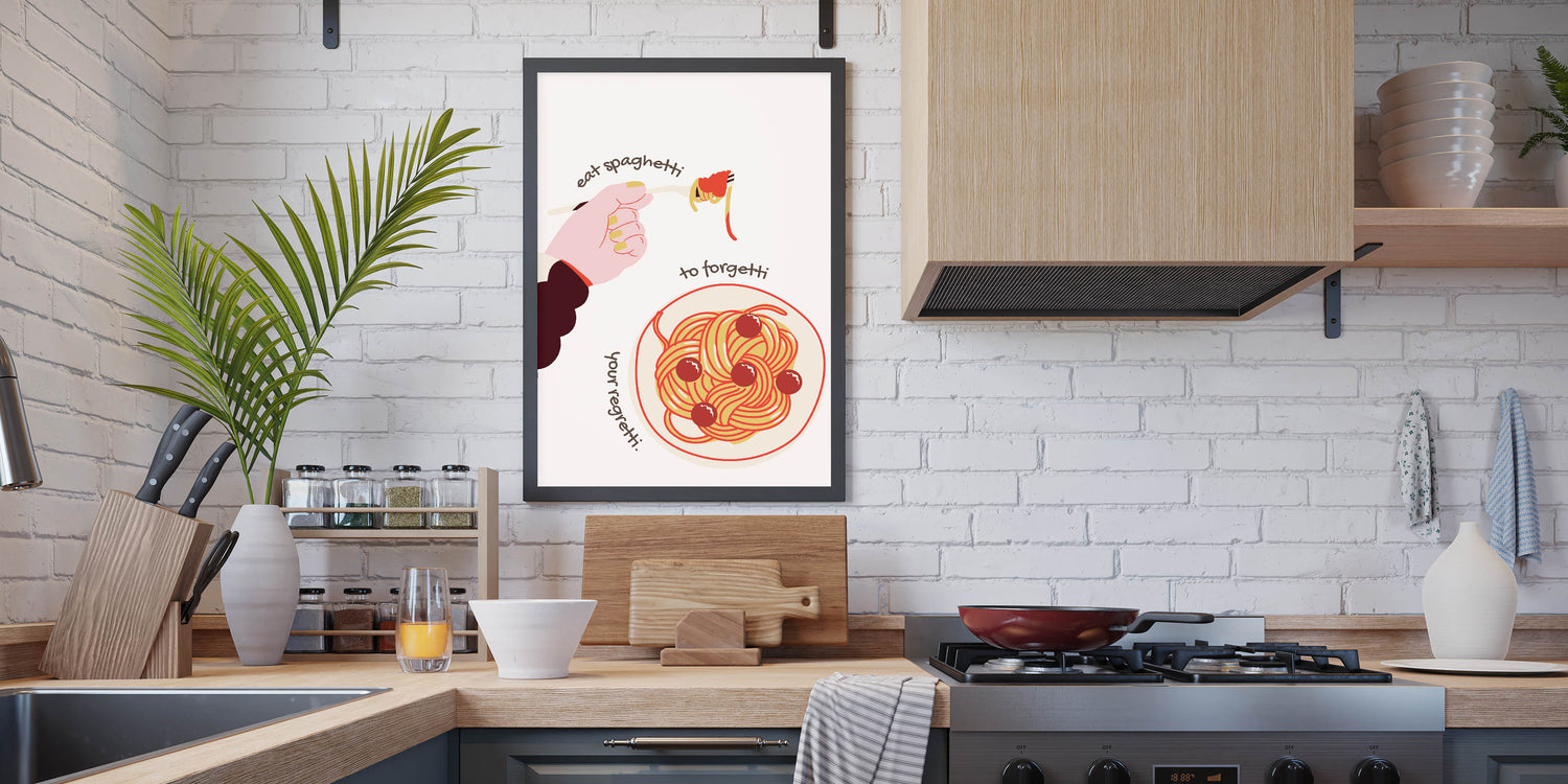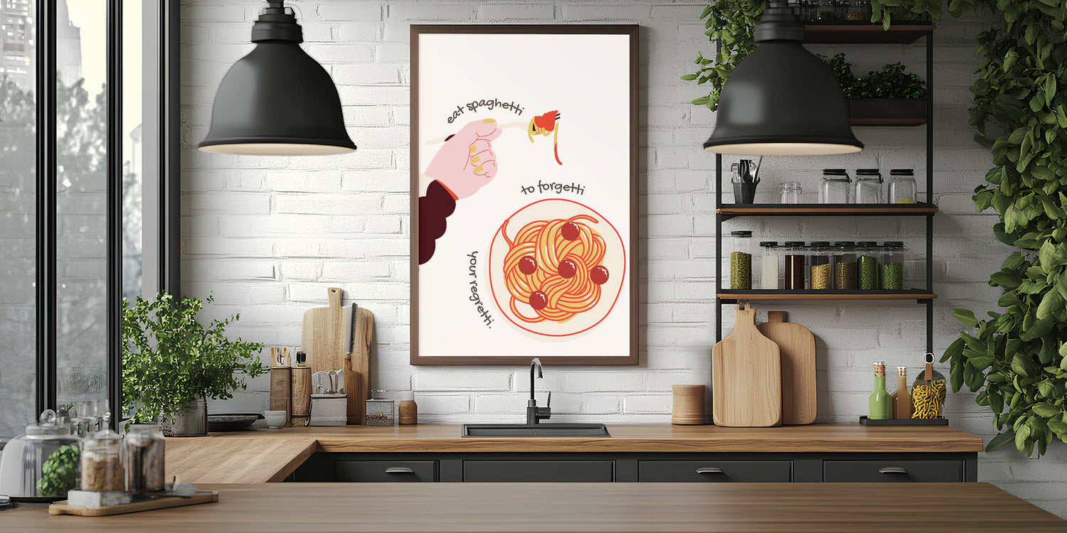 Add humor and charm to your kitchen with this Inspirational Culinary Wall Art featuring the playful quote, "Eat Spaghetti to Forgetti Your Regretti." This fun and quirky design showcases an illustrated plate of spaghetti with meatballs and a hand twirling pasta on a fork, creating a delightful and lighthearted kitchen decor piece.
