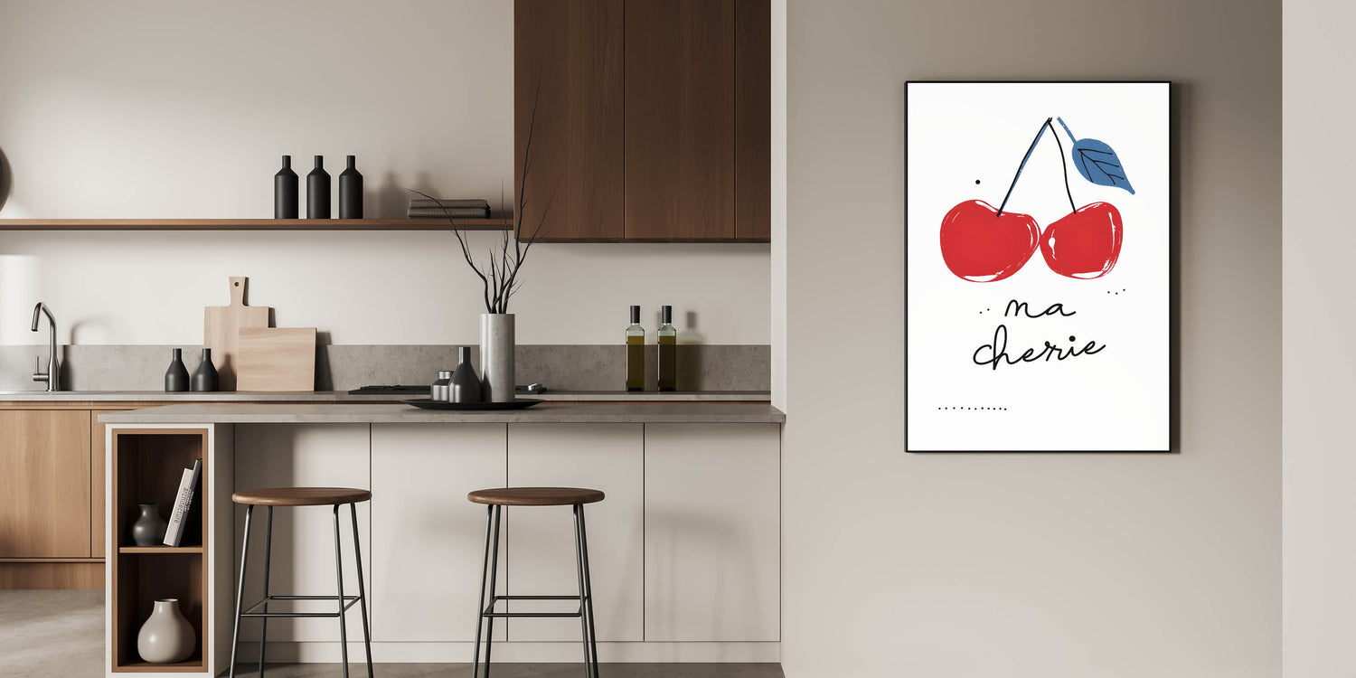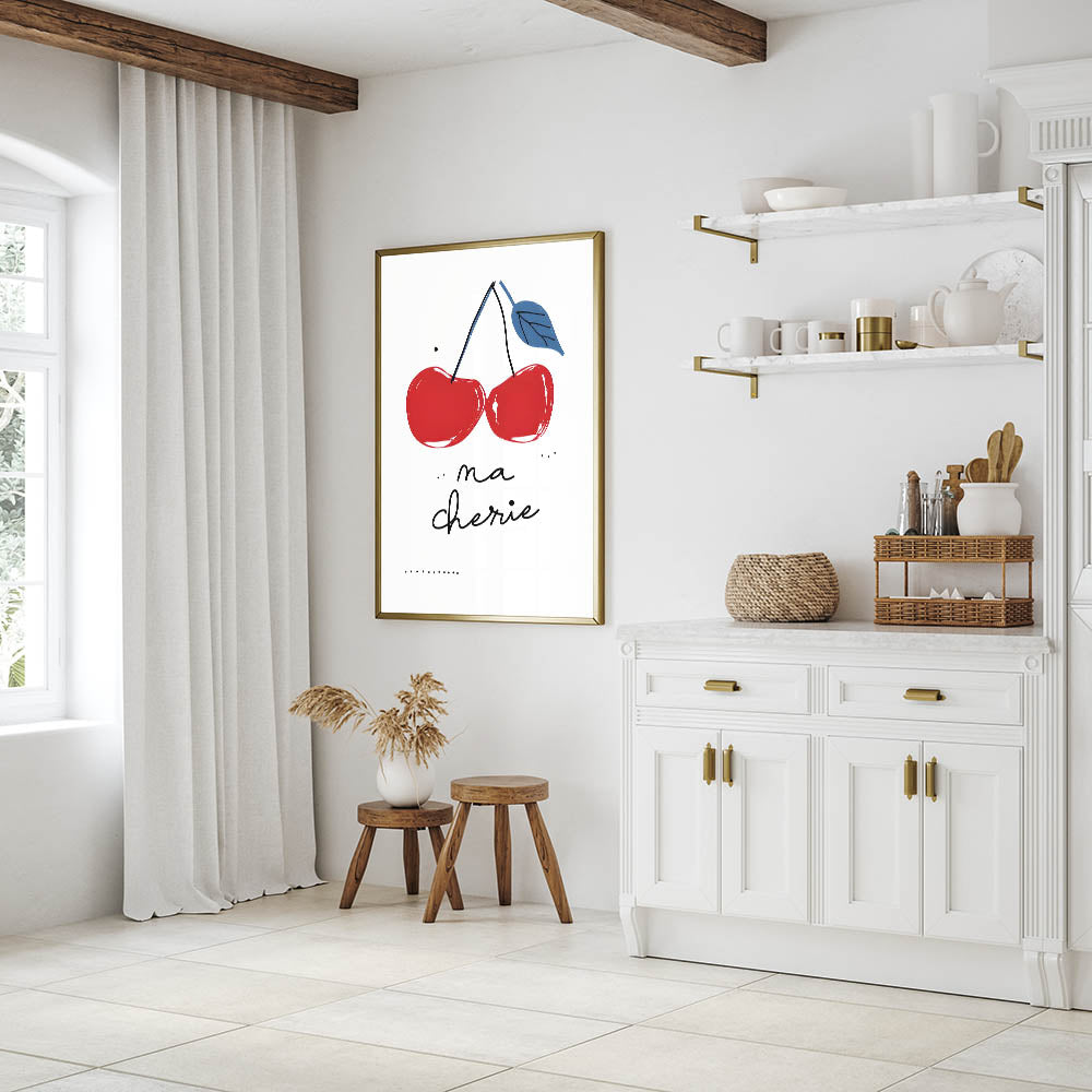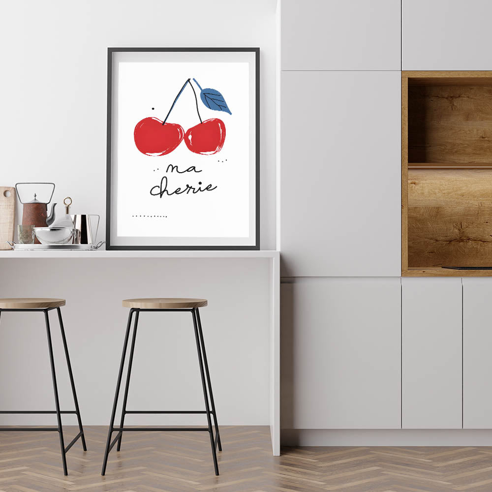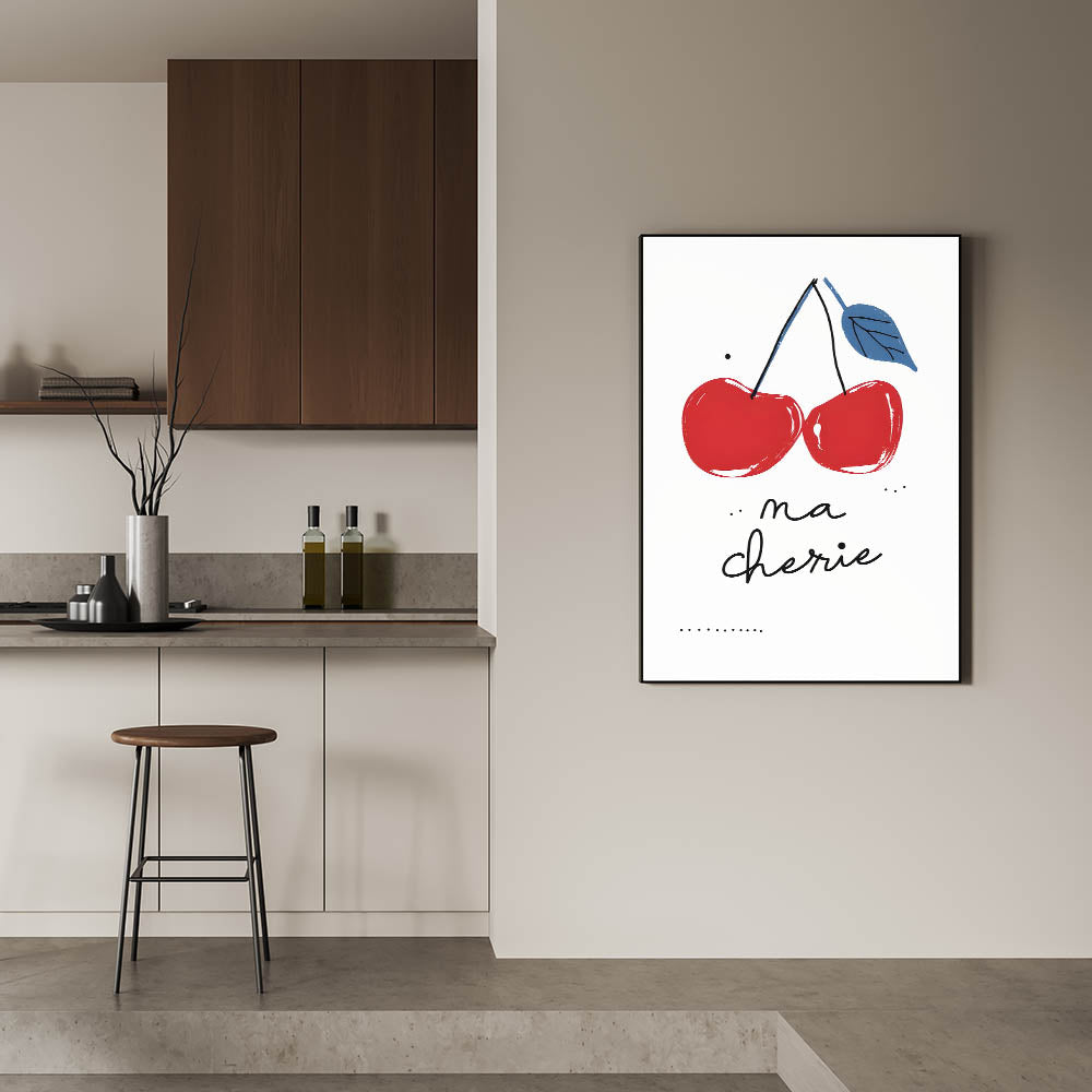 Add a touch of romance and charm to your space with this Inspirational Kitchen Prints featuring the elegant French phrase "Ma Chérie." Designed with simplicity and sophistication in mind, this Kitchen Wall Art with Quotes showcases a minimalist illustration of two vibrant red cherries with a contrasting blue leaf. The hand-drawn typography and clean white background create a stylish and modern look, making this Motivational Kitchen Art Prints a perfect addition to any home.