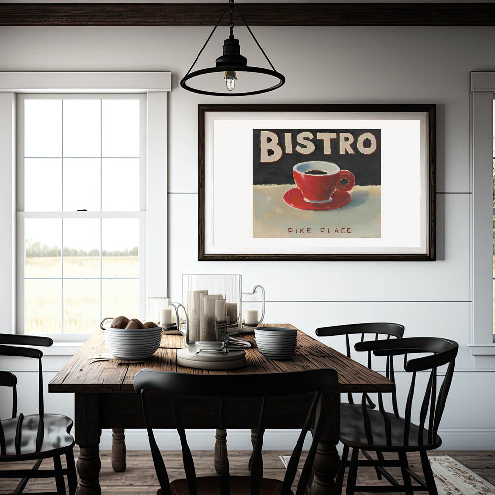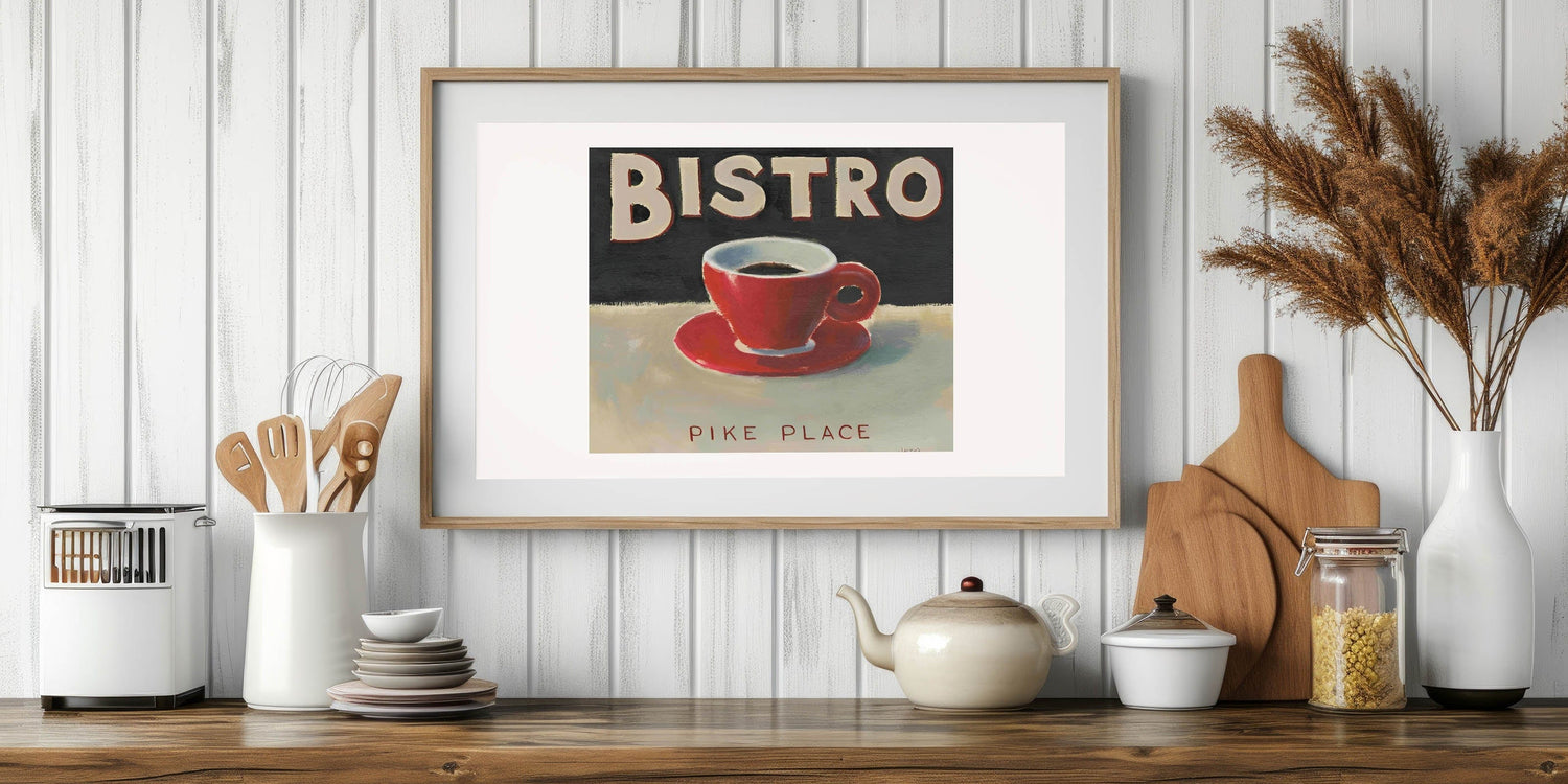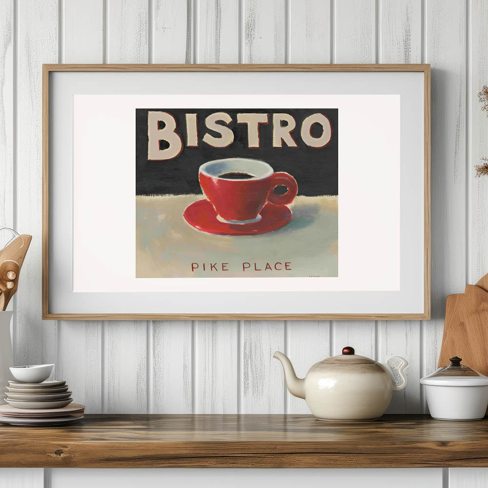 Bring the charm of a classic café into your home with this Inspirational Kitchen Print featuring a vintage-style Bistro Coffee design. This beautifully hand-painted artwork showcases a bold red coffee cup and saucer with elegant typography reading "Bistro – Pike Place." The warm tones and nostalgic feel make this piece a perfect addition to any kitchen, coffee station, or café.
