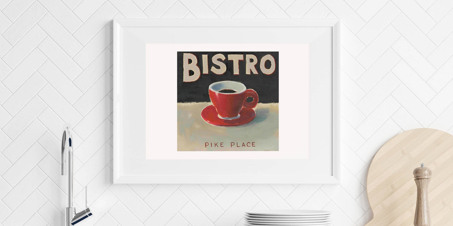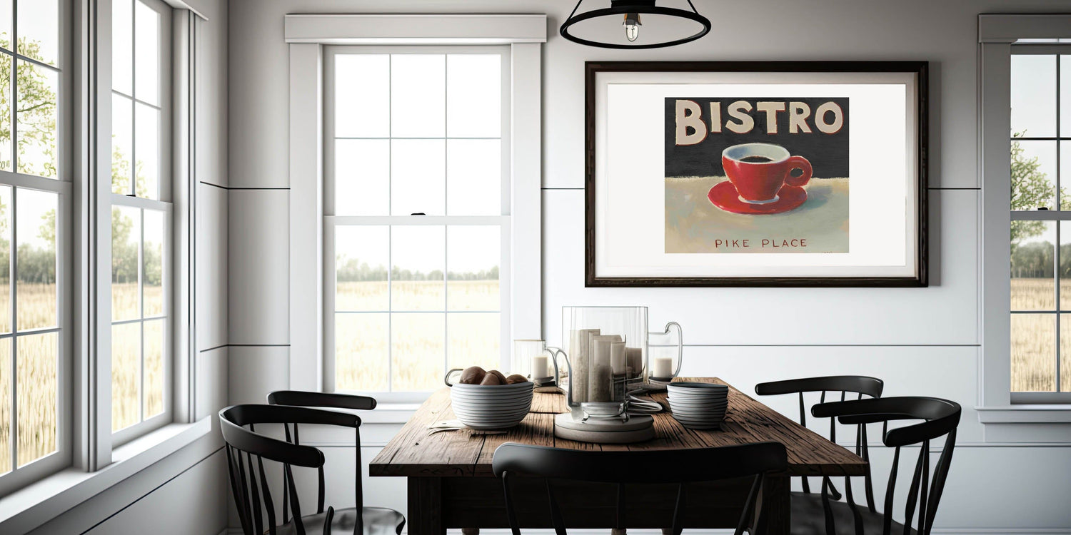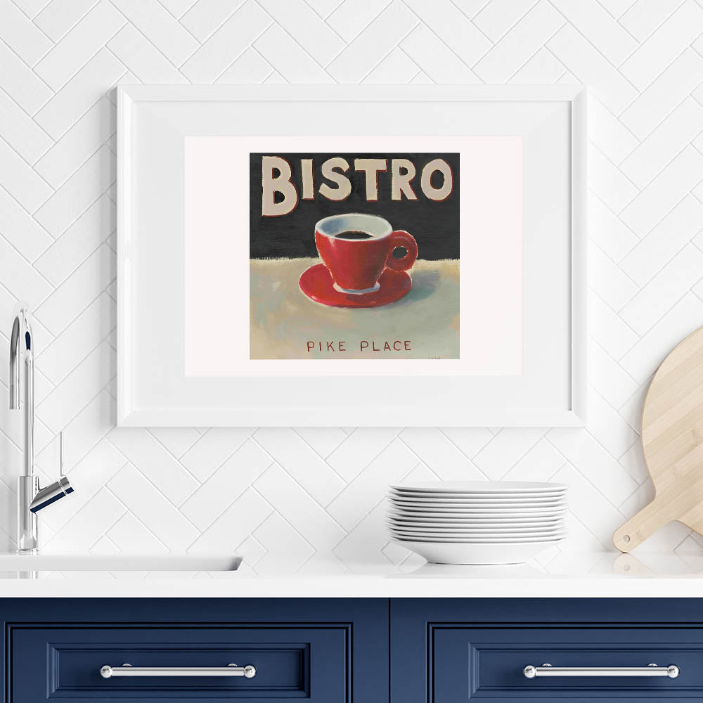 Bring the charm of a classic café into your home with this Inspirational Kitchen Print featuring a vintage-style Bistro Coffee design. This beautifully hand-painted artwork showcases a bold red coffee cup and saucer with elegant typography reading "Bistro – Pike Place." The warm tones and nostalgic feel make this piece a perfect addition to any kitchen, coffee station, or café.