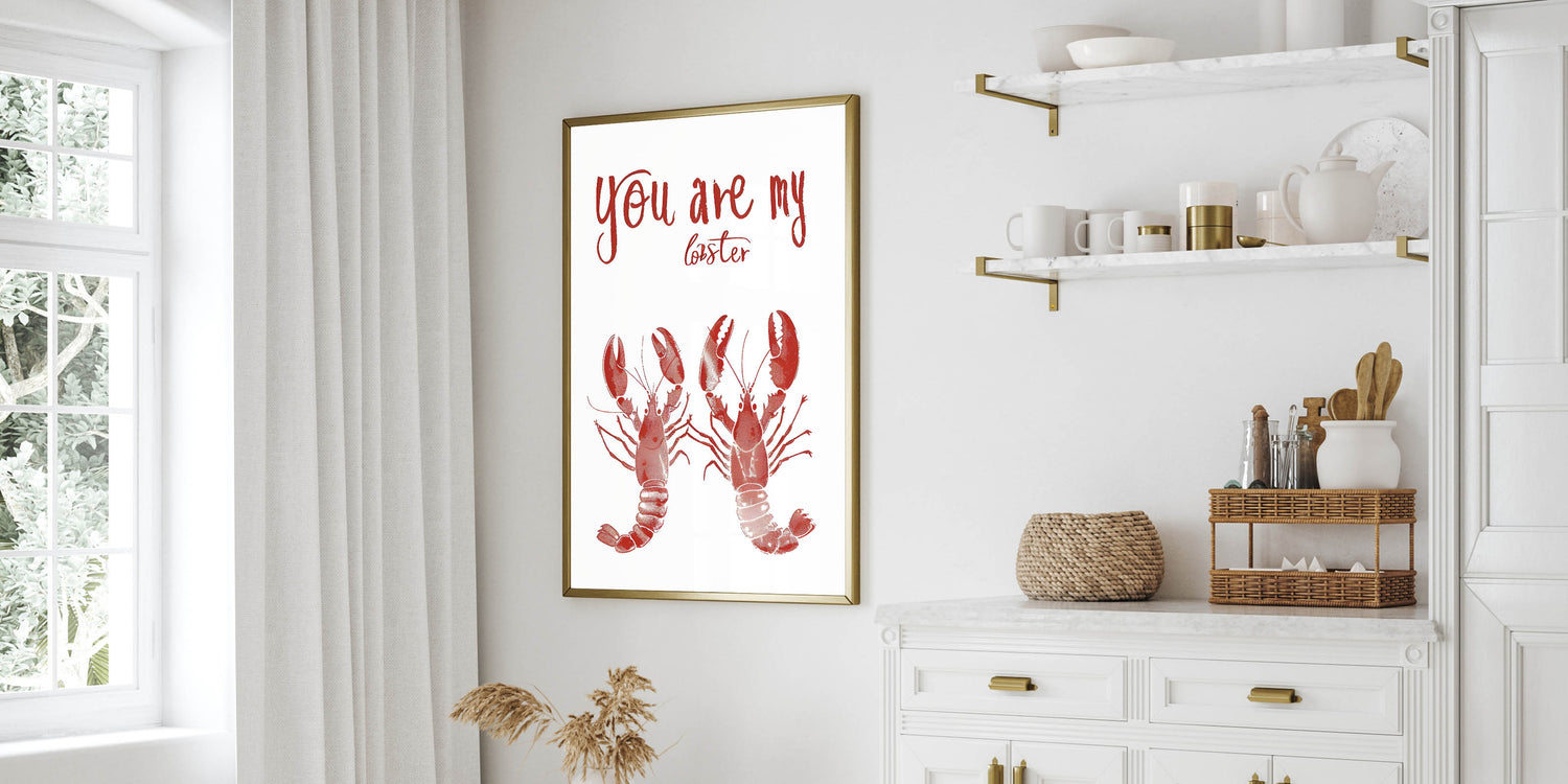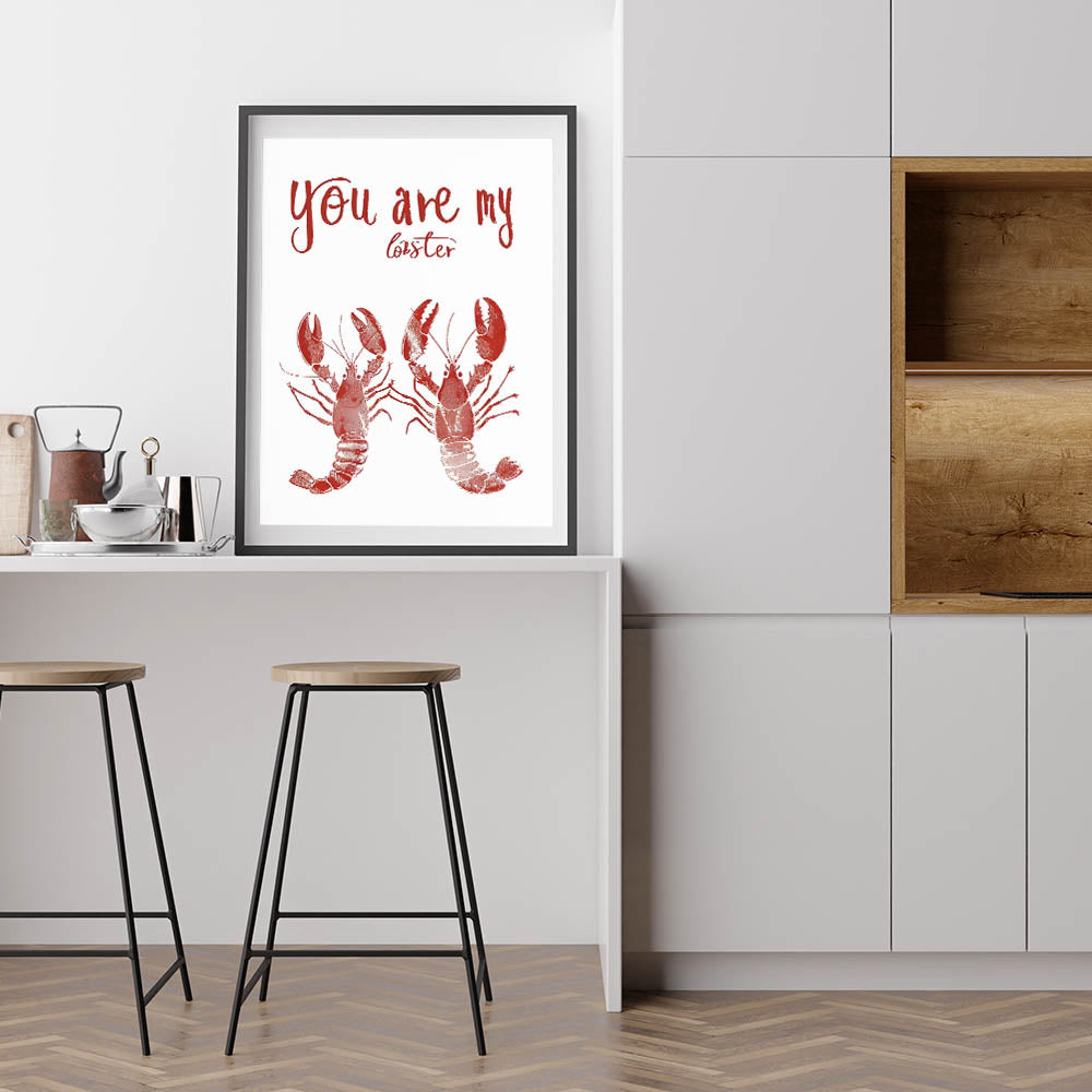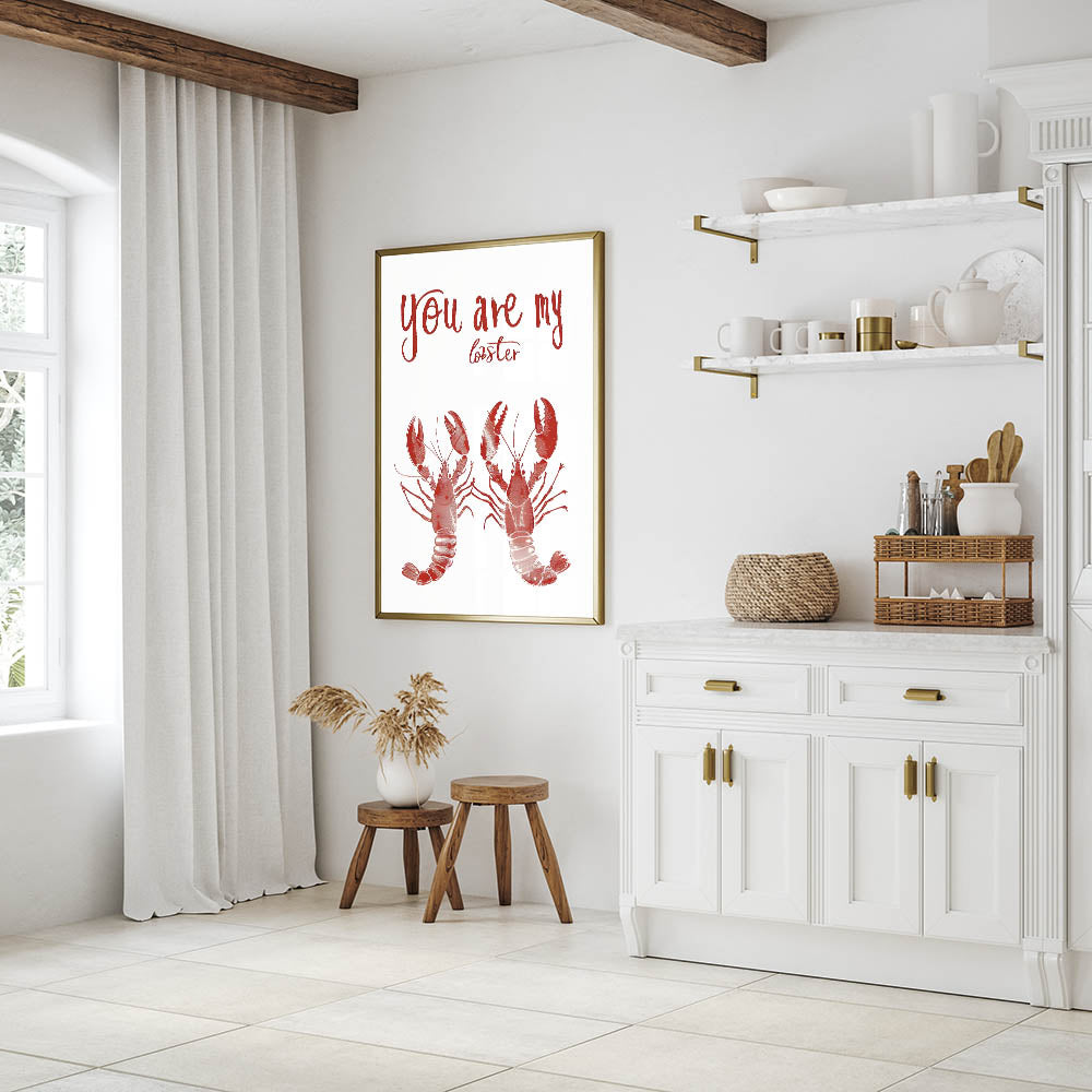 Add a playful and romantic touch to your space with this Kitchen Wall Art with Quotes featuring the charming phrase "You Are My Lobster." This Inspirational Kitchen Wall Art is a tribute to love and companionship, making it a perfect piece for couples, seafood lovers, or coastal-themed kitchens. The deep red lobsters and bold handwritten typography give this Motivational Kitchen Art Prints design a stylish and unique look.