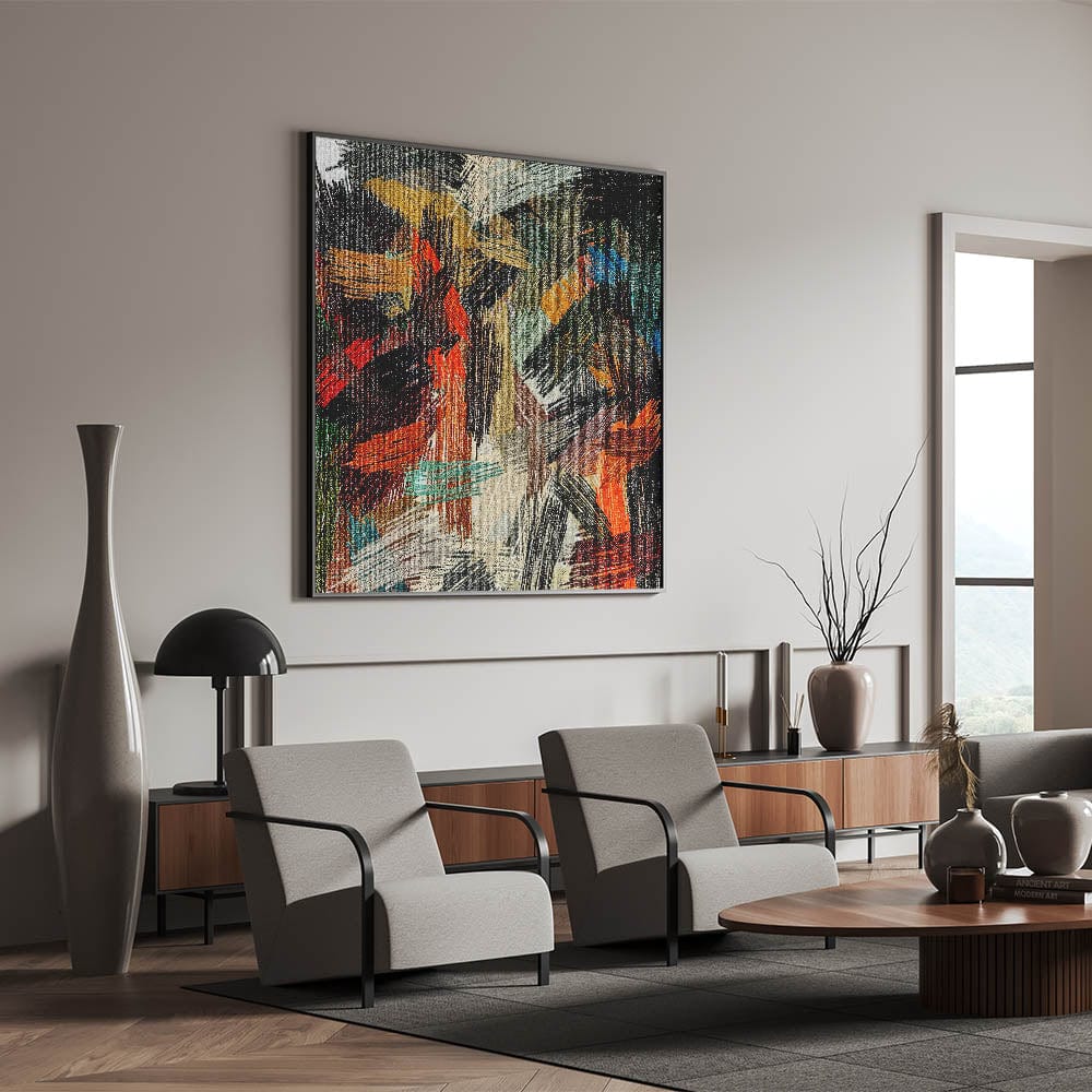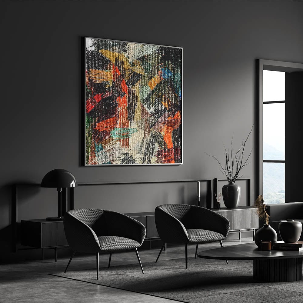 Elevate your space with this moody modern wall art, an expressive blend of red, black, orange, green, and earthy beige tones. The bold brushstrokes and layered textures create an energetic composition, making this abstract wall art a striking focal point. Whether placed in a living room, office, or gallery-style interior, this artwork adds a dynamic and sophisticated touch to your decor.