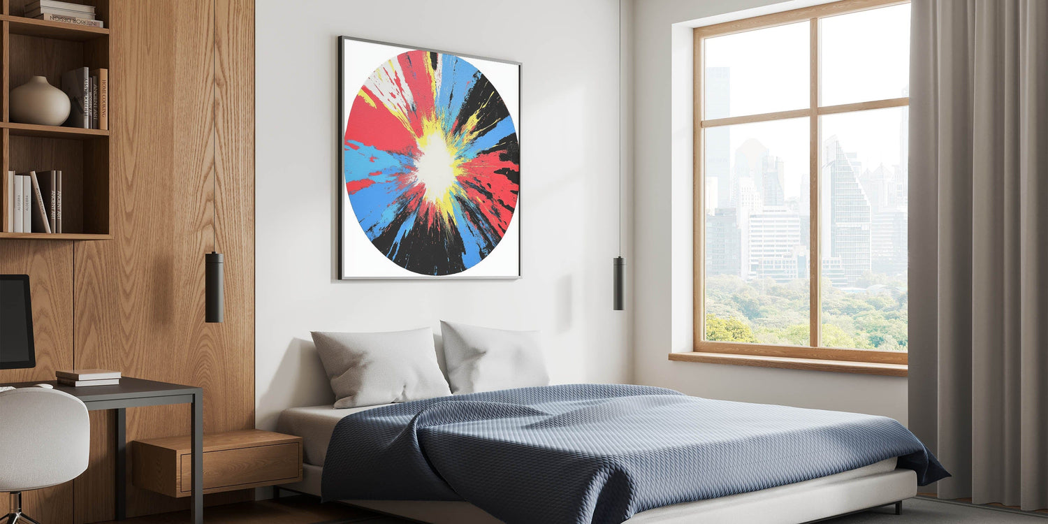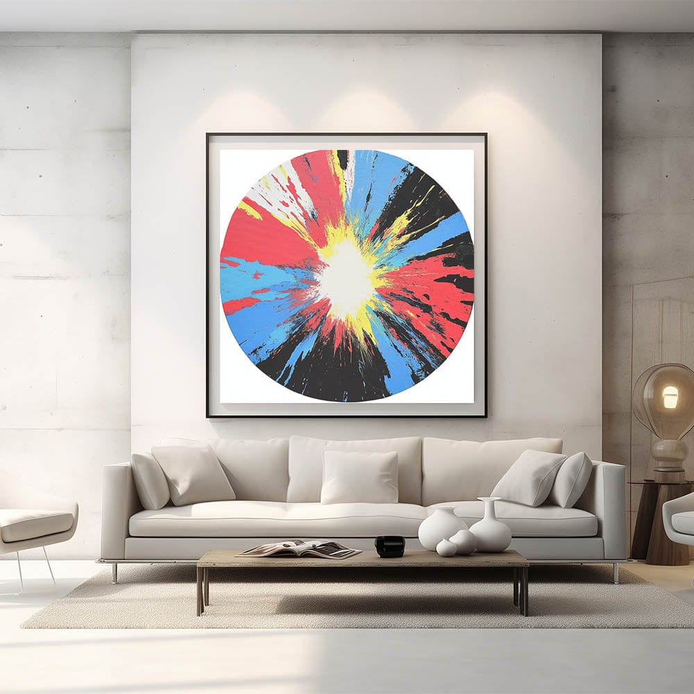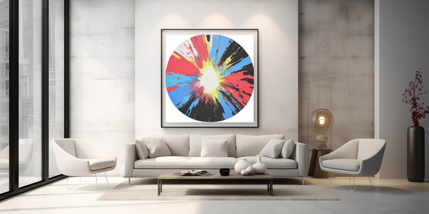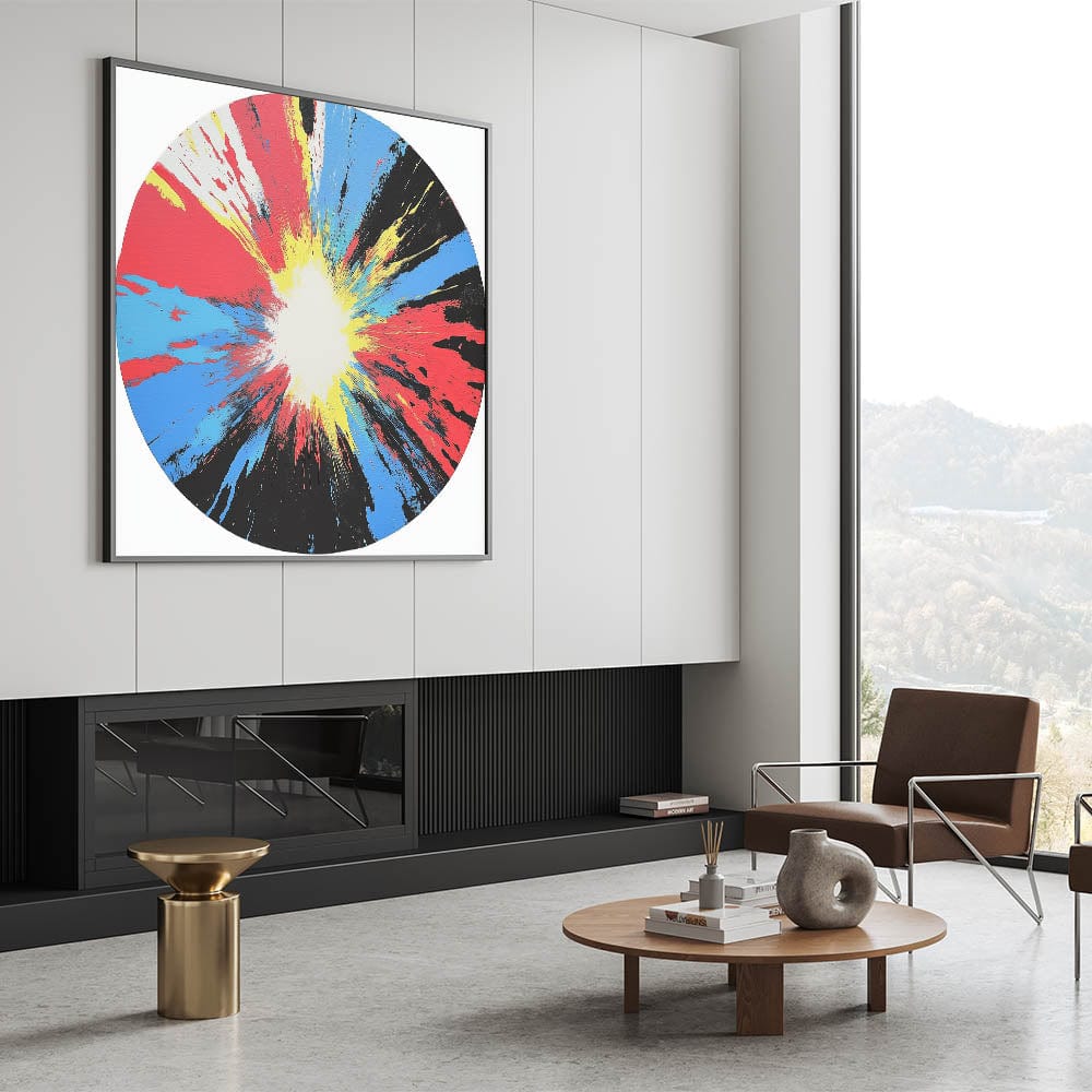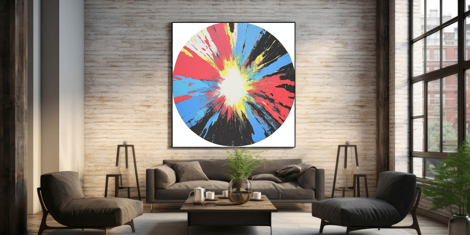 Ignite your space with this large abstract wall art that radiates energy and movement. A bold circular composition explodes from a white center with vivid streaks of red, yellow, blue, and black—creating a stunning centerpiece for any room.