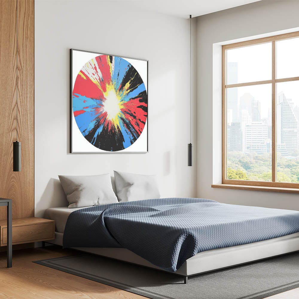 • Features vibrant red, blue, yellow, and black in a radial explosion pattern
