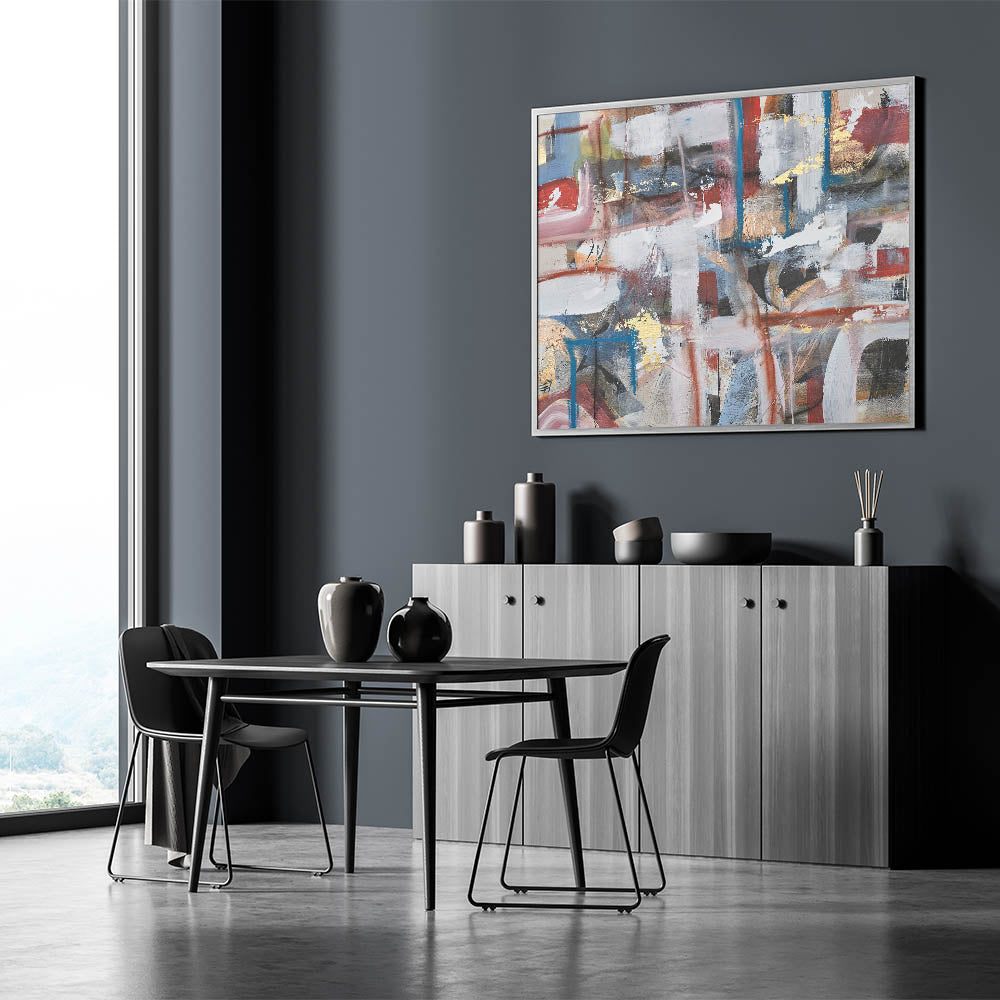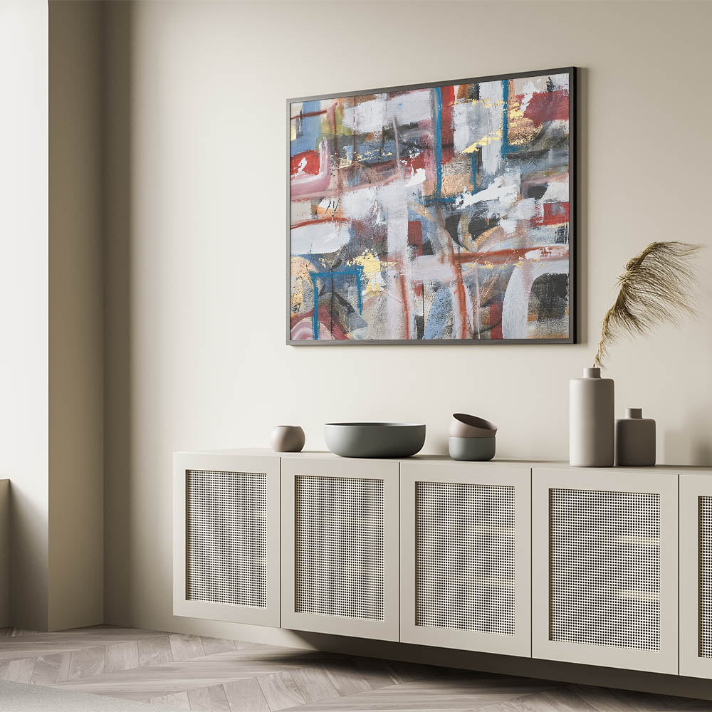 Introduce bold energy and expressive movement into your space with this large modern art piece from the modern abstract art collection. Featuring a dynamic composition of red, blue, gold, and earthy tones, this contemporary wall art design embodies the raw emotion and depth of geometric patterns in modern art. The rich brushstrokes and textured layering create a visually striking statement, perfect for modern interiors.