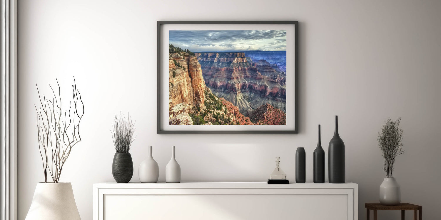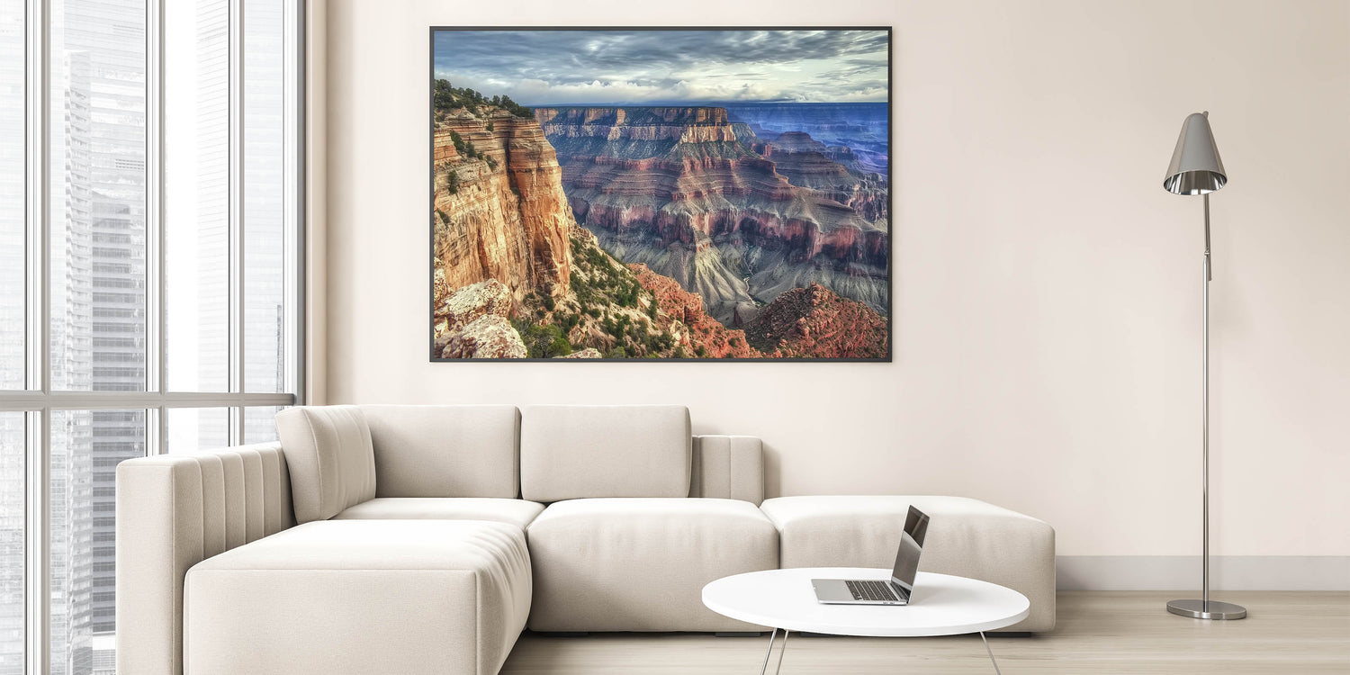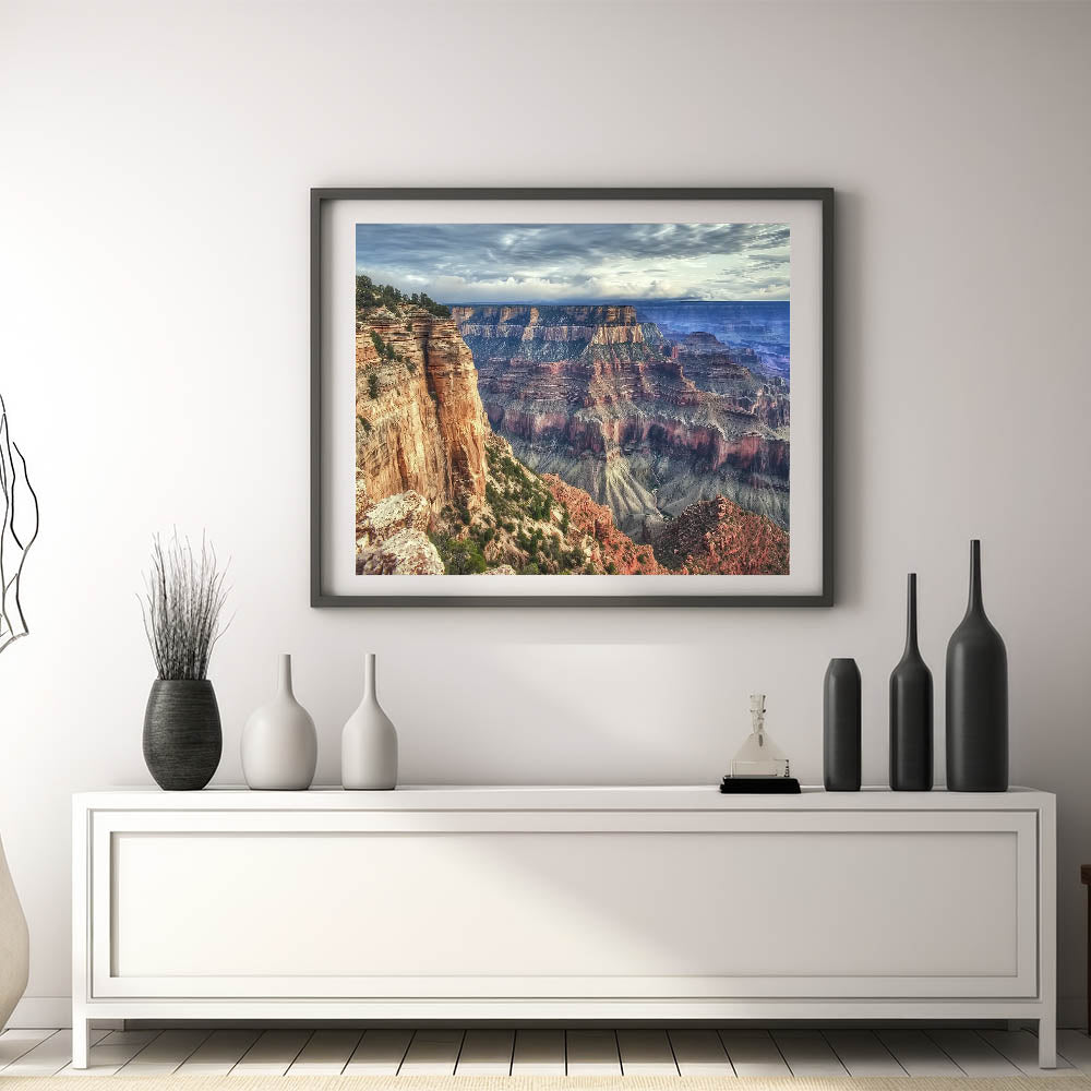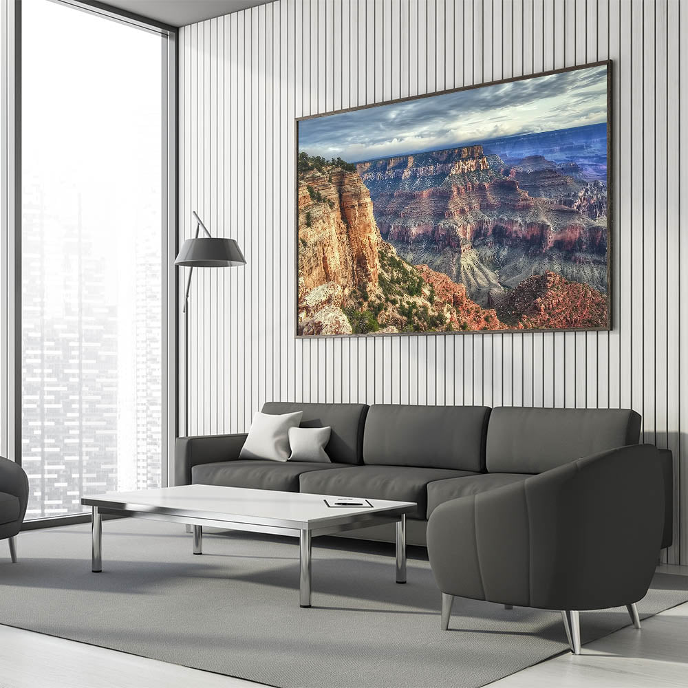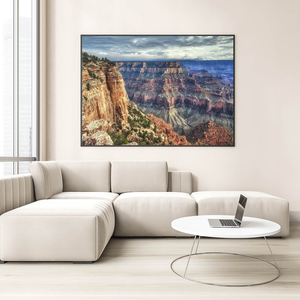 Admire the stunning beauty of this layered canyon view wall art, showcasing intricate rock formations and vibrant hues under a moody sky. The sweeping view highlights the grandeur of nature with detailed textures and layers of red, orange, and earthy tones, creating a breathtaking masterpiece for your home or office. Perfect for nature lovers and art enthusiasts, this artwork celebrates the timeless majesty of canyon landscapes.