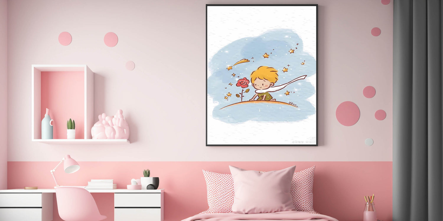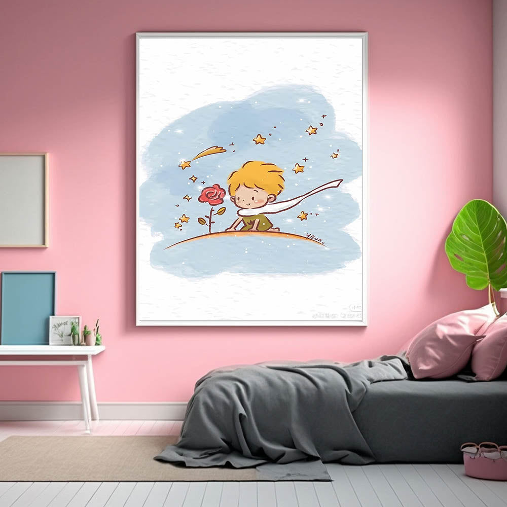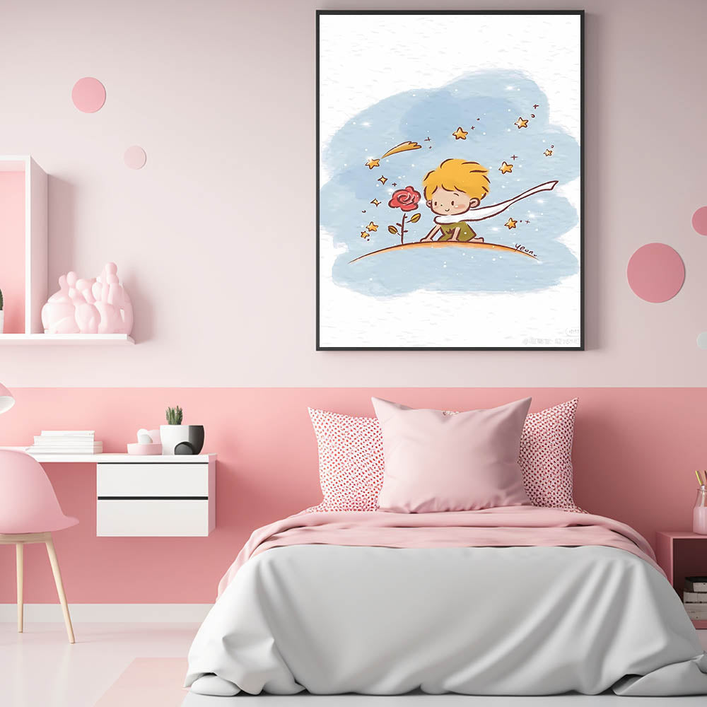 Capture the magic of childhood imagination with this Little Prince-inspired wall art. Featuring a whimsical scene of a young prince admiring his beloved rose under a sparkling sky, this dreamy illustration is perfect for a girls' bedroom, nursery, or playroom. The soft watercolor strokes and delicate stars create a calm, enchanting atmosphere, making it a wonderful choice for children who love fairy tales and adventure.