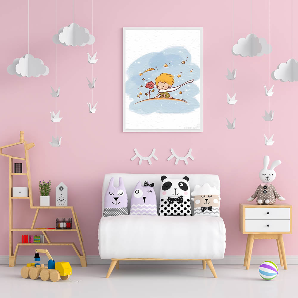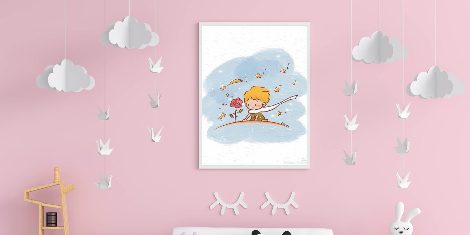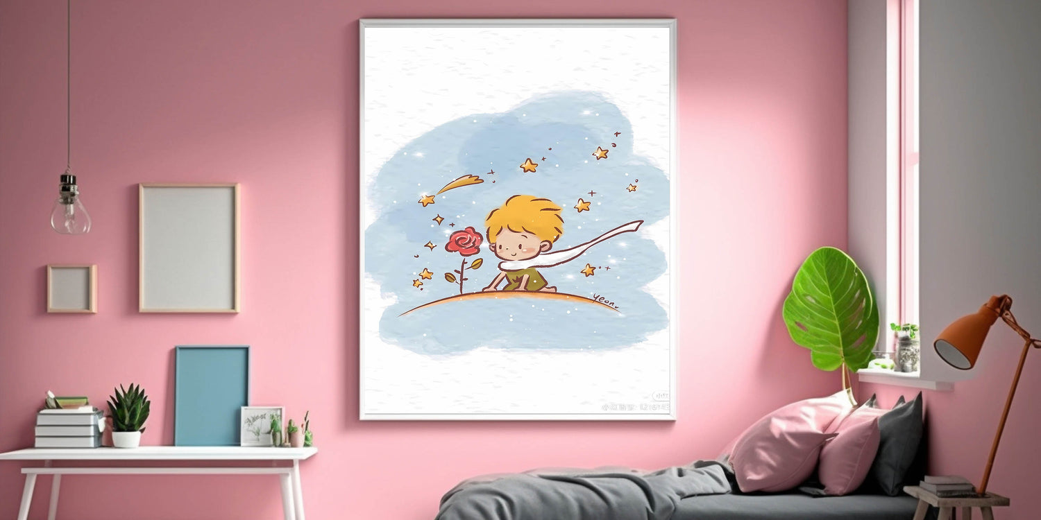 Capture the magic of childhood imagination with this Little Prince-inspired wall art. Featuring a whimsical scene of a young prince admiring his beloved rose under a sparkling sky, this dreamy illustration is perfect for a girls' bedroom, nursery, or playroom. The soft watercolor strokes and delicate stars create a calm, enchanting atmosphere, making it a wonderful choice for children who love fairy tales and adventure.