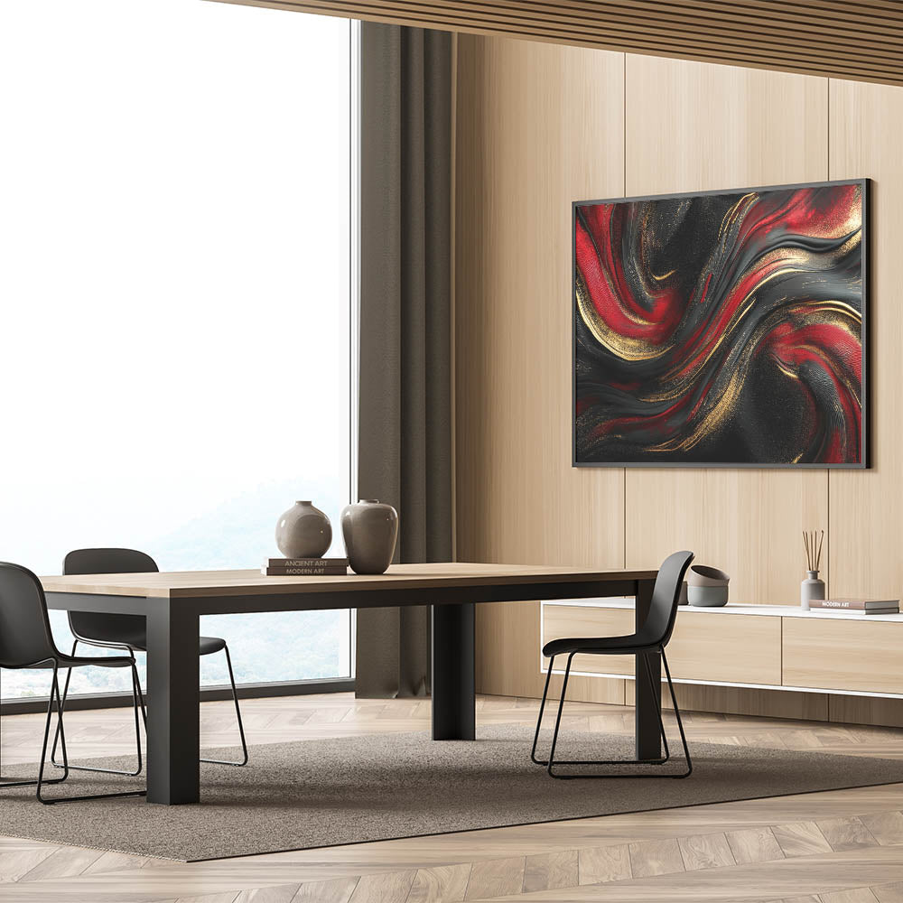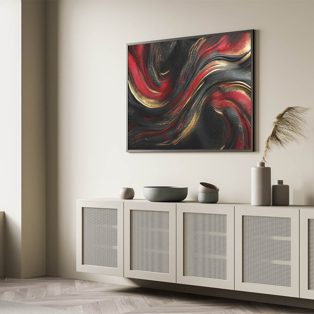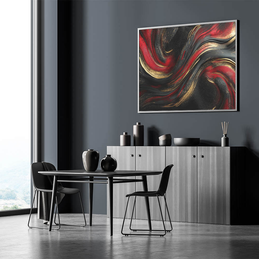 Add a dramatic flair to your space with this luxury abstract wall art collection piece, featuring a bold fusion of deep black, rich red, and shimmering gold. This high-quality abstract canvas print exudes power and passion, making it an exclusive abstract design for modern spaces. The striking contrast of fiery red against sleek black creates a visually captivating masterpiece, perfect for contemporary and upscale interiors.