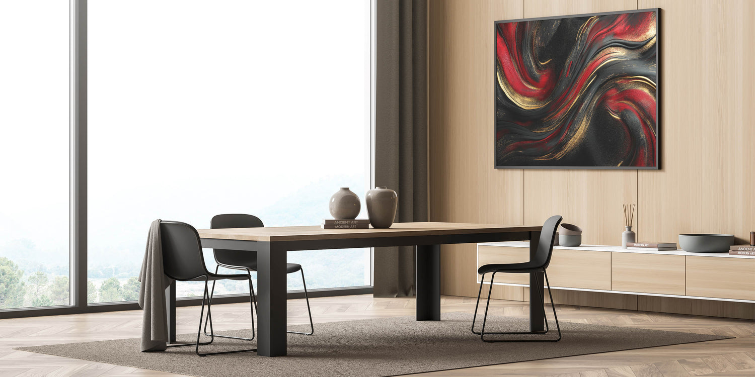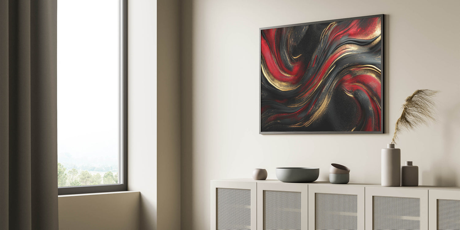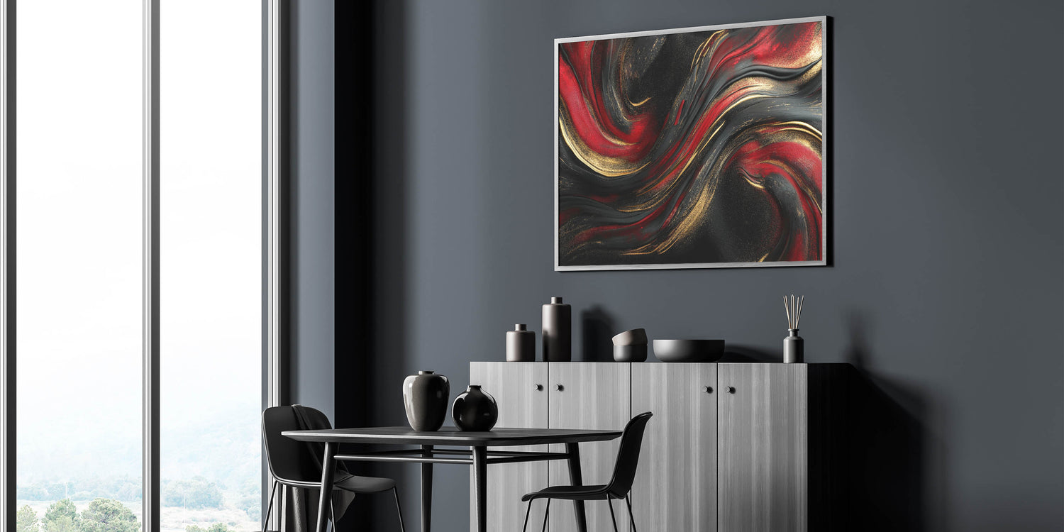 Add a dramatic flair to your space with this luxury abstract wall art collection piece, featuring a bold fusion of deep black, rich red, and shimmering gold. This high-quality abstract canvas print exudes power and passion, making it an exclusive abstract design for modern spaces. The striking contrast of fiery red against sleek black creates a visually captivating masterpiece, perfect for contemporary and upscale interiors.