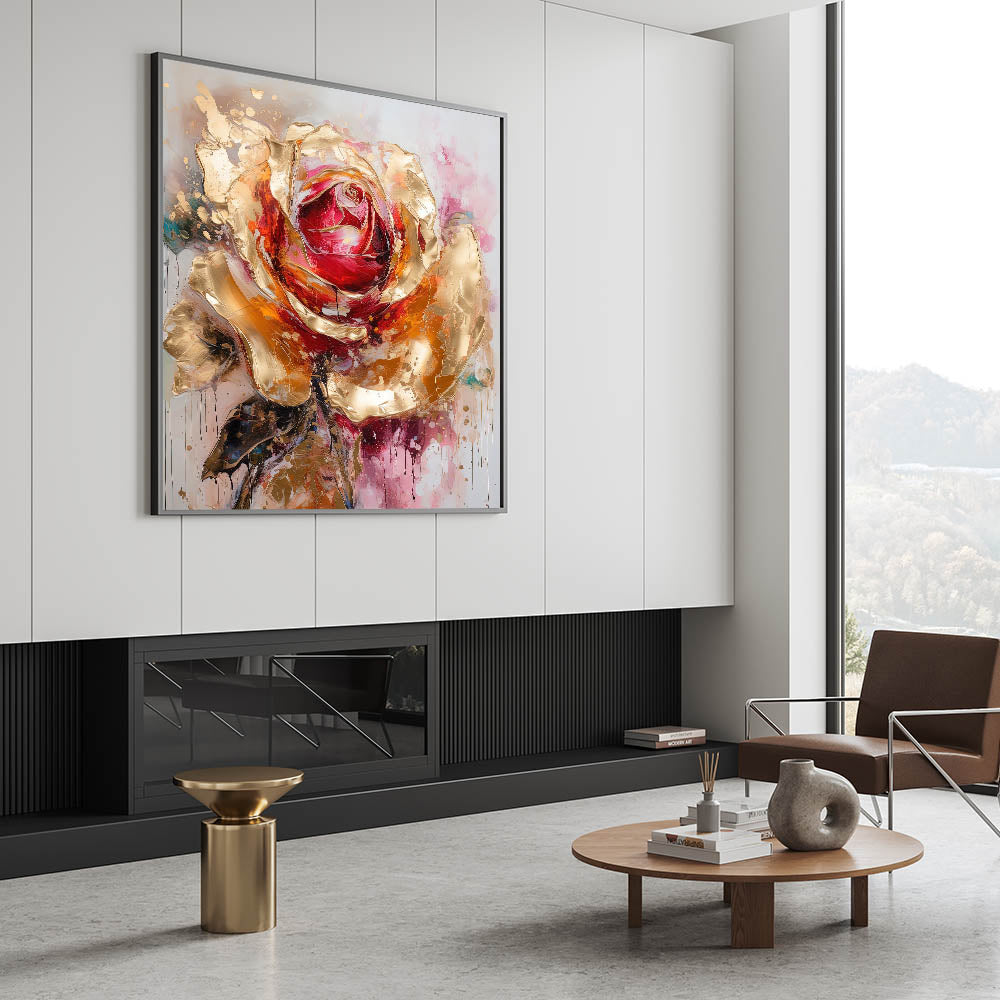 Add a bold and luxurious statement to your space with this gold and red rose wall art, featuring a stunning metallic gold finish and vibrant red hues. The expressive brushstrokes and splashes of deep red, orange, and pink create a visually captivating piece, perfect for modern living room decor. This artwork blends floral elegance with abstract art, making it a unique and eye-catching centerpiece.