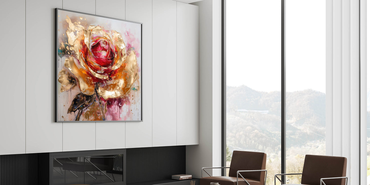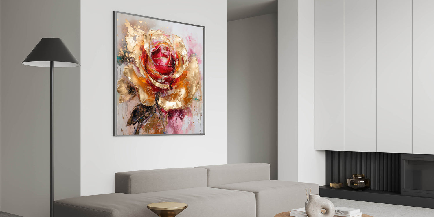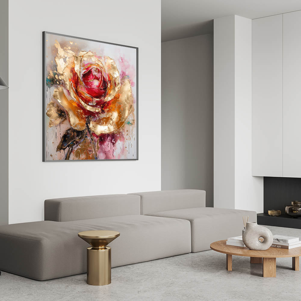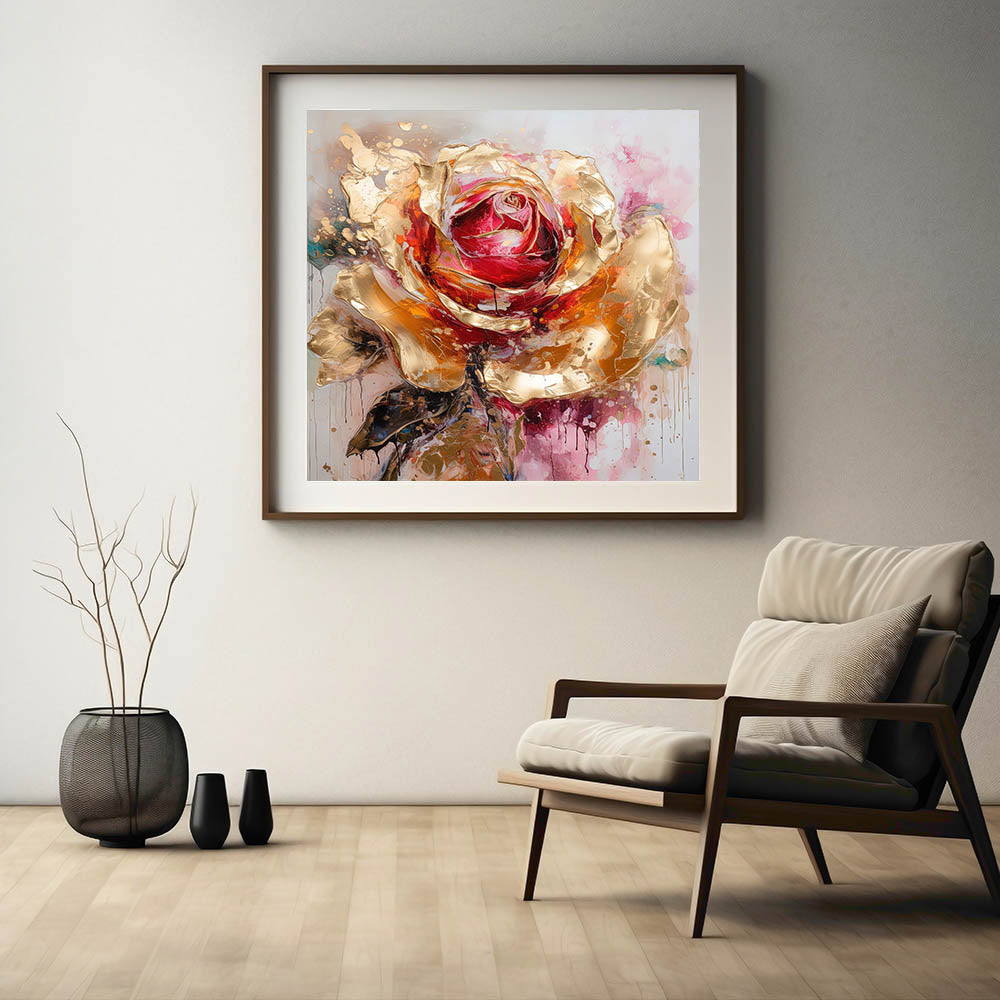 This contemporary art print embodies passion, elegance, and artistic expression, making it a perfect choice for living room wall art decor. Whether displayed as large wall art or a framed accent, this golden rose piece transforms any space into a gallery of bold beauty.