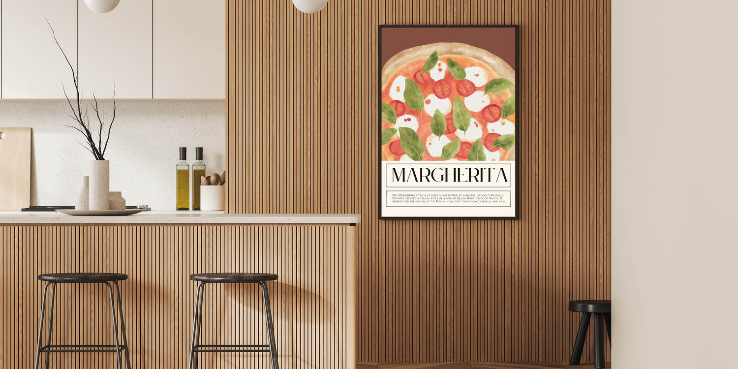 Celebrate the simplicity and tradition of Italian cuisine with this Margherita pizza wall art. This kitchen wall art beautifully illustrates a classic Margherita pizza, showcasing fresh basil, juicy tomatoes, and creamy mozzarella in a charming watercolor design. Inspired by the colors of the Italian flag, this culinary wall art brings warmth and authenticity to any kitchen, dining room, or pizzeria.