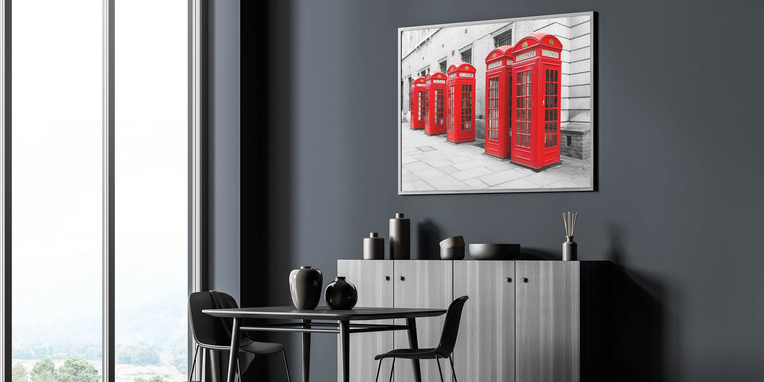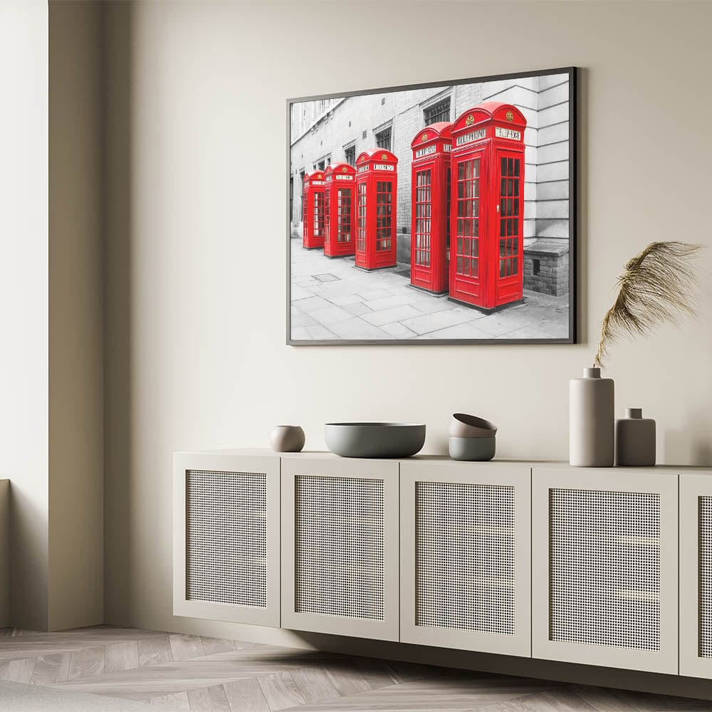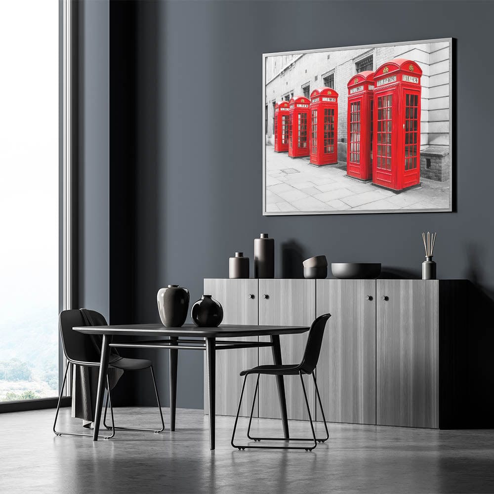 Capture the timeless charm of London with this striking metropolitan photography art print, featuring the city’s iconic red telephone booths. Set against a grayscale urban background, the vibrant red color of the booths pops beautifully, making this artwork a bold and stylish statement piece for any decor.