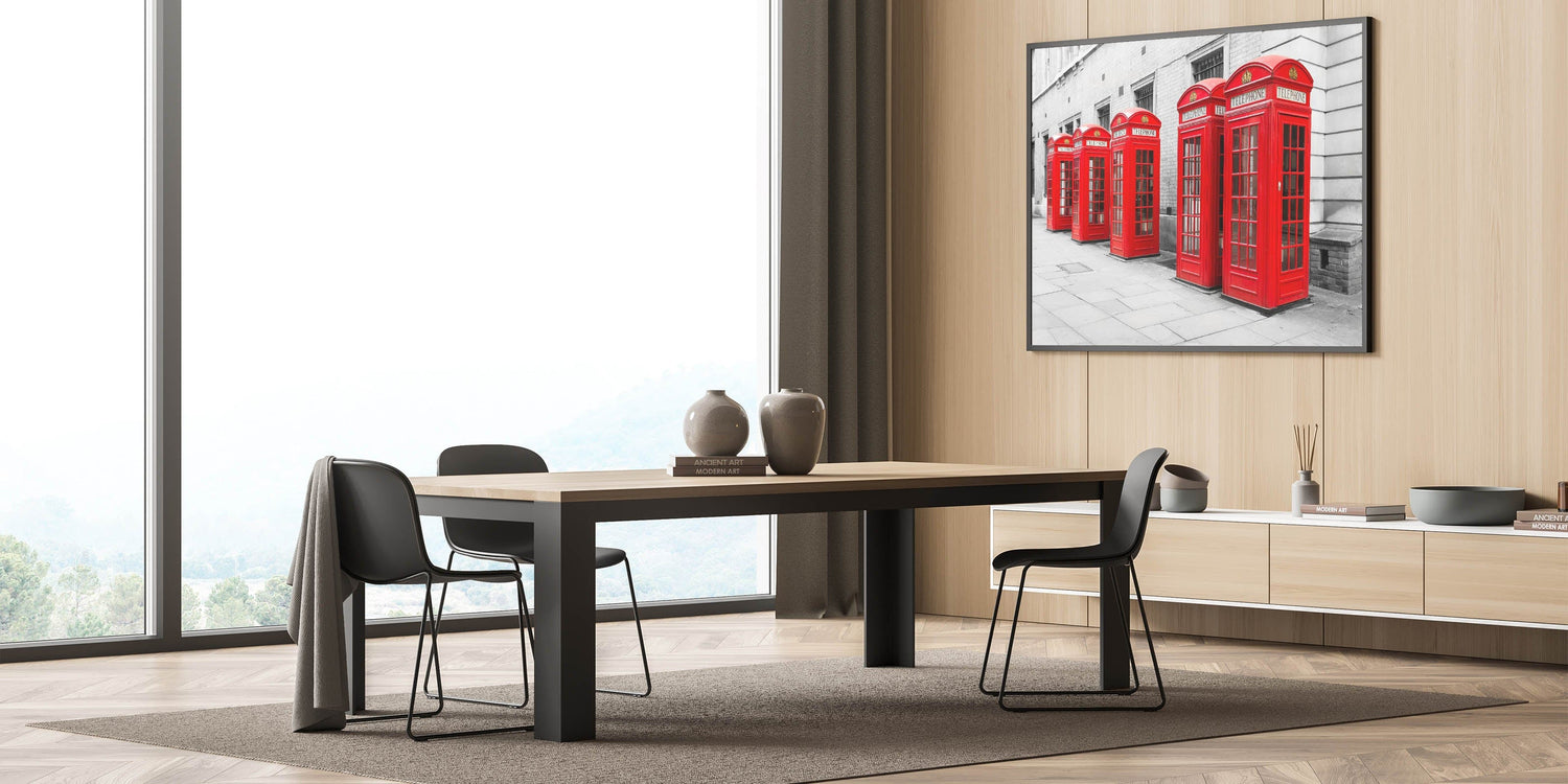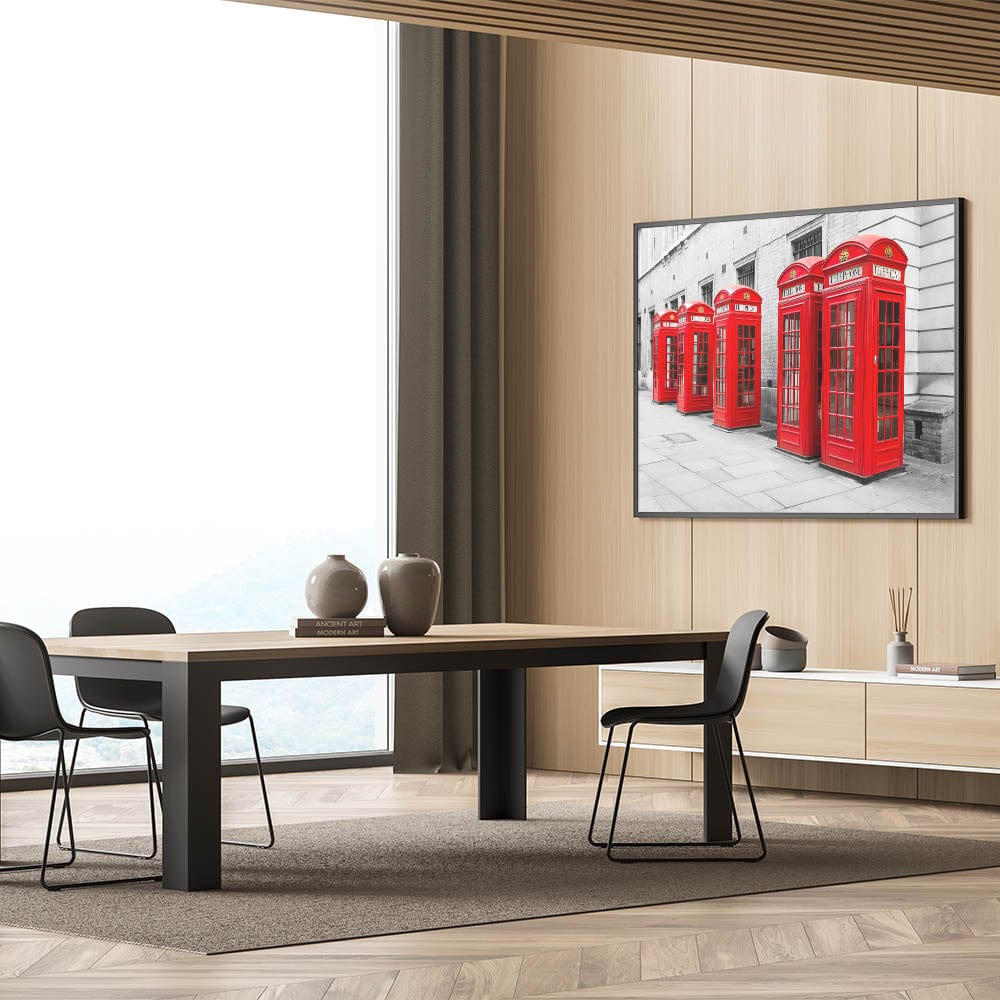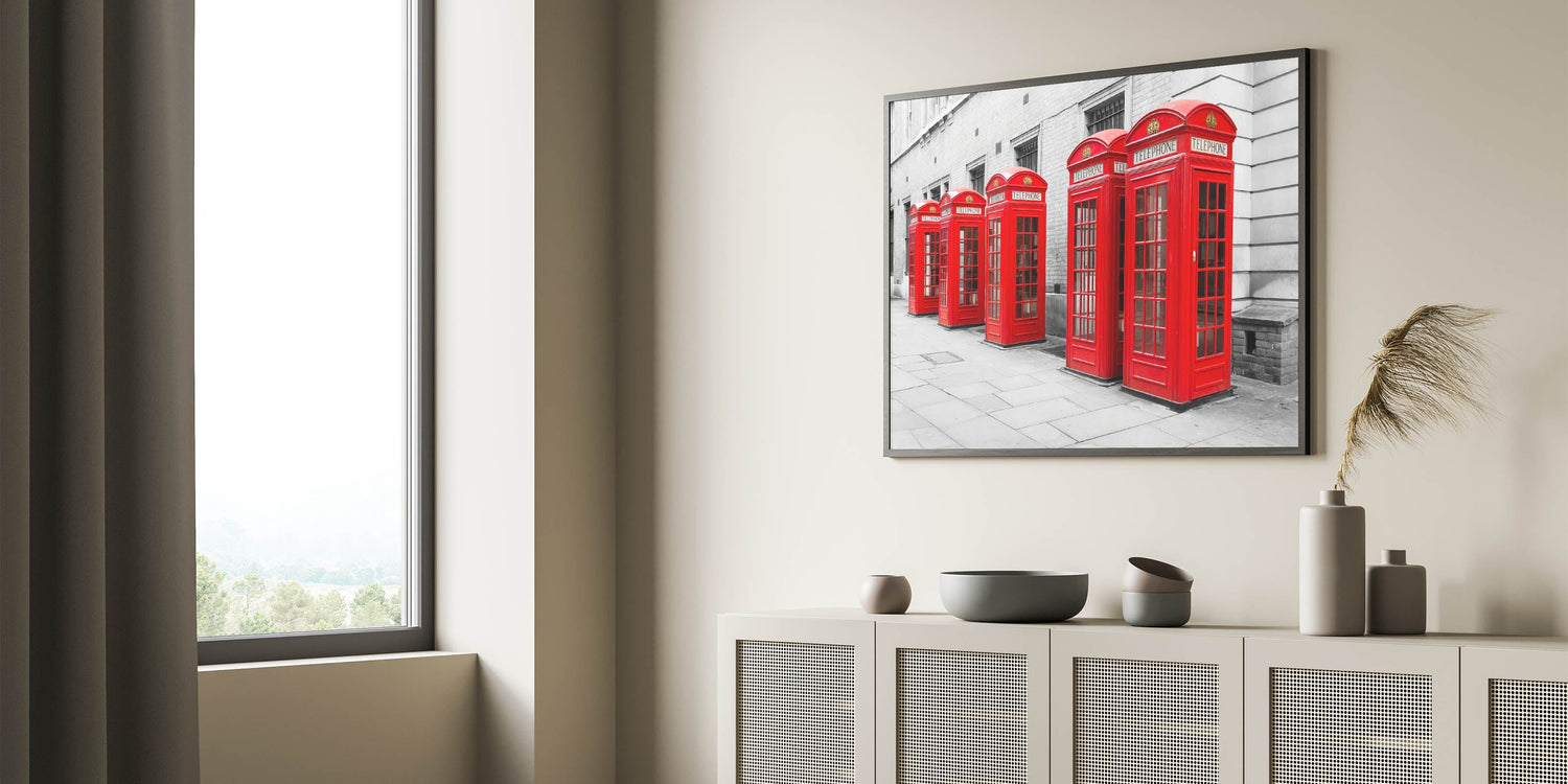 Capture the timeless charm of London with this striking metropolitan photography art print, featuring the city’s iconic red telephone booths. Set against a grayscale urban background, the vibrant red color of the booths pops beautifully, making this artwork a bold and stylish statement piece for any decor.