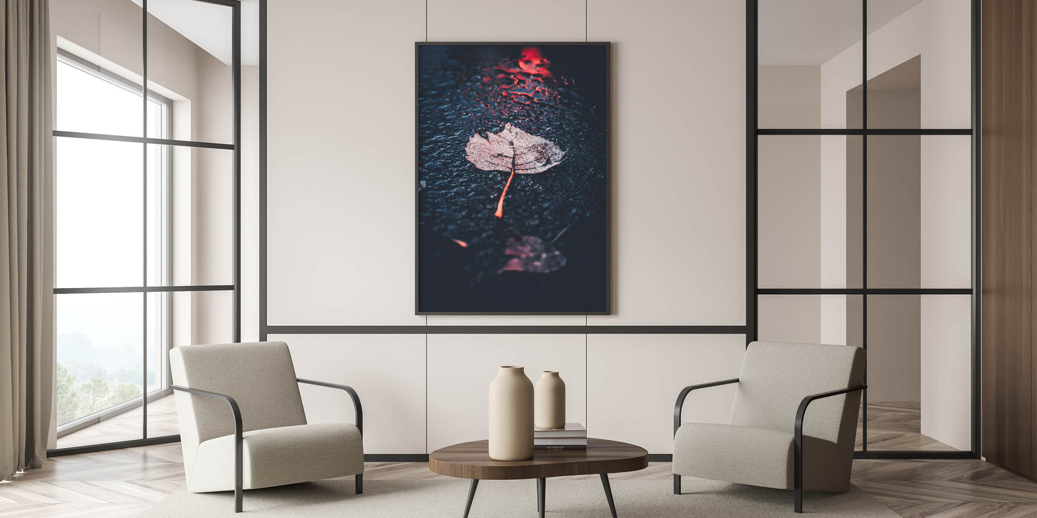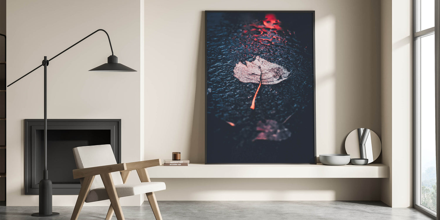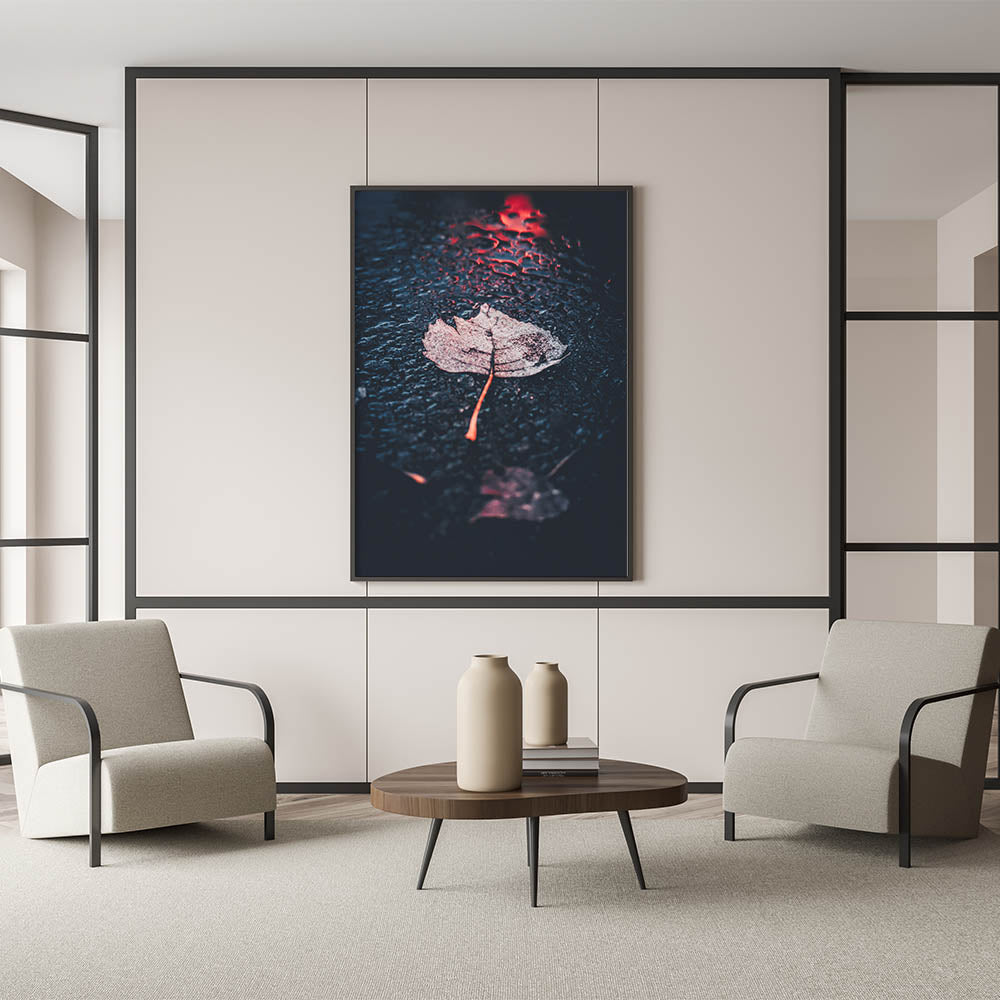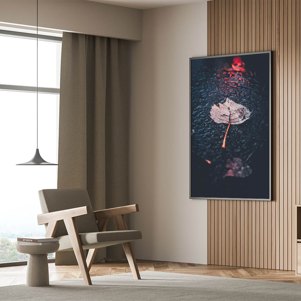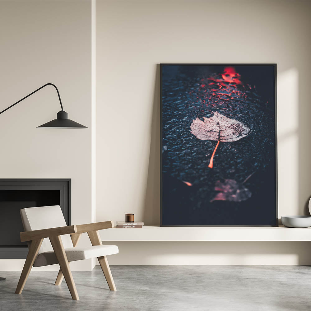 Capture the quiet beauty of autumn with this moody fall wall art, featuring a single fallen leaf resting on a rain-kissed surface. The deep shades of dark blue and red create a mesmerizing contrast, bringing a sense of mystery and seasonal charm to any space. The wet ground glistens with soft reflections, adding depth and texture to this autumn canvas art, making it a perfect choice for those who appreciate artistic photography.
