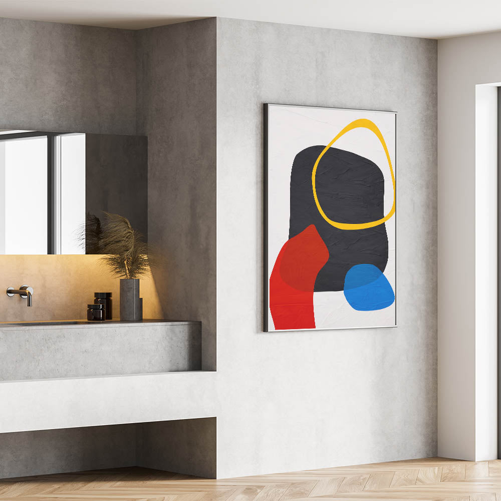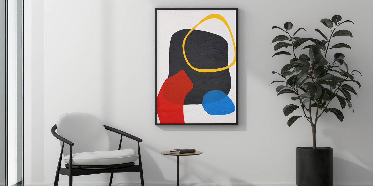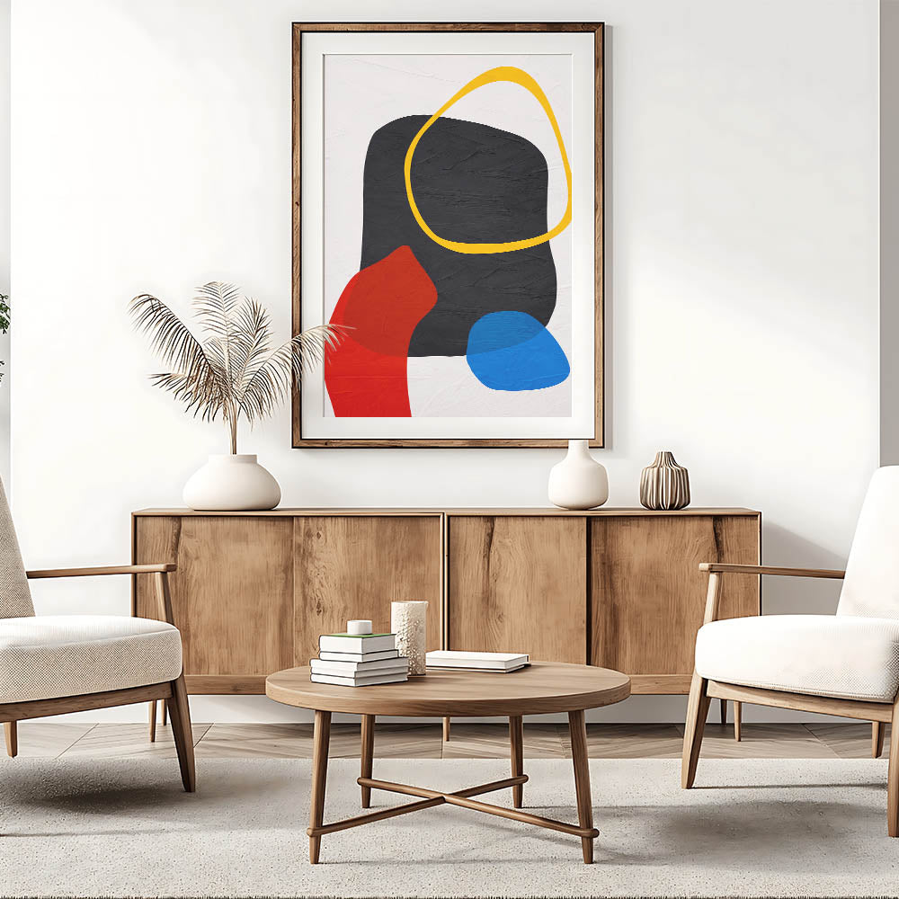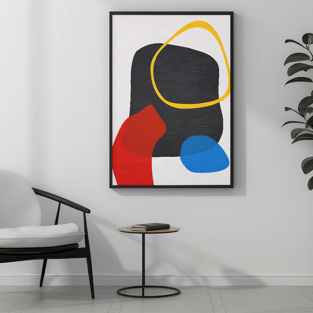 Add a bold and energetic touch to your space with this modern art print, featuring a striking geometric composition of black, red, blue, yellow, and white. The combination of fluid organic forms and structured color blocks creates a visually captivating contrast, making this contemporary canvas print a statement piece for any modern interior. Whether you're looking to brighten up your living room, office, or creative space, this geometric abstract painting brings dynamic energy and sophistication.