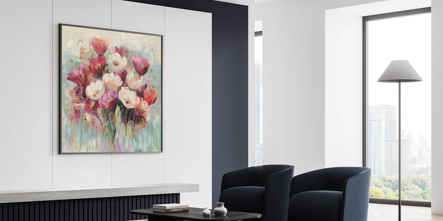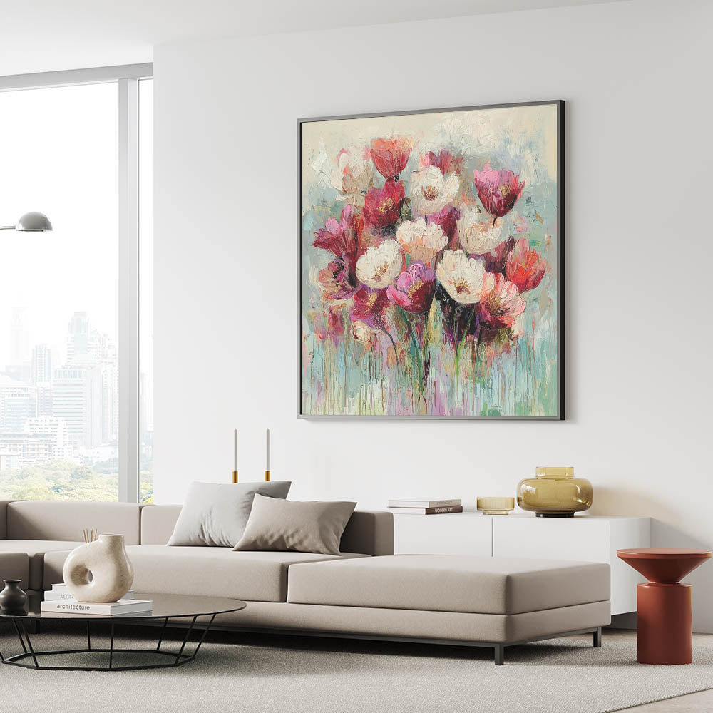 Transform your living space with this vibrant abstract floral artwork. Bursting with an array of soft creams, deep burgundies, and blush pinks, this design captures the delicate beauty of blooming flowers in an artistic and contemporary style. The expressive brushstrokes and splashes of color blend seamlessly, evoking a sense of nature's charm while maintaining a modern aesthetic.
